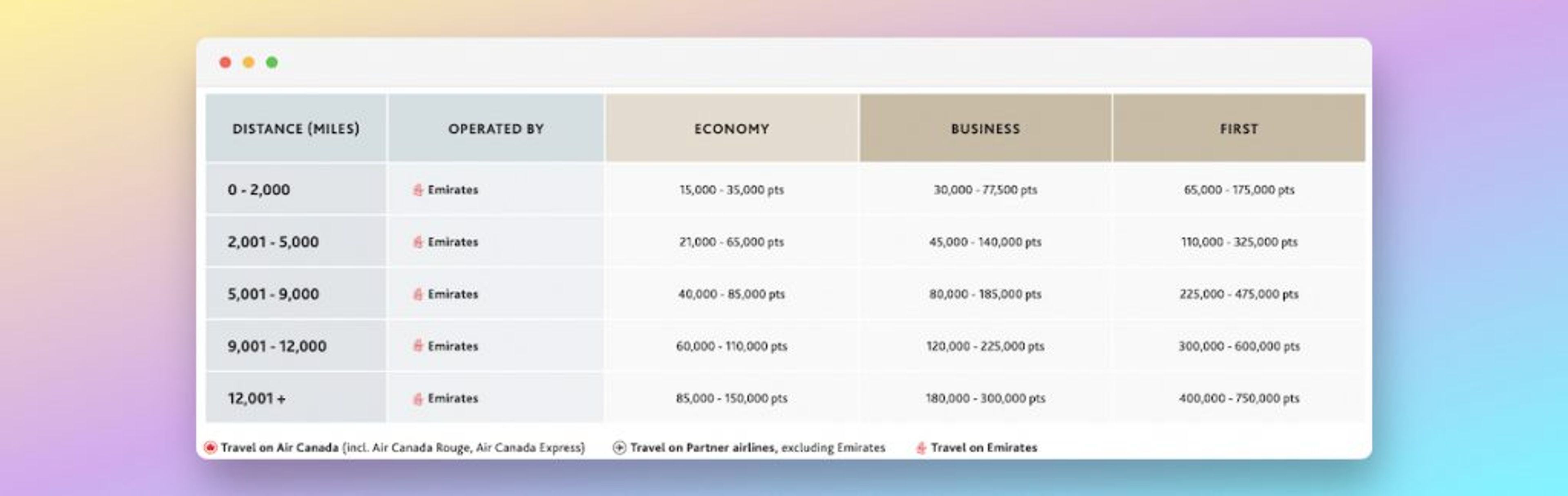 Aeroplan’s Emirates Flight Reward Chart