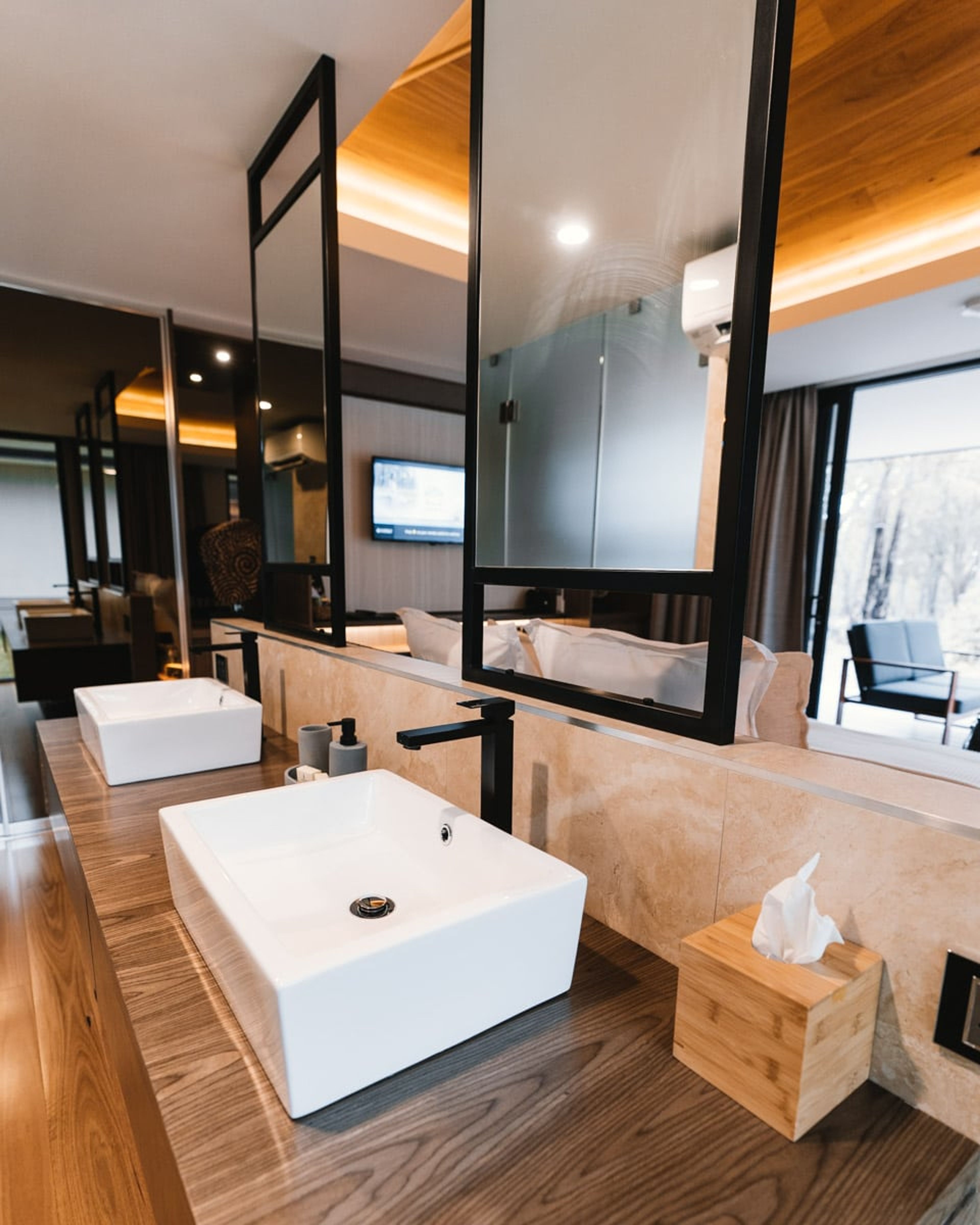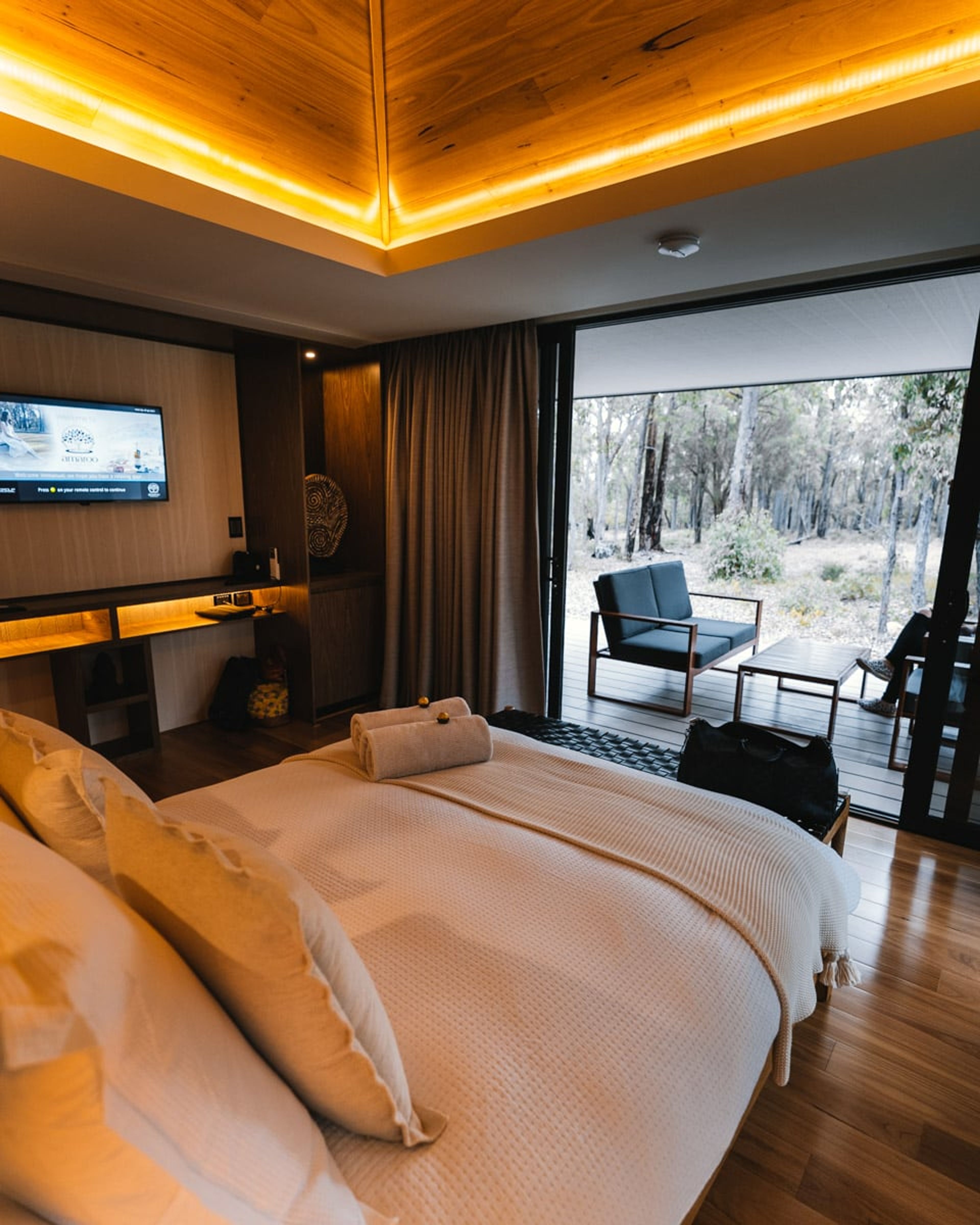 A comfortable bed gives guests vantage views over the bushland outside and thanks to the positioning of the chalets, it does feel very private and away from it all.