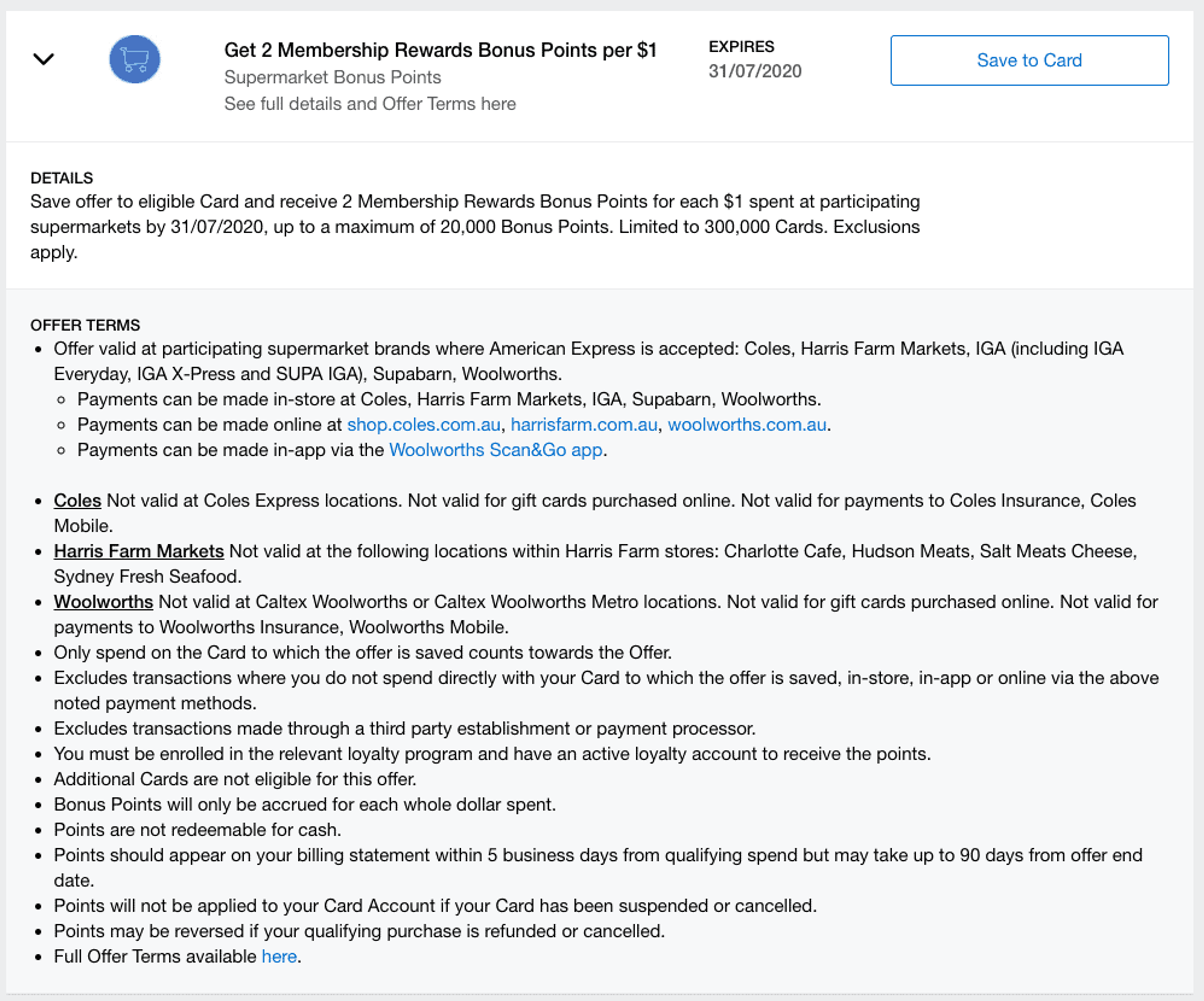 - 2 Bonus Points per $1 spent at major supermarkets up to 20,000 Bonus Points