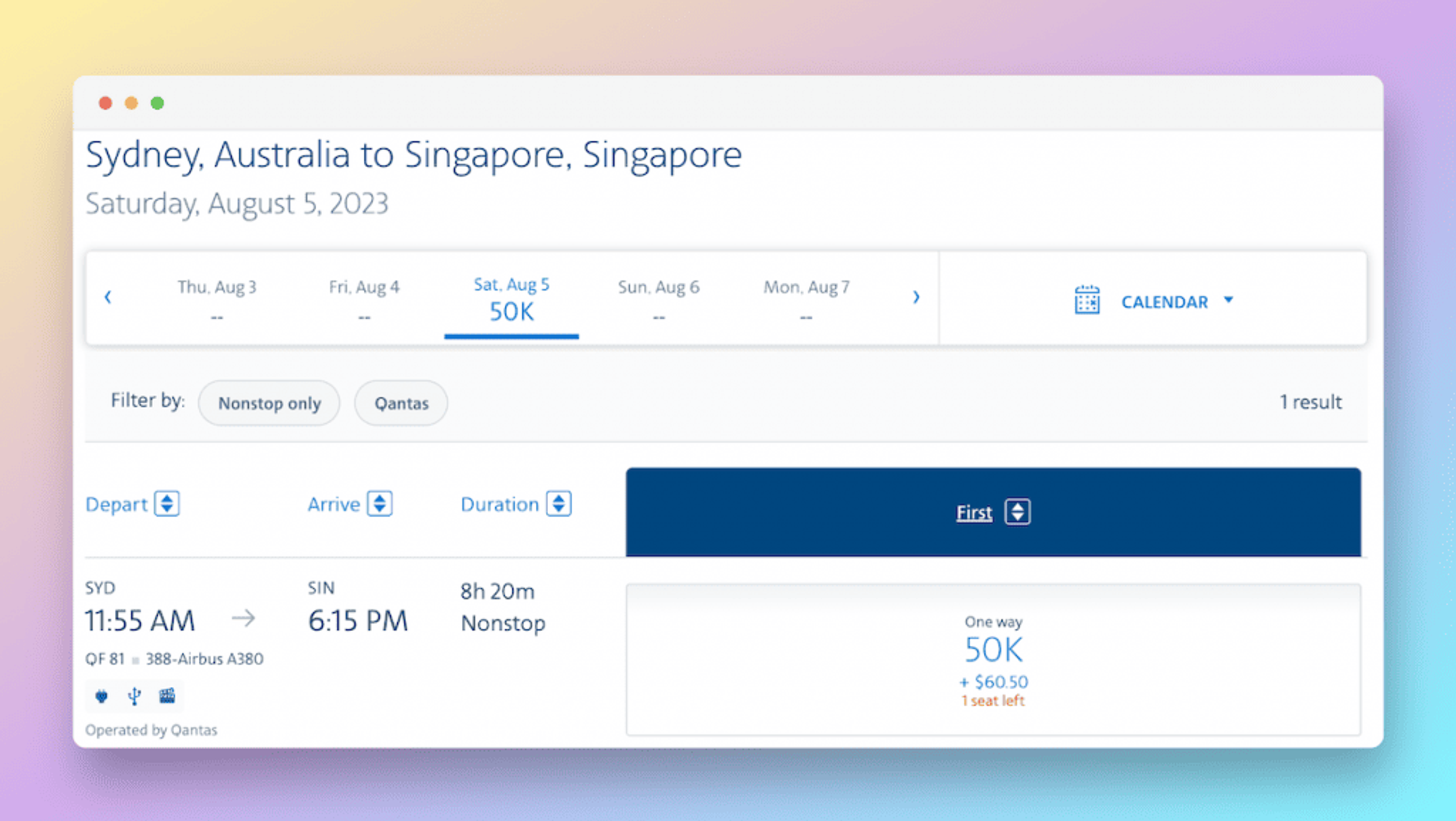 The first redemption that springs to mind is Qantas first class from Sydney to Singapore, which will perfectly require those 50,000 AAdvantage Miles, plus US$60.50 (AU$92) in taxes. Not bad considering it’s a flight that regularly costs over AU$5,000 for a ticket.