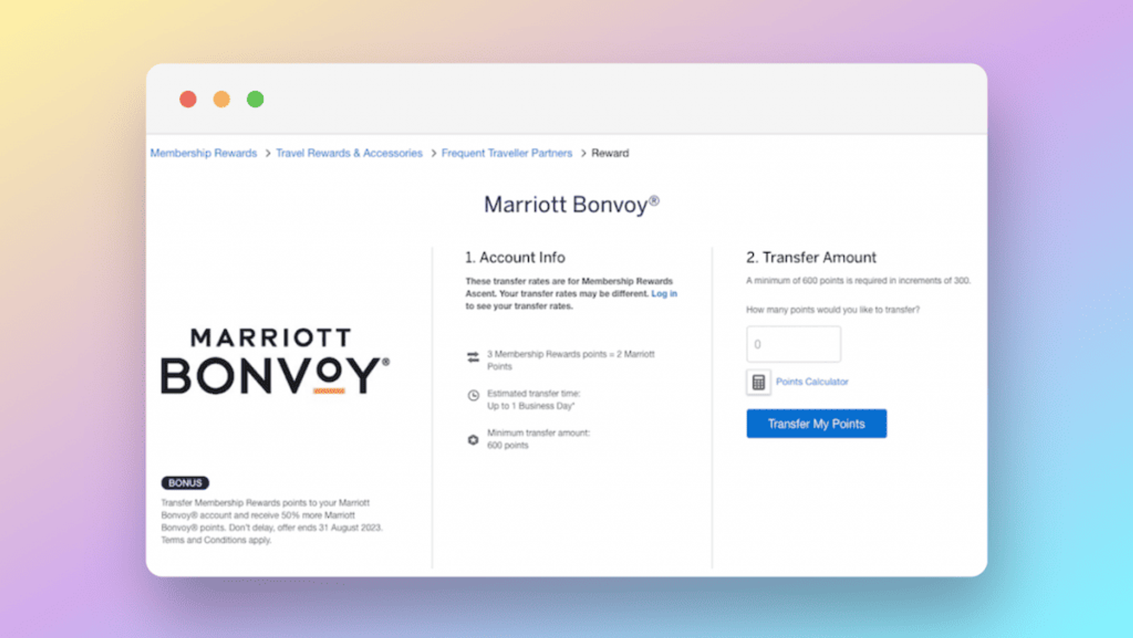 If you are ready for a getaway or have a specific redemption in mind, it could make sense to transfer your points before the bonus ends. Normally, a 3:2 rate applies when transferring MR points to Marriott Bonvoy, but with an extra 50%, the conversion rate is pushed to 3:3. More effectively that’s 1:1, meaning every MR Point is equal to one Mariott Bonvoy Point.