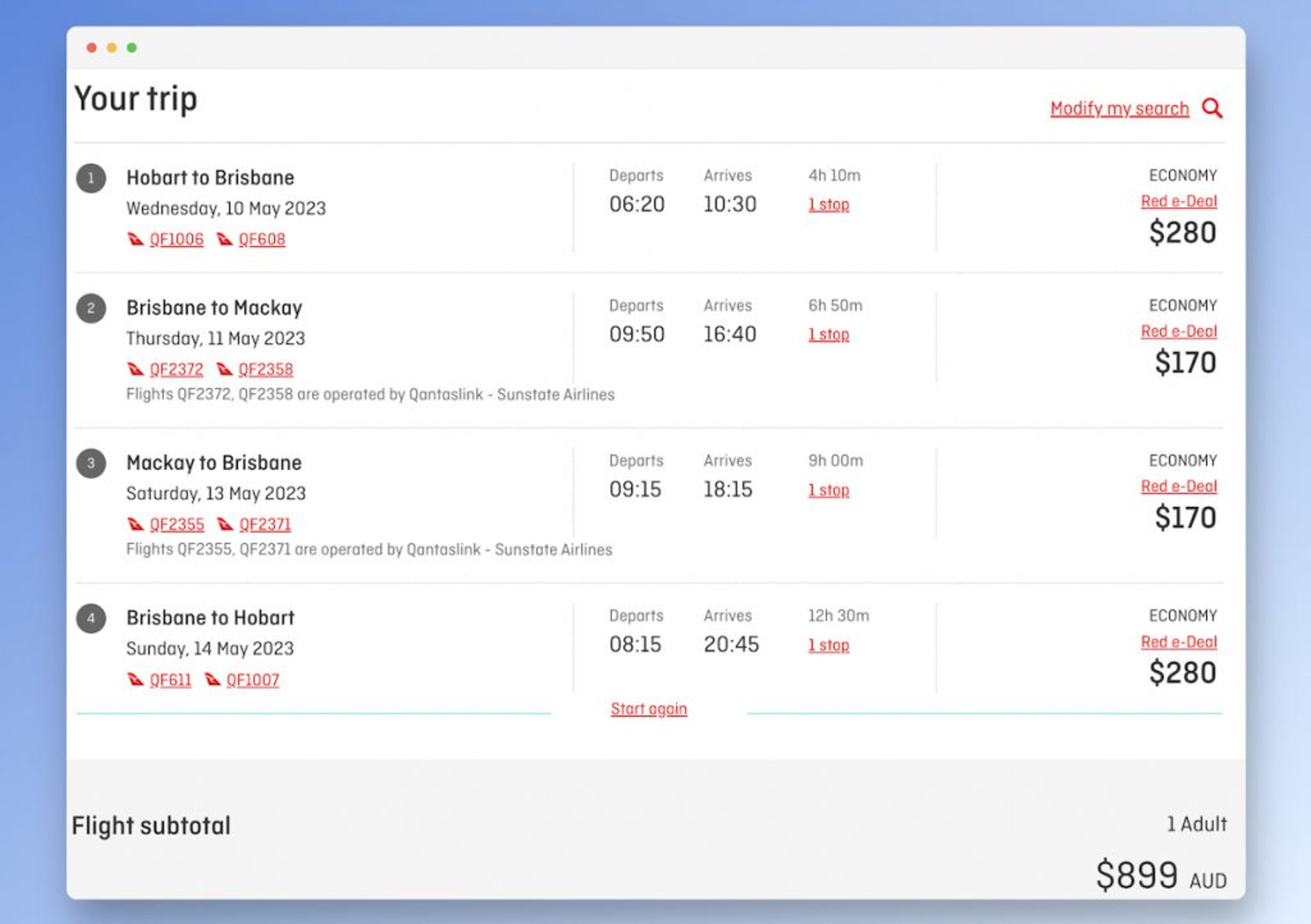 Because status credits are earnt for each individual flight, booking a multi-stop itinerary can help boost your balance. Routes from Tasmania to smaller towns in Queensland can often work well, for example, the insane eight-leg return trip from Hobart to Mackay, stopping in Melbourne, Brisbane and Rockhampton. For the return booking, you would earn 90 status credits for about $899, or 180 when there is a double status credit promotion.