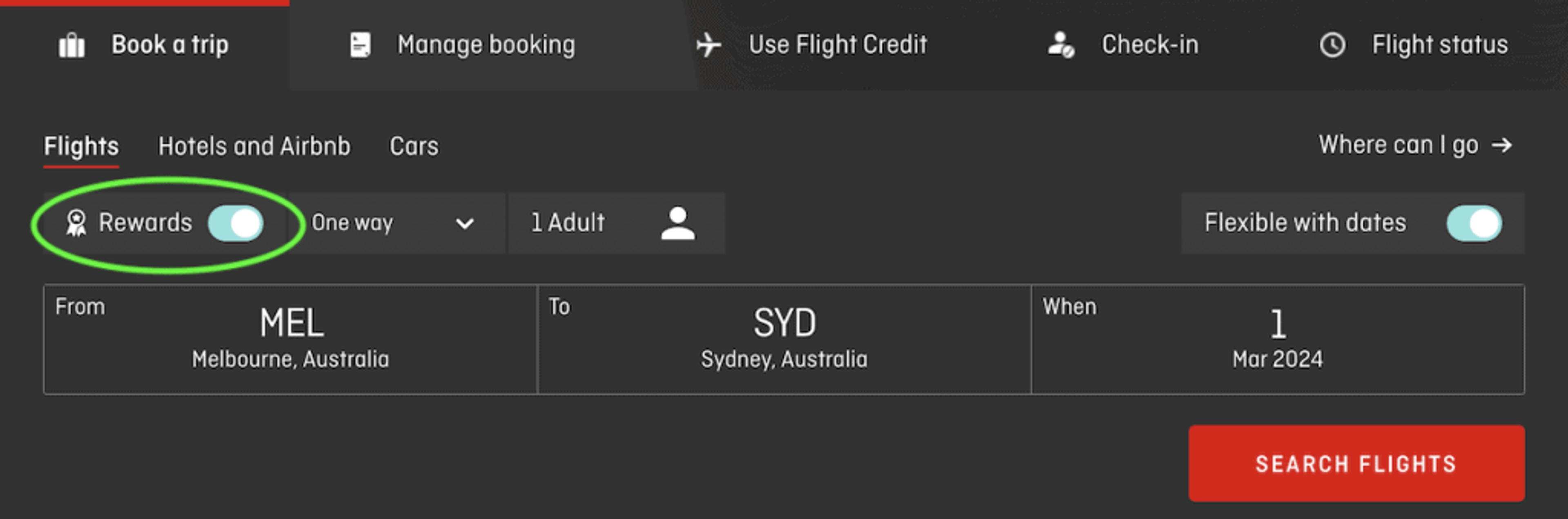 Step 2: Visit the Qantas website, and search for your preferred route and dates, ensuring the ‘Rewards’ is toggle is switched on.