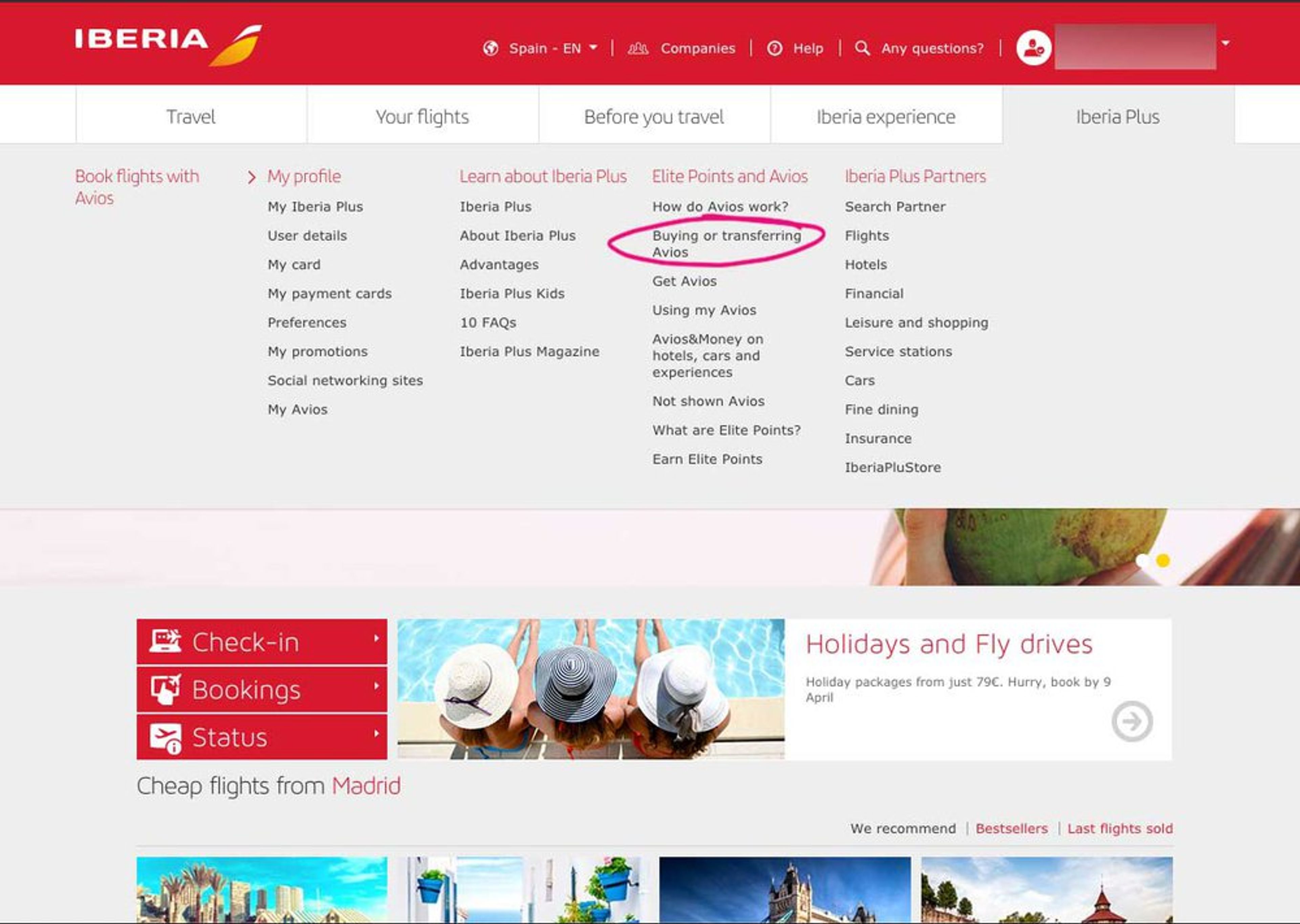 1) Hover over the “Iberia Plus” tab and click “Buying or transferring Avios.”