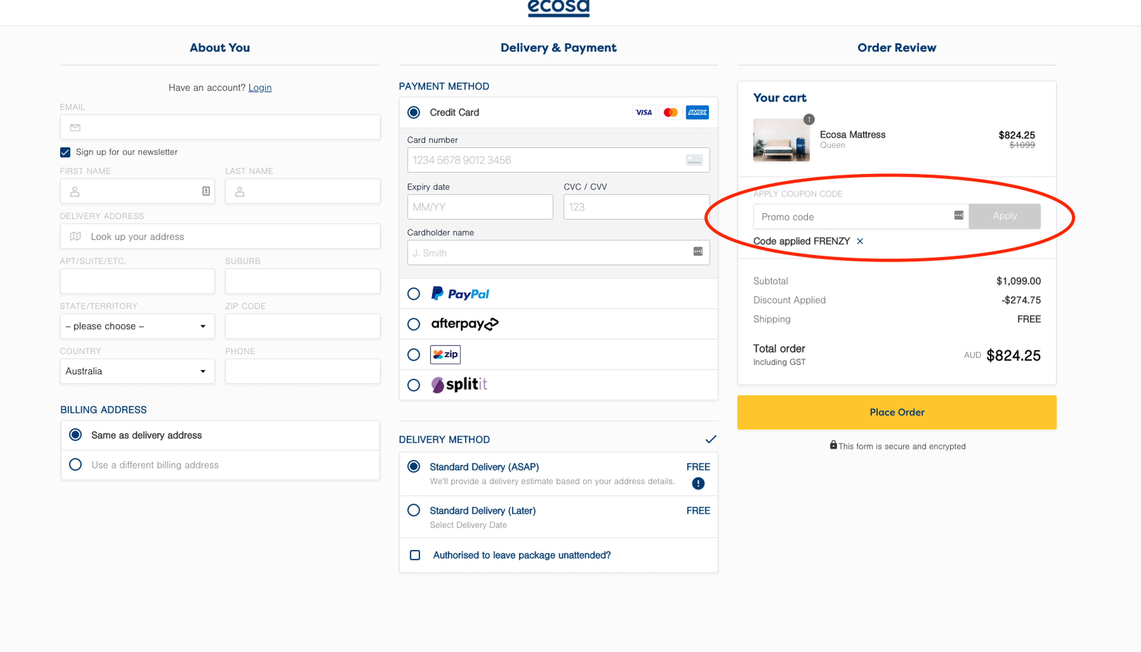 - Enter your Ecosa promo code in the designated field