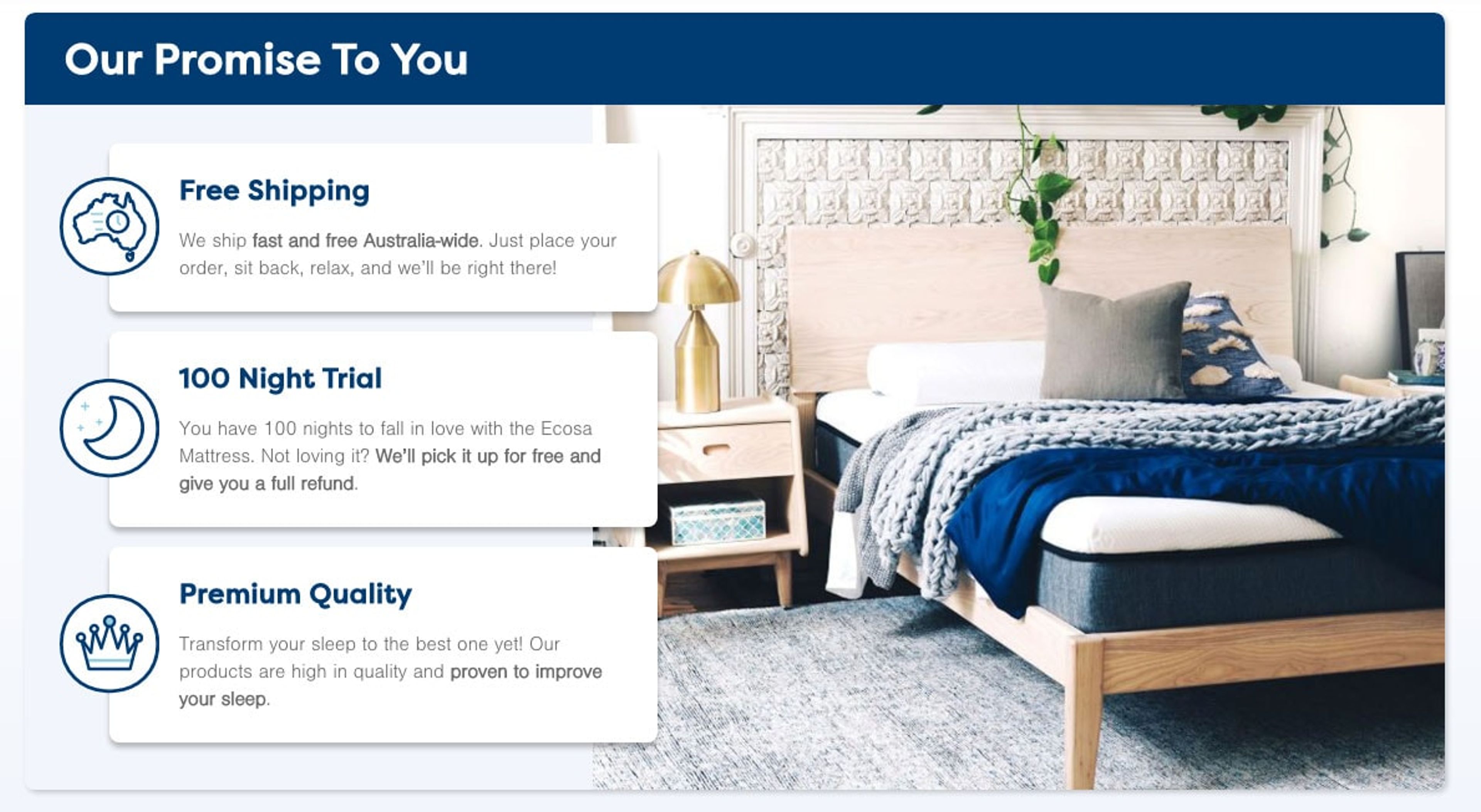 The Ecosa Mattress has more than 10,000 5 star reviews online from people who purchased and loved the product. Independent review sites have listed the Ecosa mattress with a 7.8 out of 10-star rating, which is exceptionally high. Buyers of the Ecosa mattress are impressed with the fast shipping, the 100-night trial (you can sleep on it for 100 nights and send it back if you don’t like it!) and the premium quality which has been proven to improve your sleep. Many Ecosa mattress reviews also note the abundance of Ecosa promo codes which helps them get a better deal.