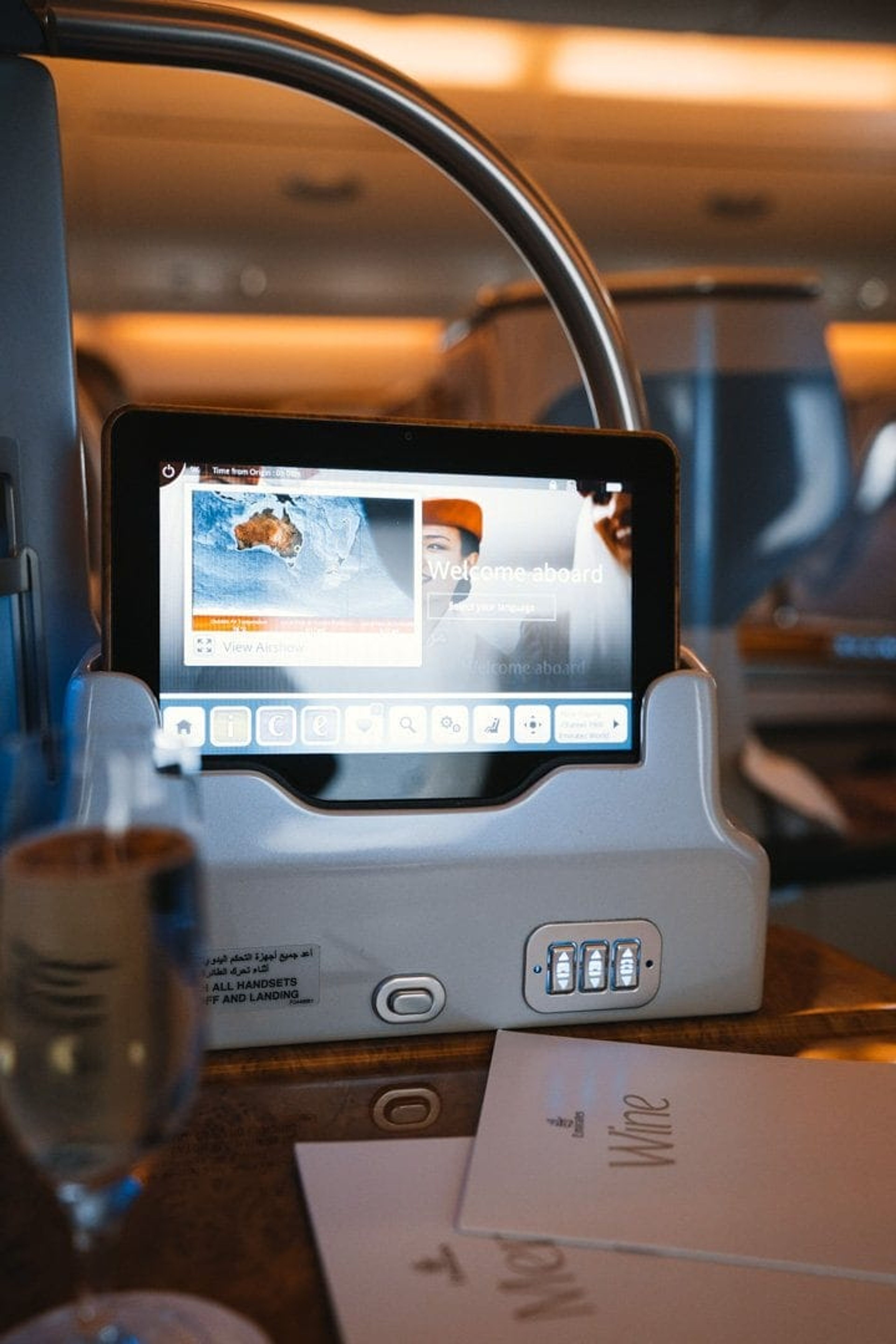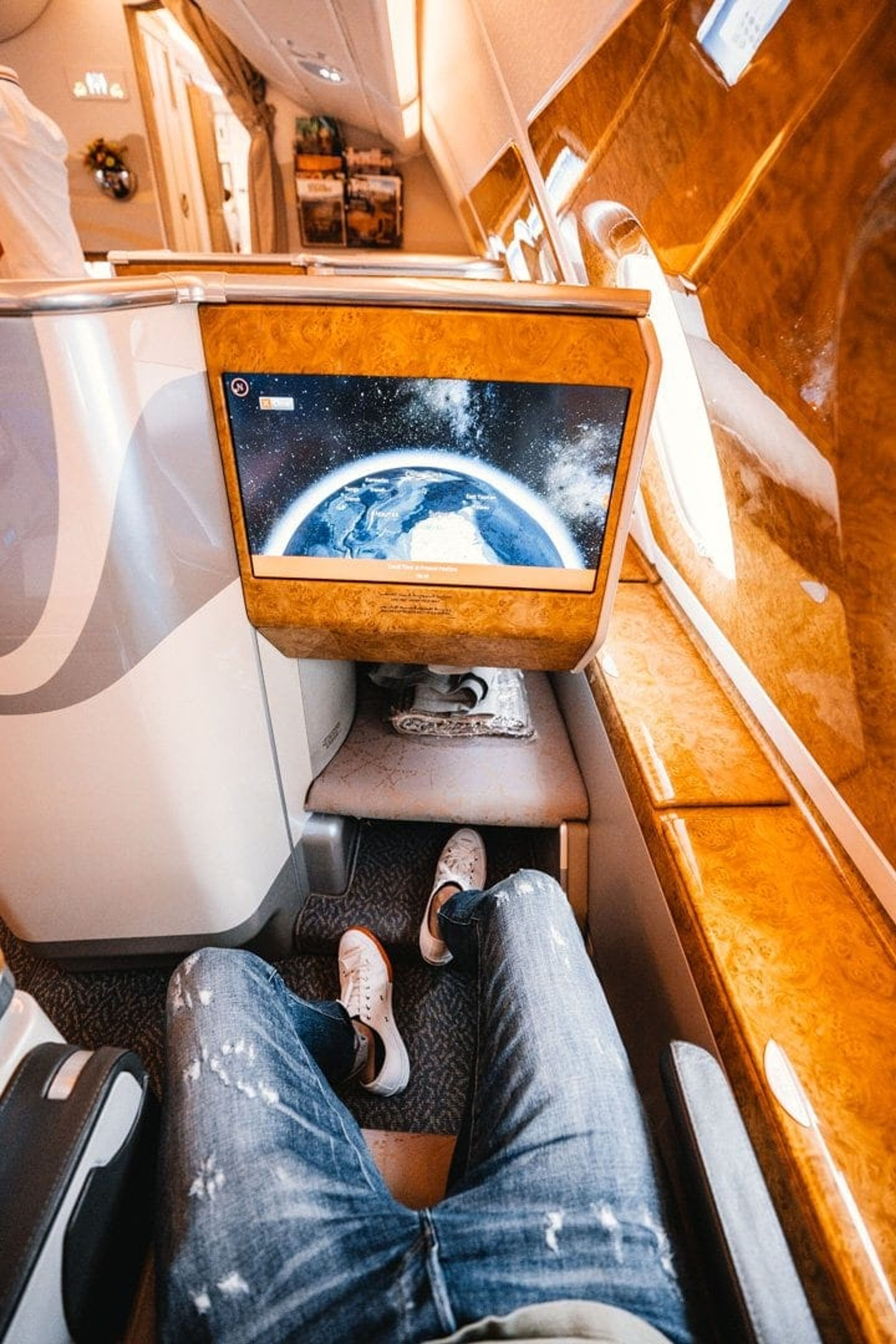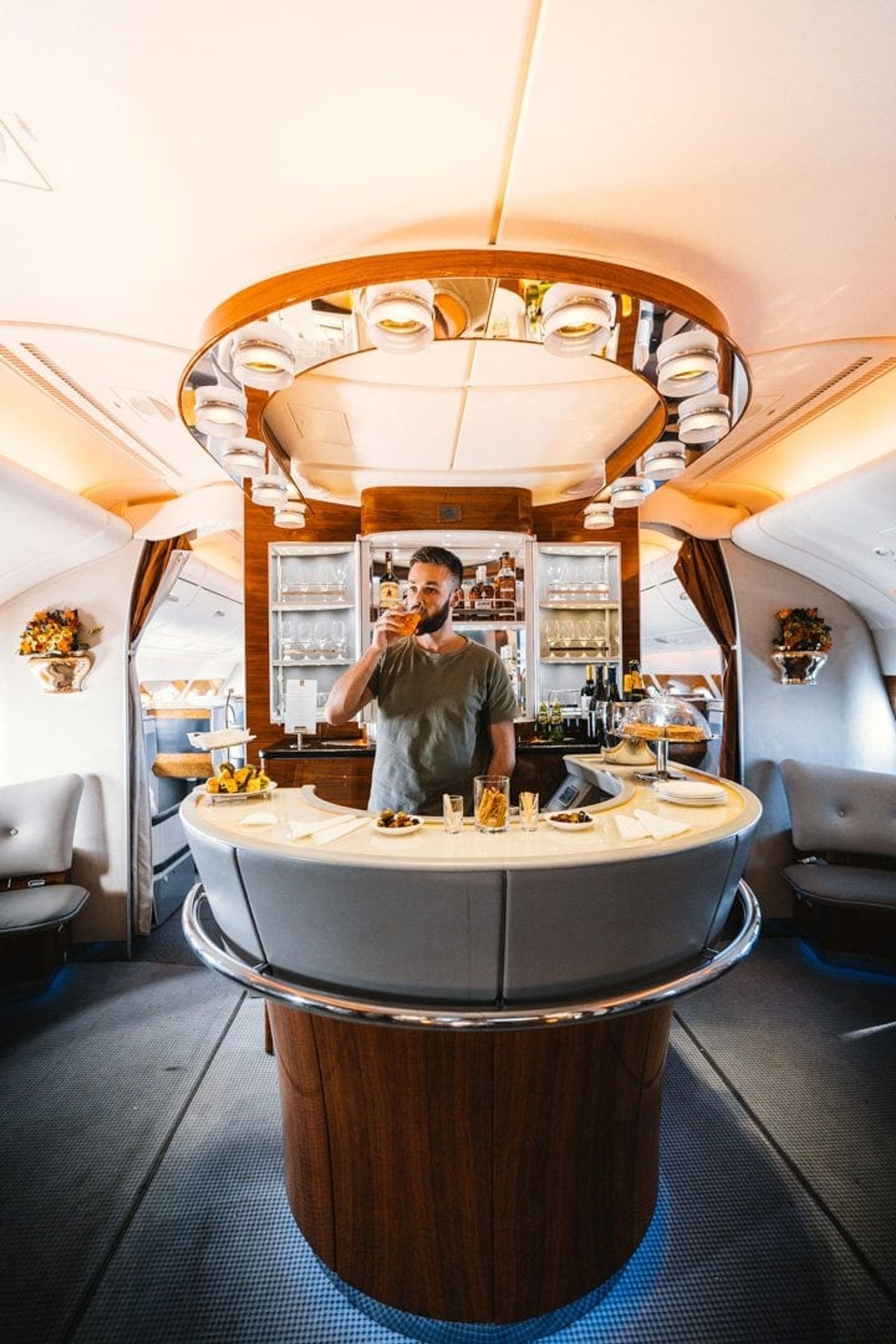 A separate detachable touch screen remote allows you to control every aspect of your business class suite. Emirates loves their bling, and the A380 business class seat is no different, it’s a bit over the top with all the gold and faux wood details, but I love it. The new interiors on the 777-300 released in 2017 are a great upgrade in the design direction of Emirates, and some of the elements can be found on certain A380’s which feature the new and restyled bar area.