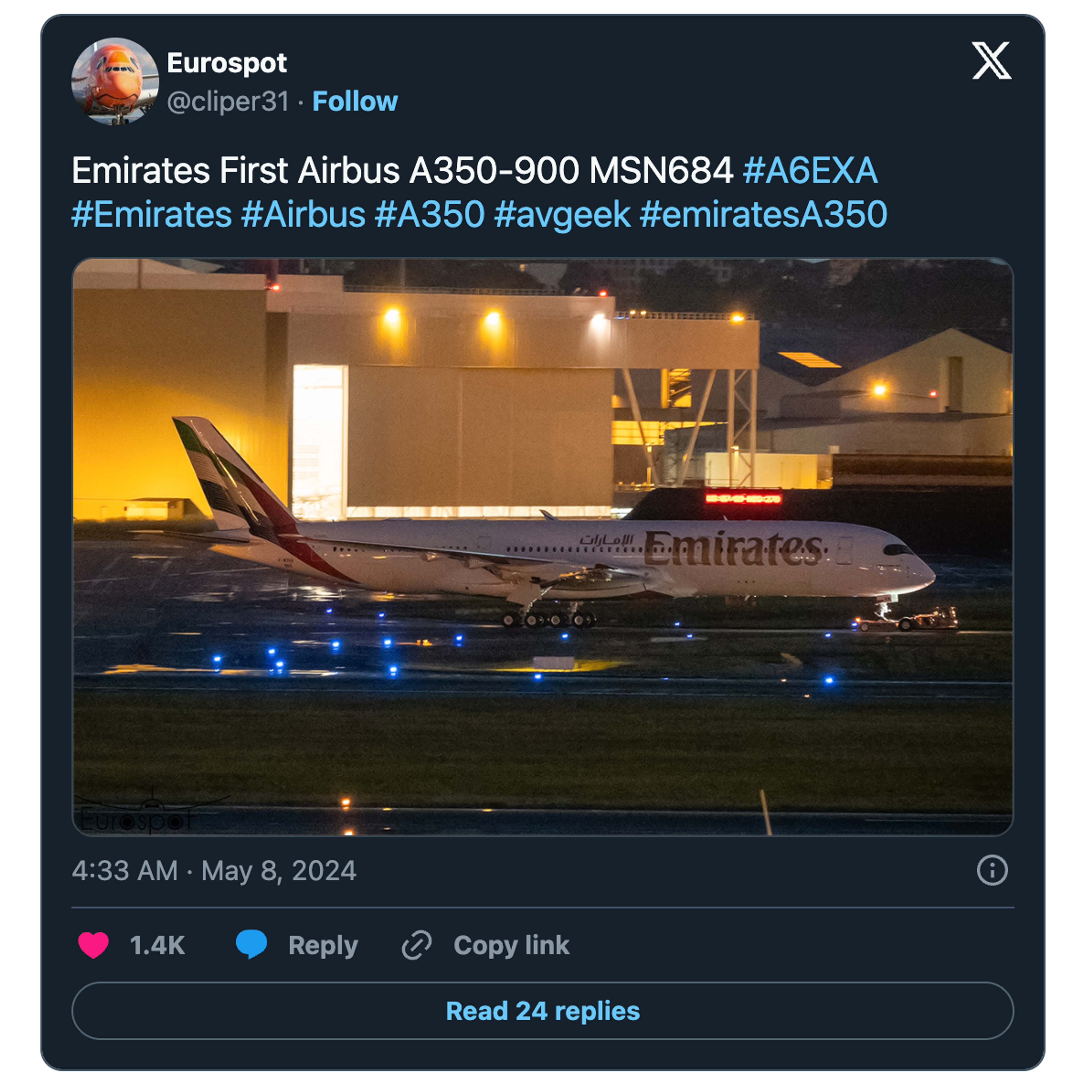 Keen aviation nerds would note that the first Emirates A350-900, to be registered A6-EXA and currently wearing test registration F-WZGA, was spotted fully painted in the carrier’s livery as far back as May 2024. The jet was noticeably missing its two Rolls Royce Trent XWB jet engines, a similar model that holds up Emirates’ A350-1000 order. Although, it is much more likely that certification and delivery of the brand-new cabins is holding up the -900’s.