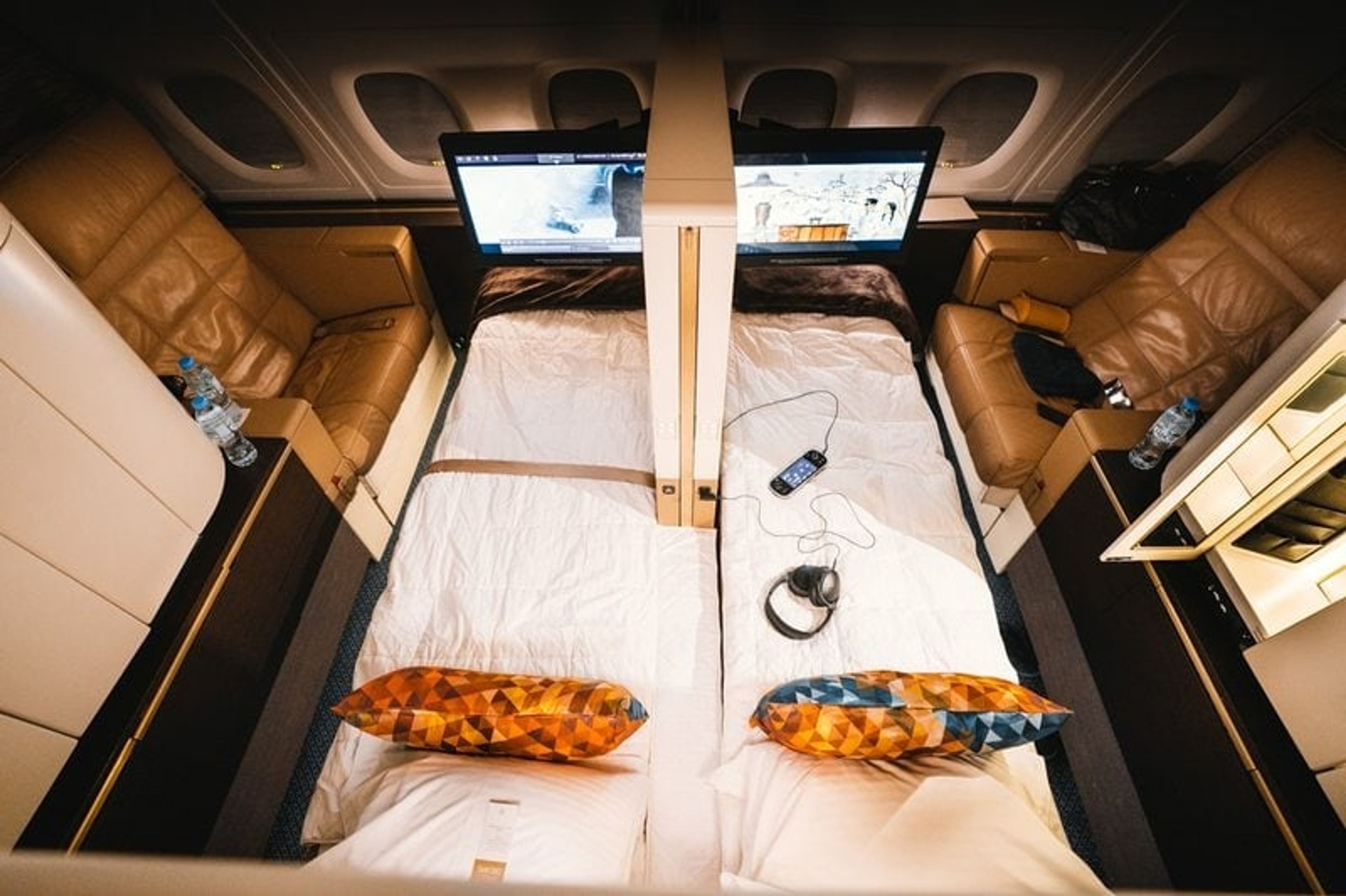 Etihad’s suite design was ahead of its time, and only now we see a similar level of first class product with Singapore Airlines’s A380 suite. Although the dividing wall only comes down partially on Etihad, it’s actually enough to sleep more comfortably. The bench in the Etihad suite transforms into a fully flat 182 cm bed. Unlike Singapore’s design which manually folds out, Etihad has a motorised system that converts the couch into a bed. Even though the crew on our flight seemed ice cold and grumpy to be working, they did an excellent job in making the bed. It was perfect, and they even made sure to swap over my headphones to the secondary port so I could keep watching my movie in bed. The linen was very high quality, and the blanket had a good thickness to it. I’ve heard from others that they found the Etihad mattress topper to be too thin, but I thought it was excellent and not too hard at all.