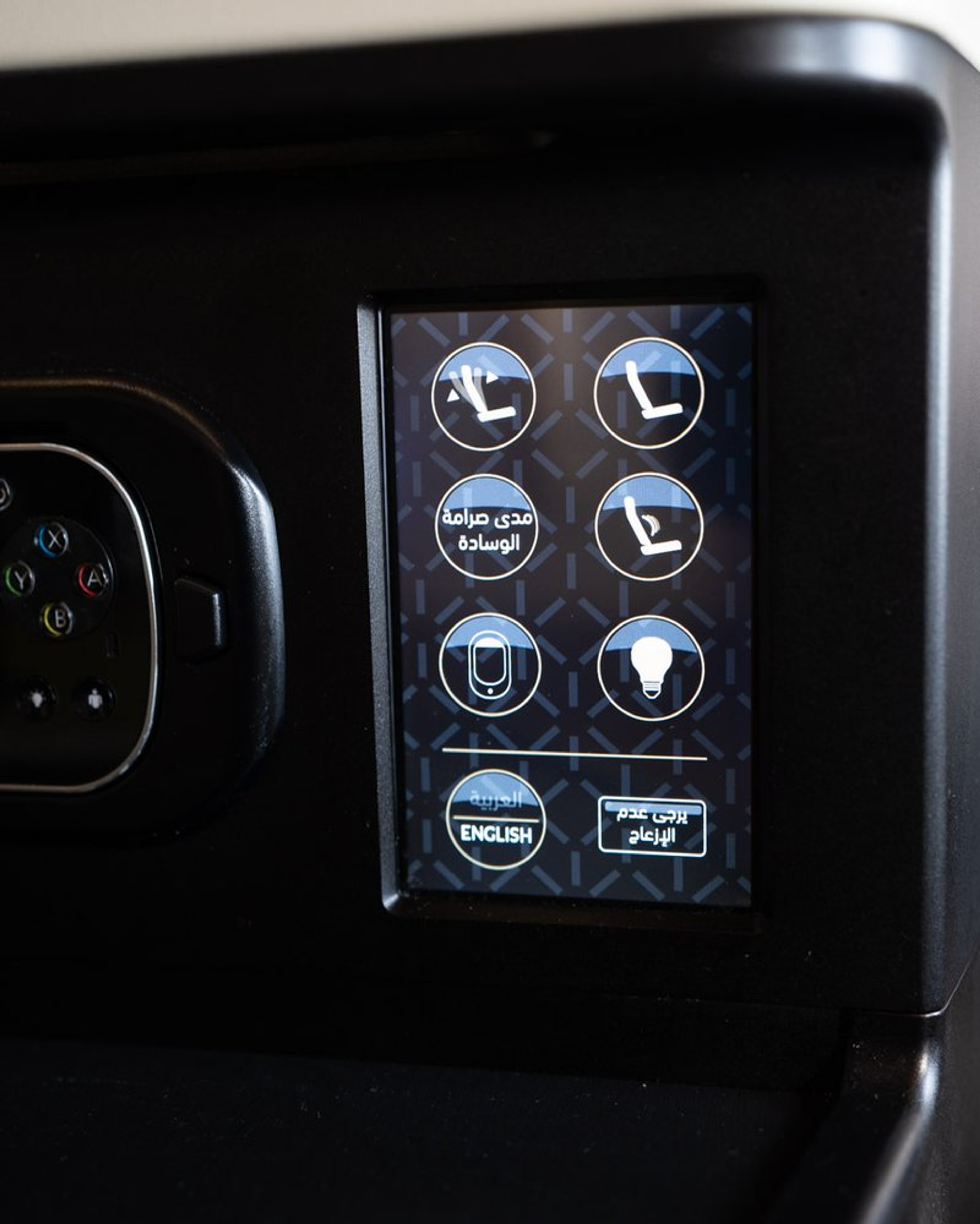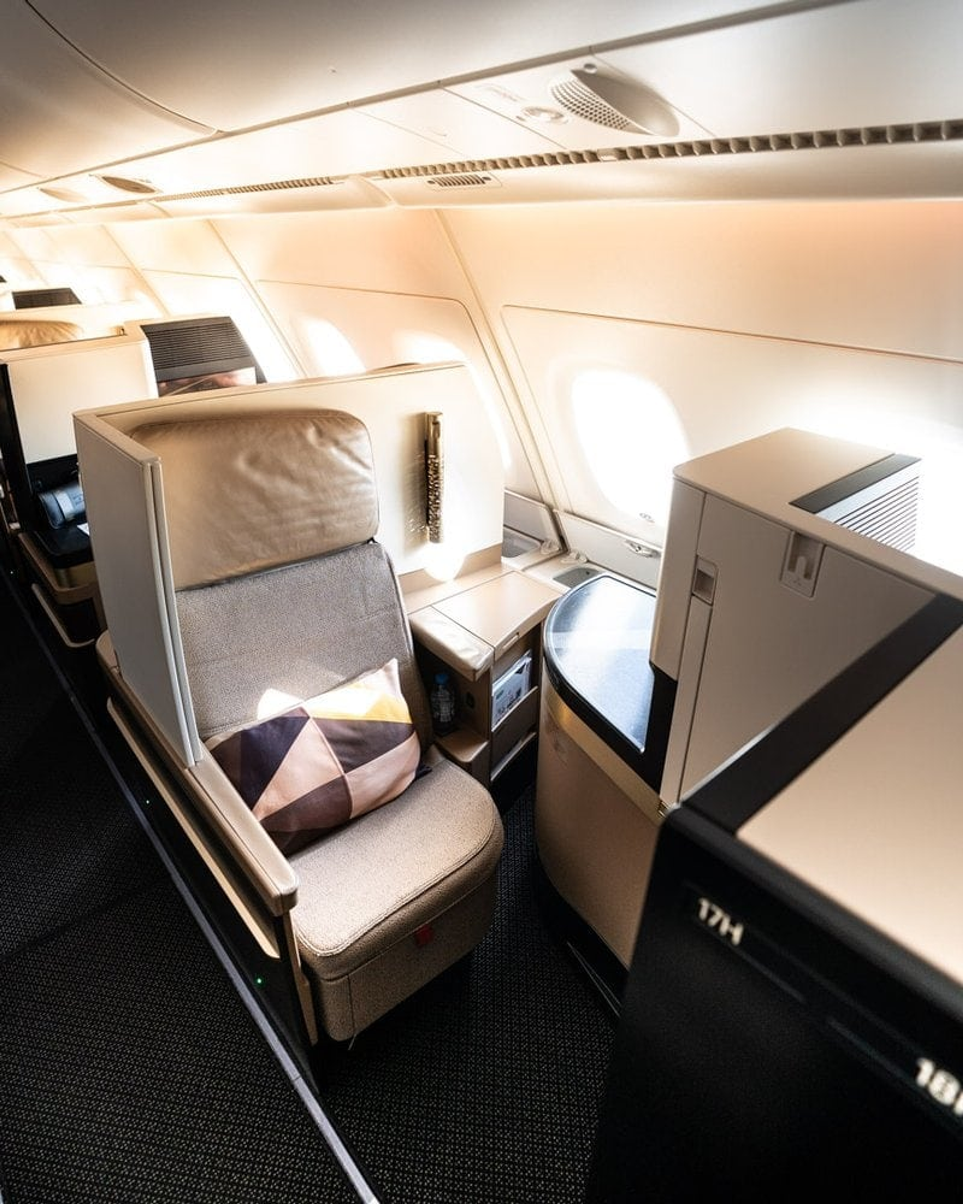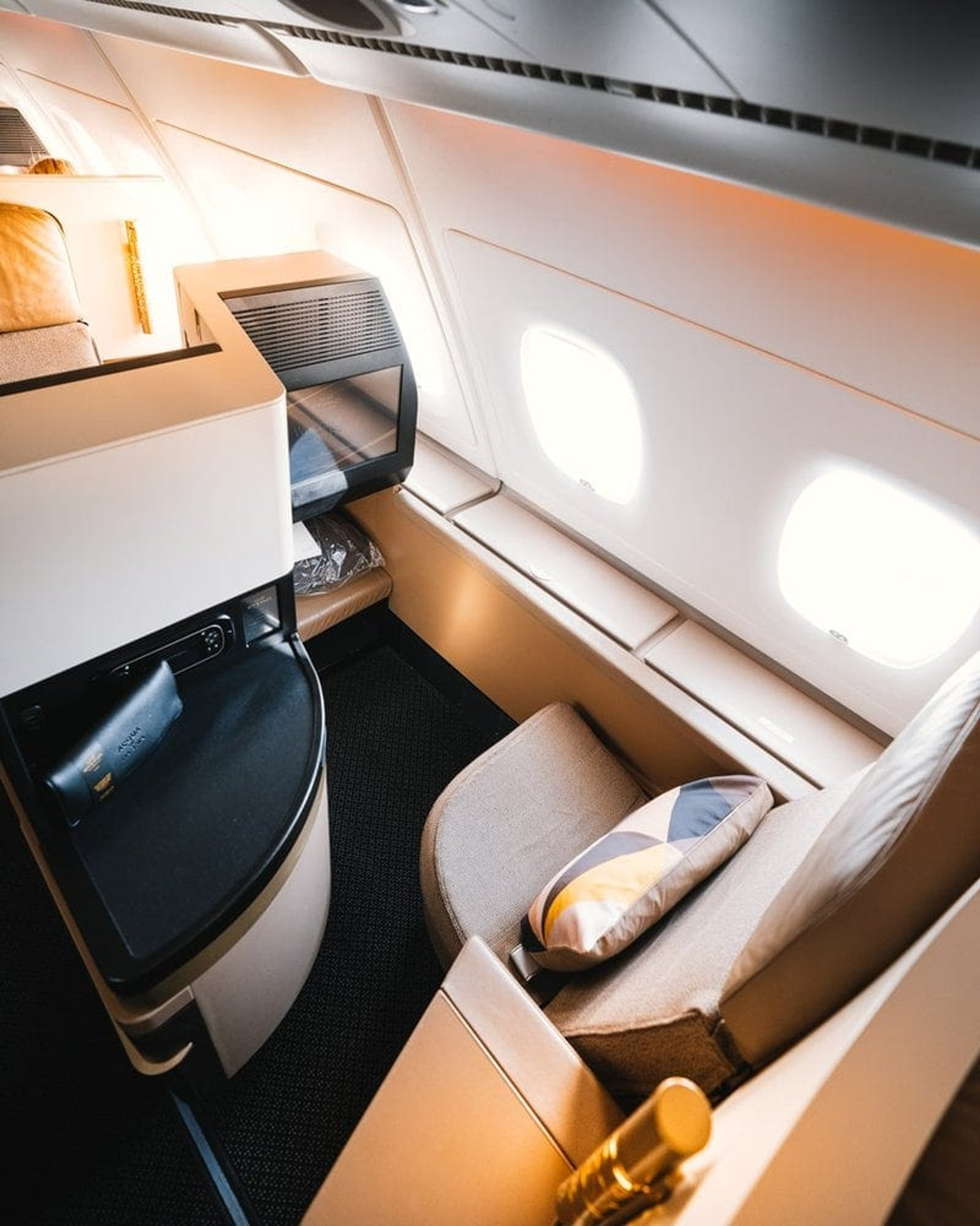 The colour palette is spot on with light beige leathers, black surfaces and golden accents. Basically a grown-up version of Emirates with all its bling. Storage space is ample with a full compartment overhead and plenty of space on the window side of the seat.