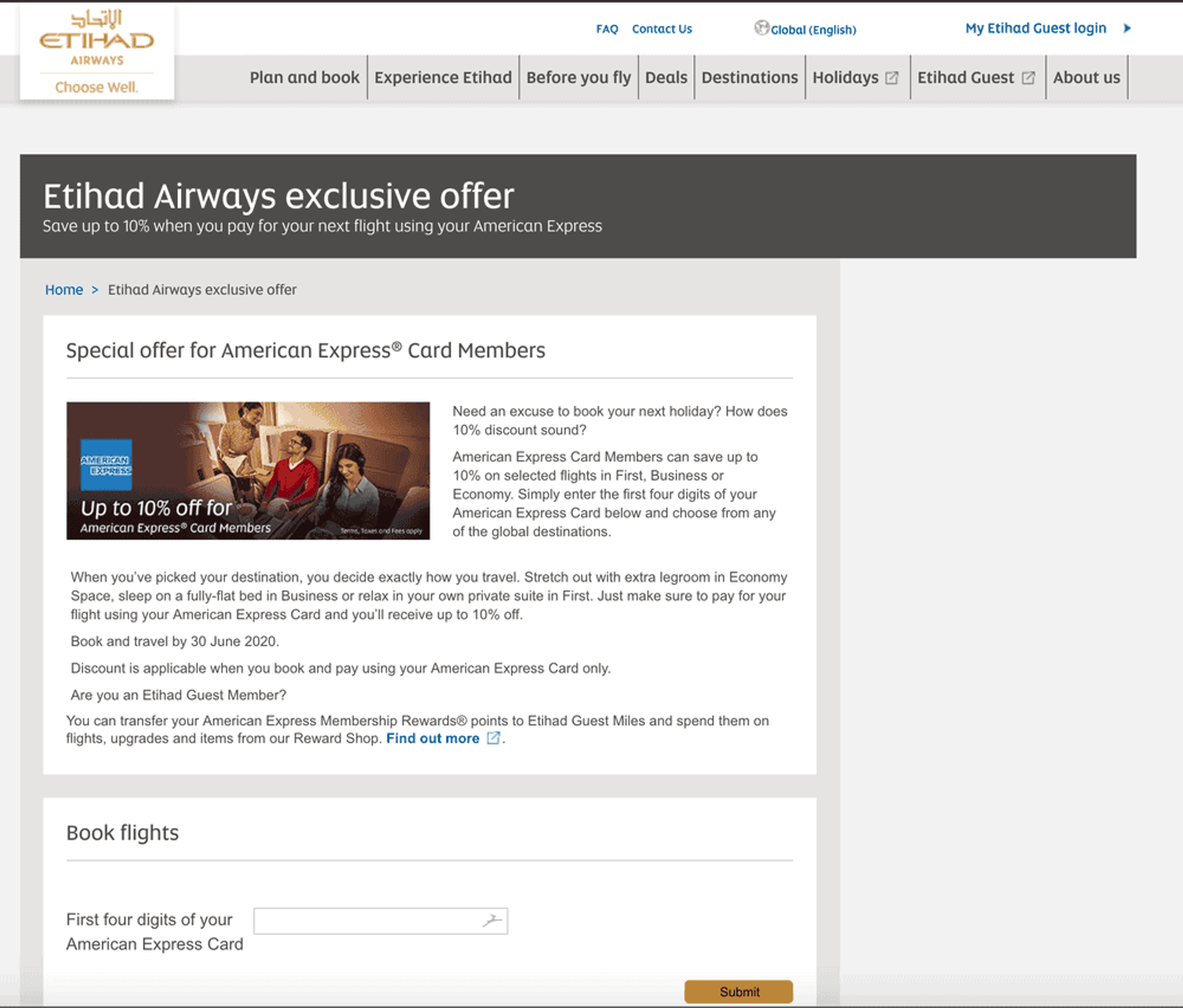 To book one of these sale flights, you have to do so via this dedicated Amex/Etihad booking page and enter the last four digits of your card to get access.