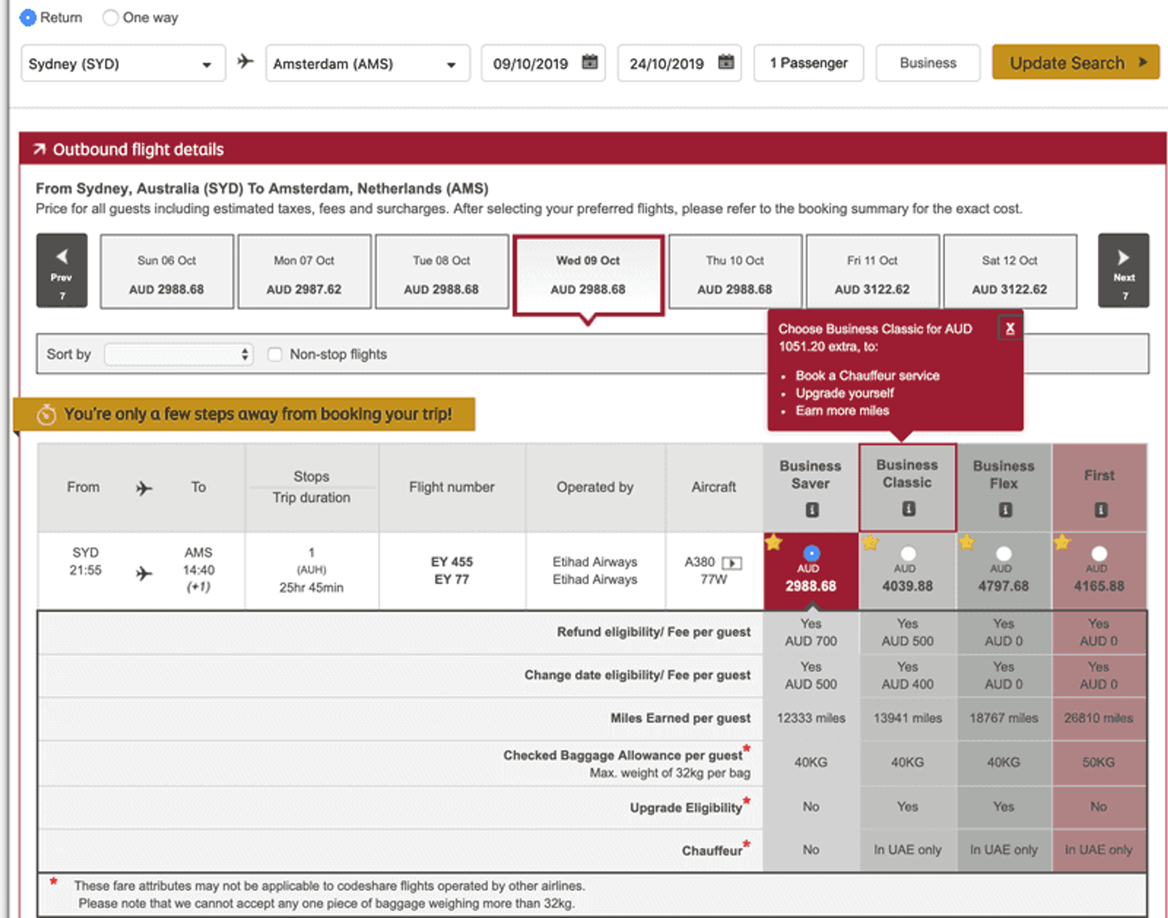 It’s safe to assume these discounted business flights will book into the Z fare bucket which will earn you 24,710 Etihad Guest or Velocity Points. You could also credit these to American Airlines AAdvantage for 21,488 AAdvantage miles.