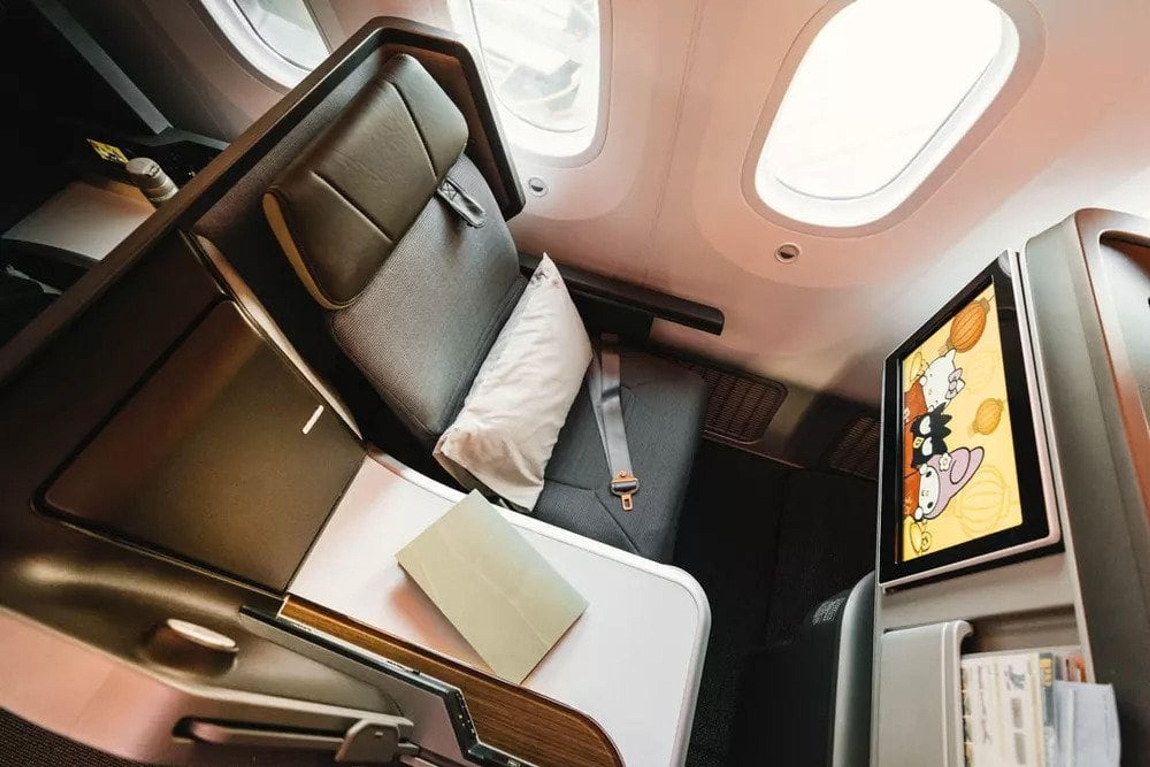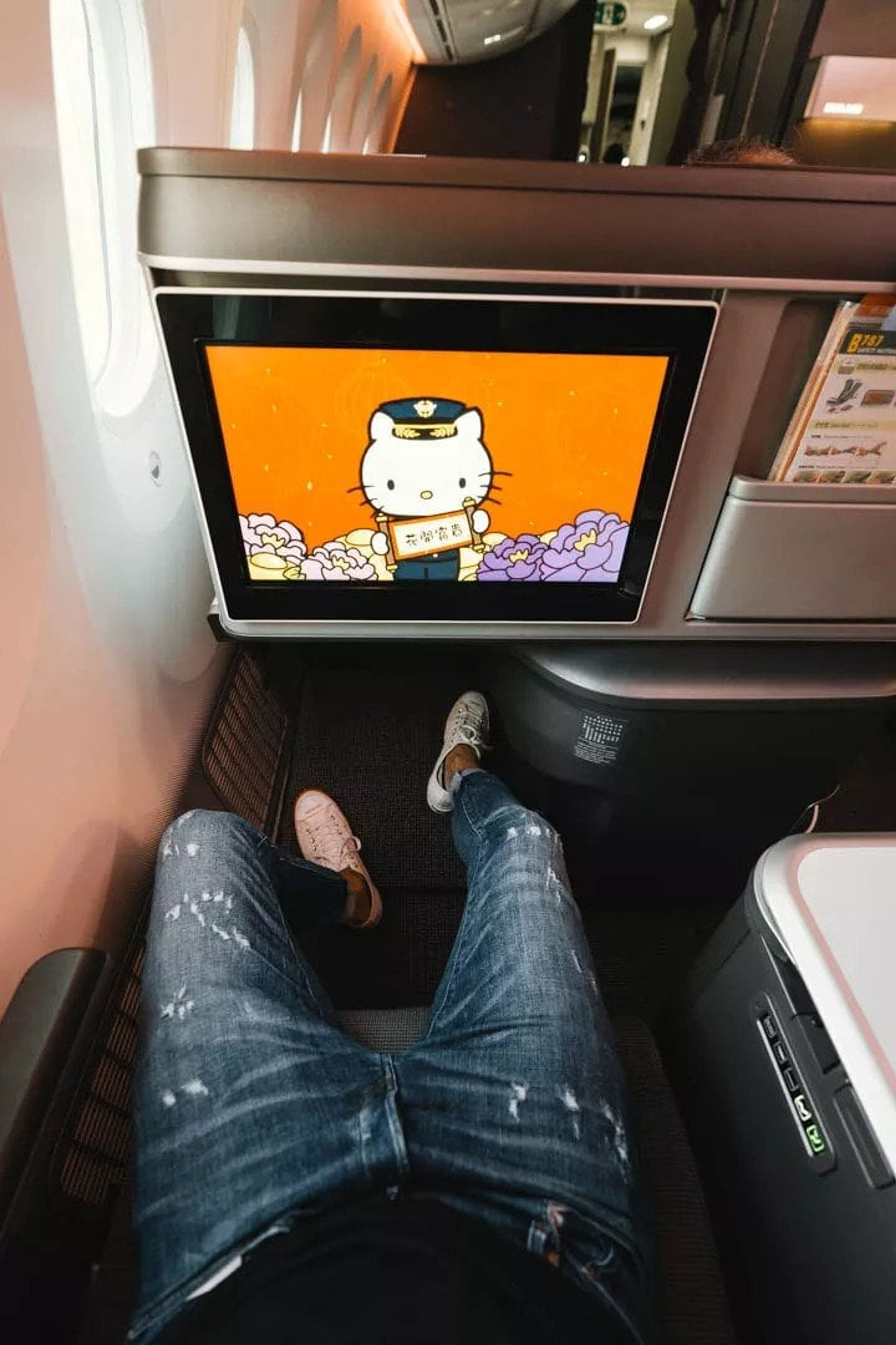 EVA Air is well known for their Hello Kitty themed aeroplane liveries and this concept is also present in their boarding music. Having never flown EVA Air before I wasn’t sure if the music being played was a “one-off” due to Chinese new year or a standard thing. On all the IFE monitors there was a Bad Badtz Maru Chinese new year clip rolling which was in conjunction with music that sounded like the Nyan cat music on repeat (if you want to get a sense of what that’s like, I couldn’t find what they were actually playing).
