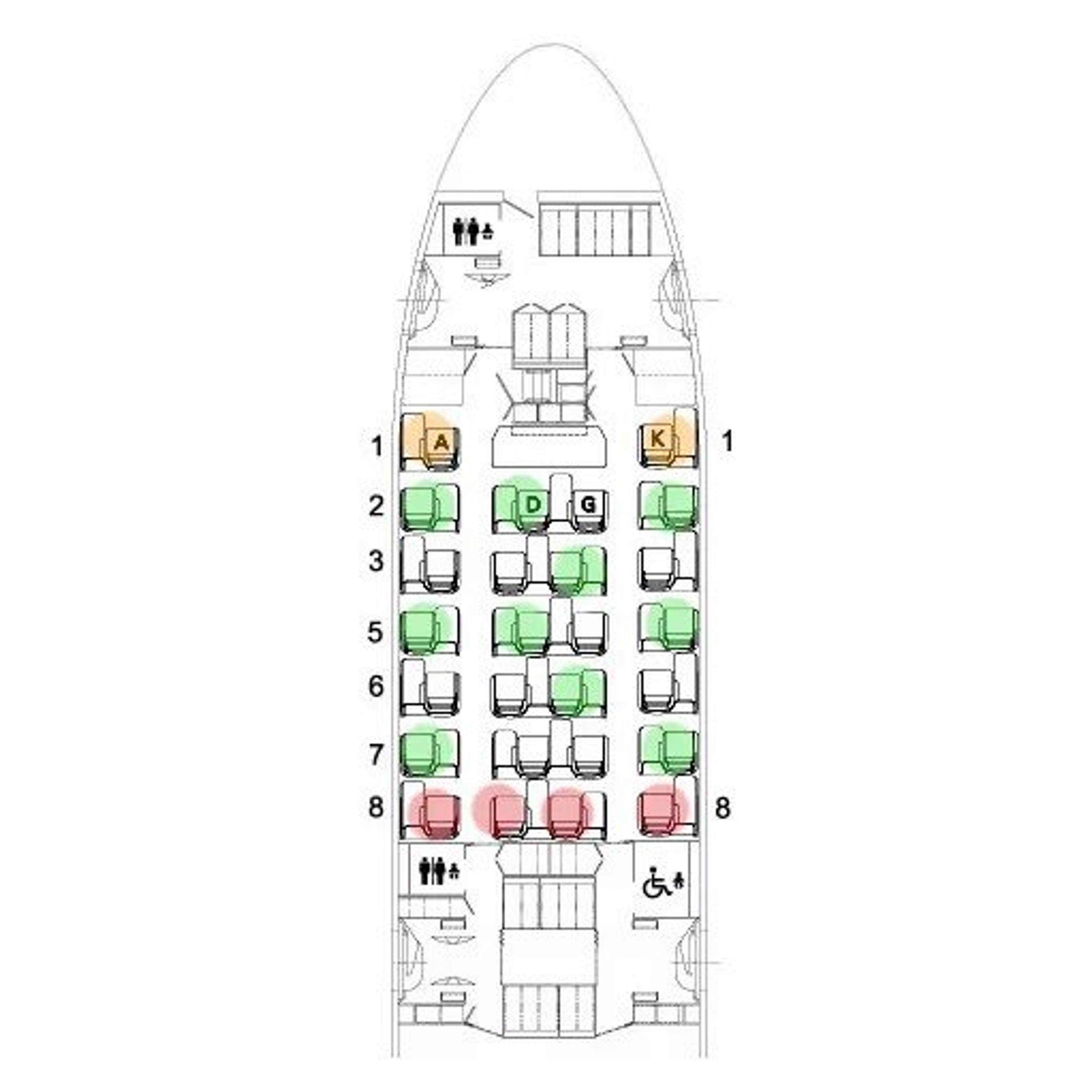 I’ve highlighted all the seats which offer direct window views + those in the middle with the side table offering more privacy in green. Toilets are in the back, so I would avoid those.