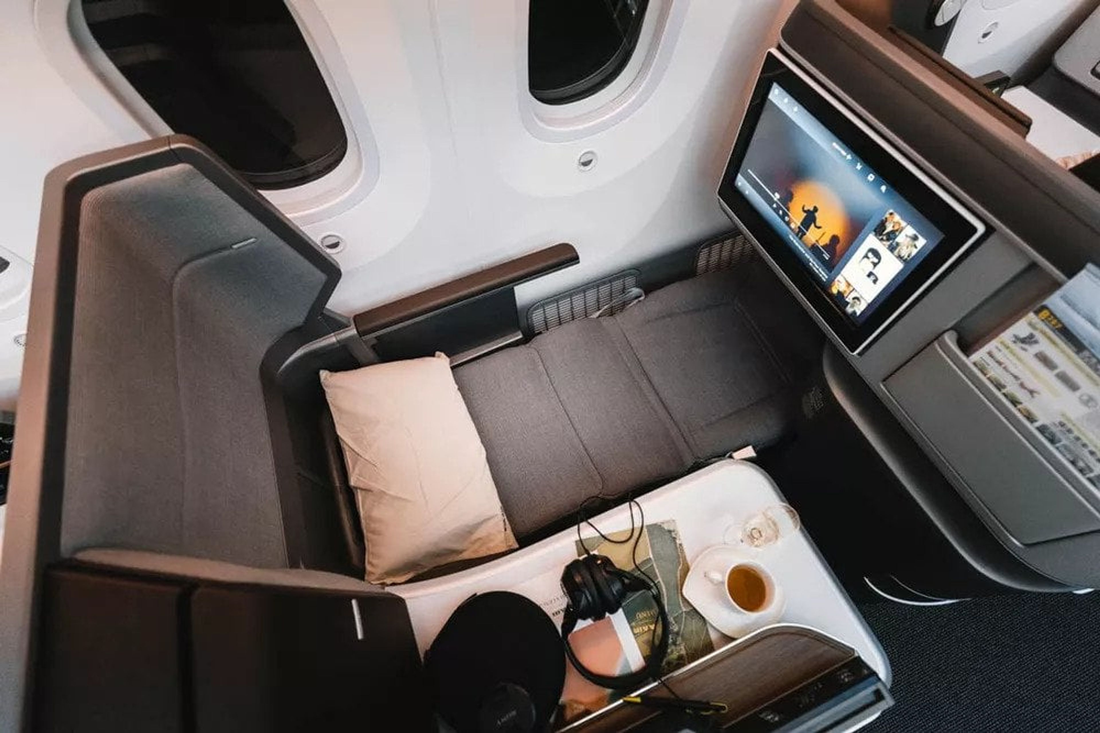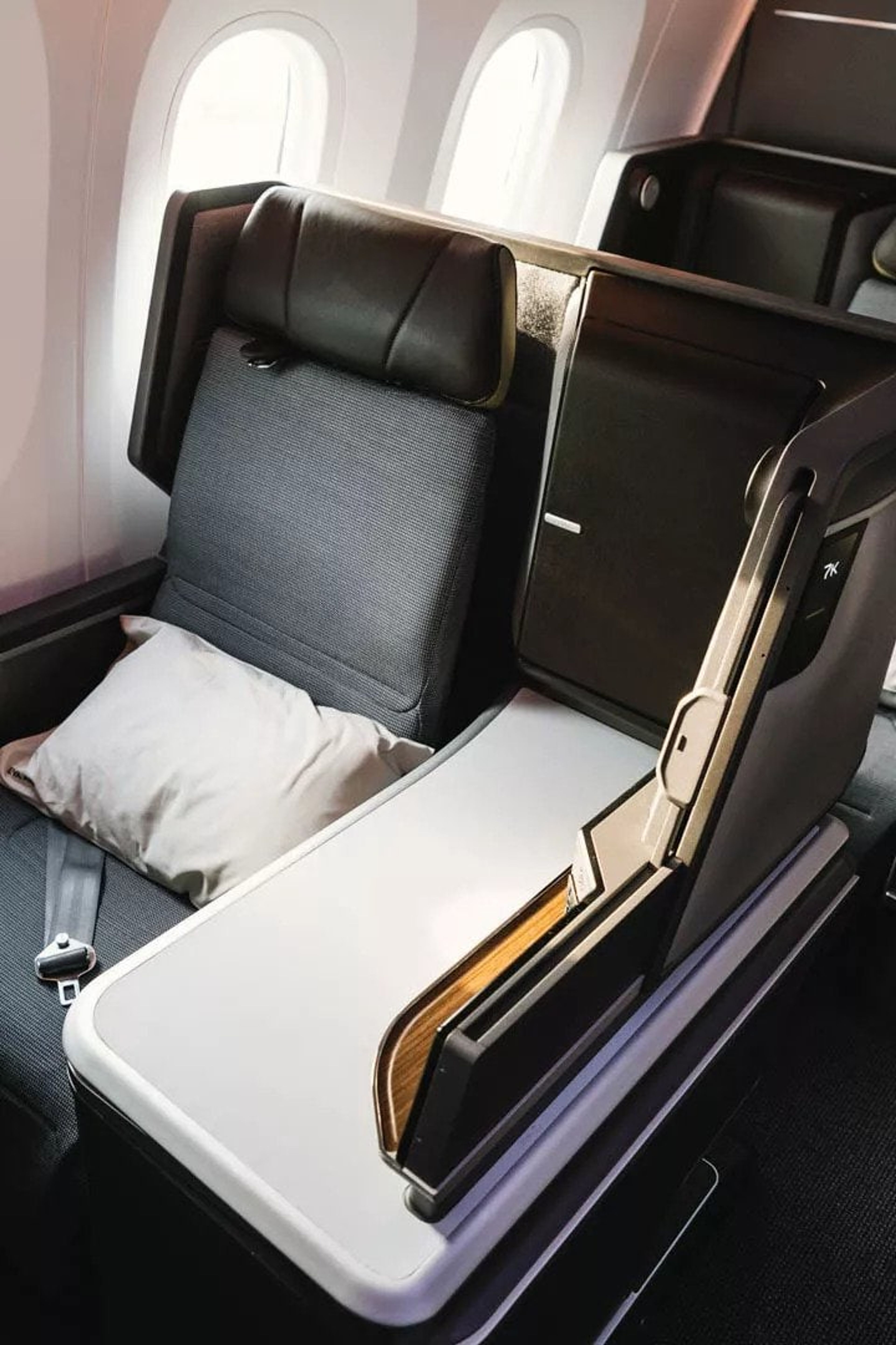 The seats on the 787-9 are all staggered which means for window seats; there’s an alternating pattern of those with direct window views and those with direct aisle access. I personally like to sit right next to the window and have the large side table “shielding” me from the walkway for extra privacy.