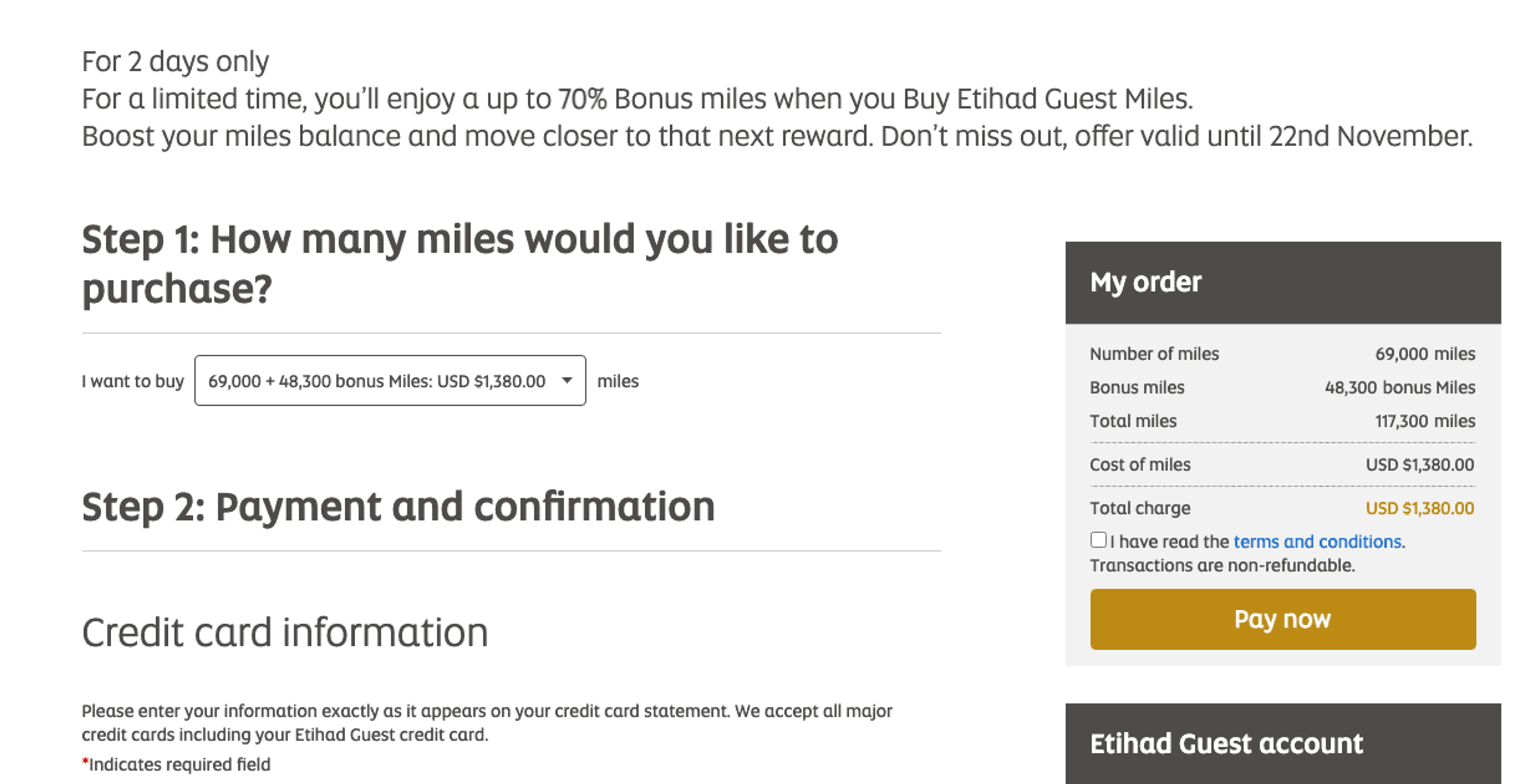 Etihad Guest has just launched a lucrative 70% bonus sale when you purchase more than 31,000 miles. It’s on for 2 days only from 21-22 November (you’ll get an extra day in Australia due to time zone differences).