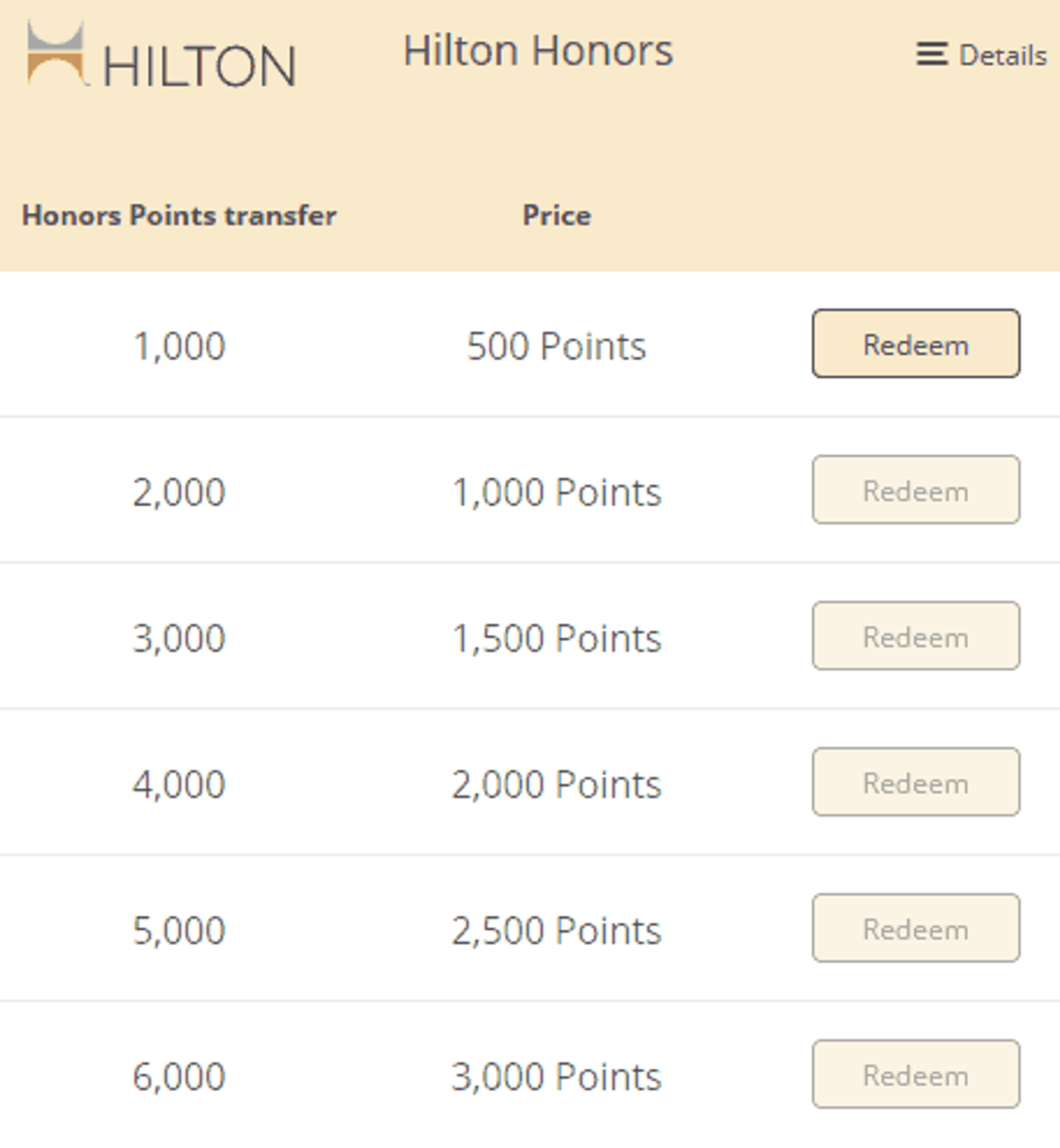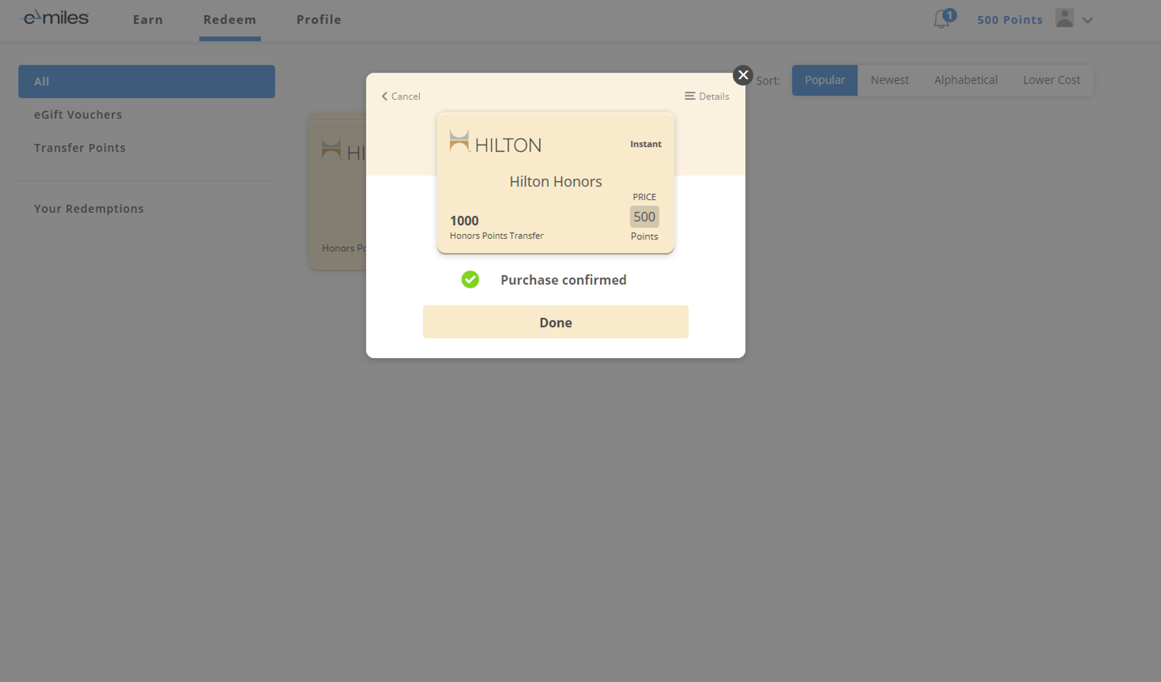 Step 5: You will now have 500 eMiles in your account, click on “redeem” to move them into your Hilton Honors account (takes up to 30 days)