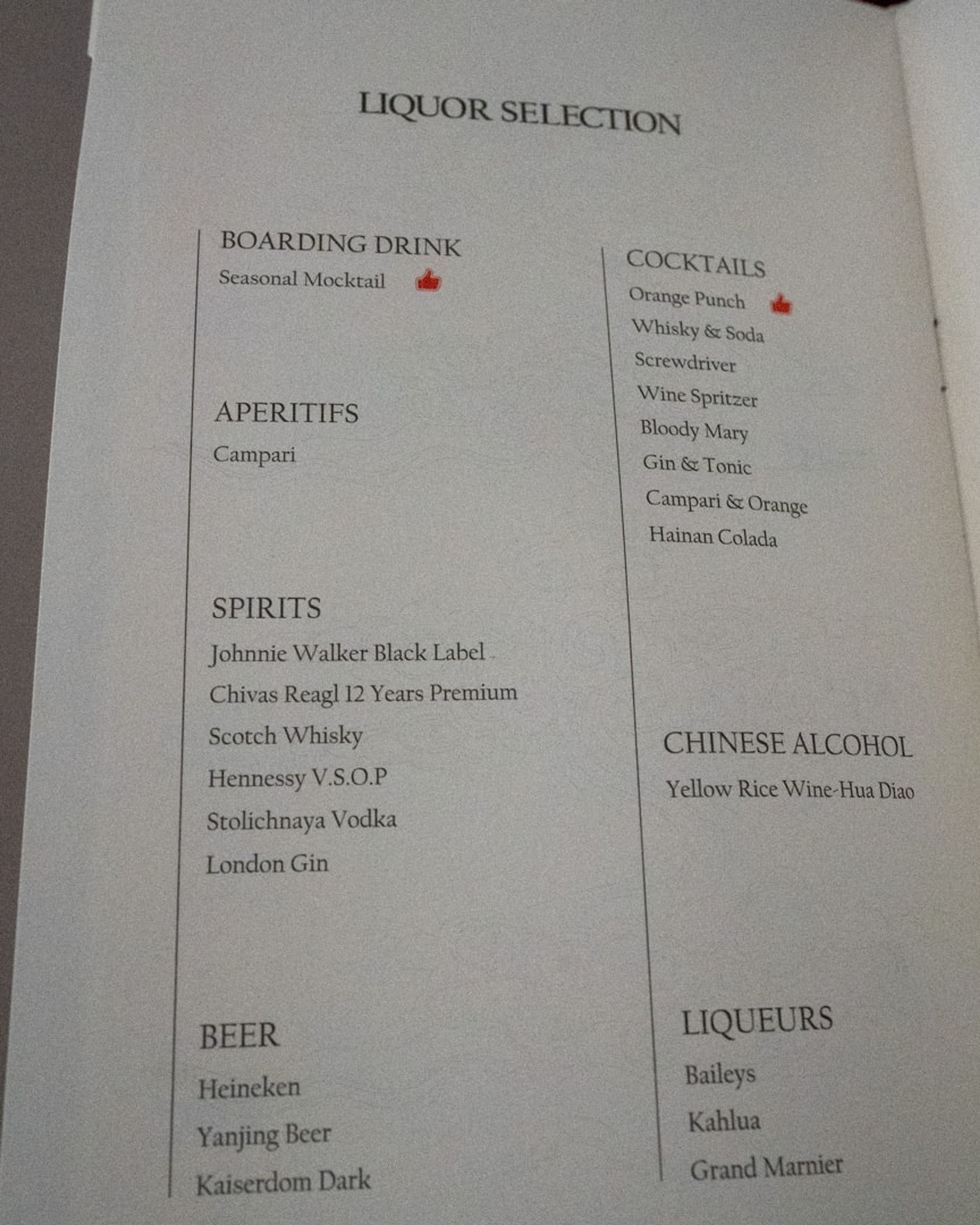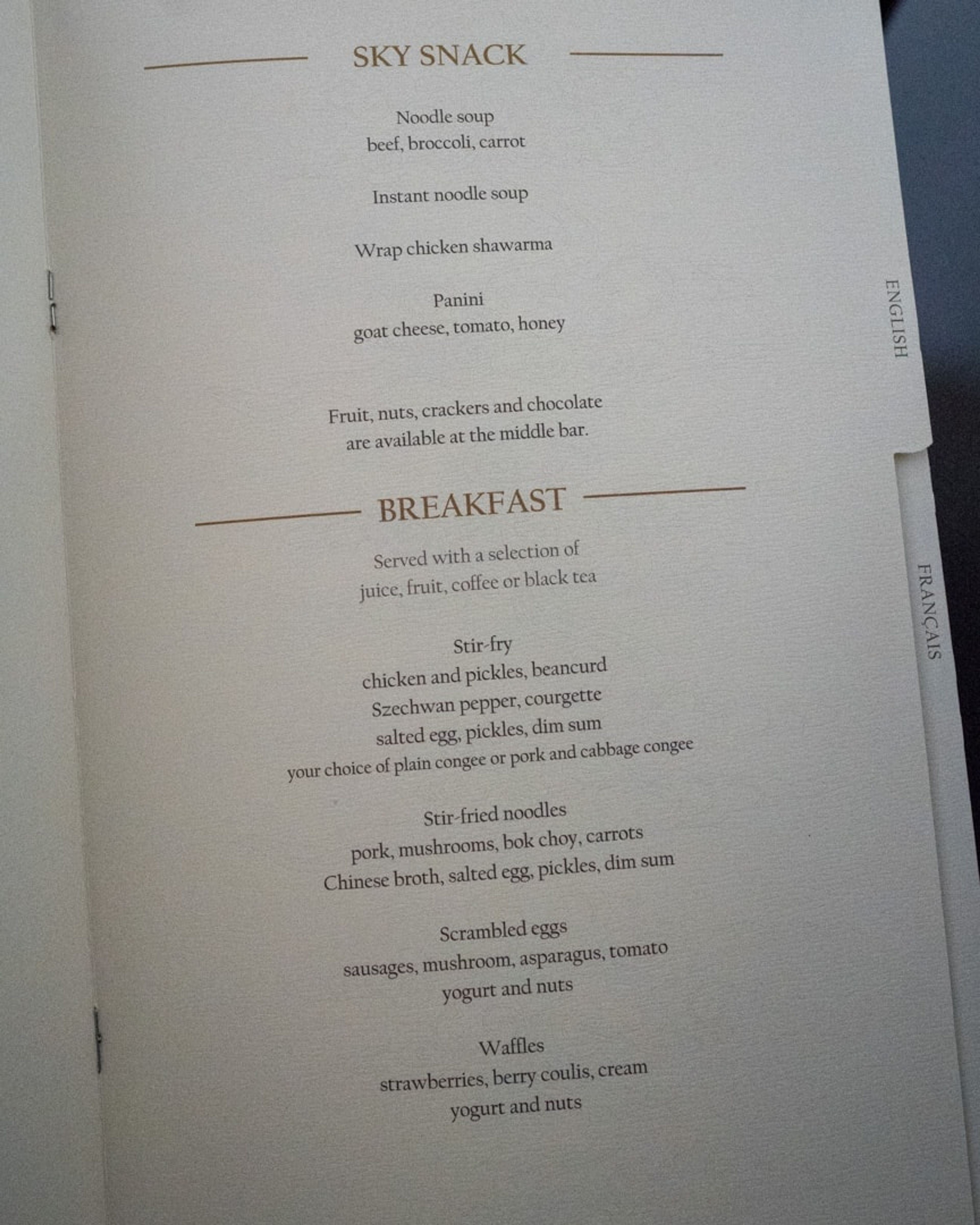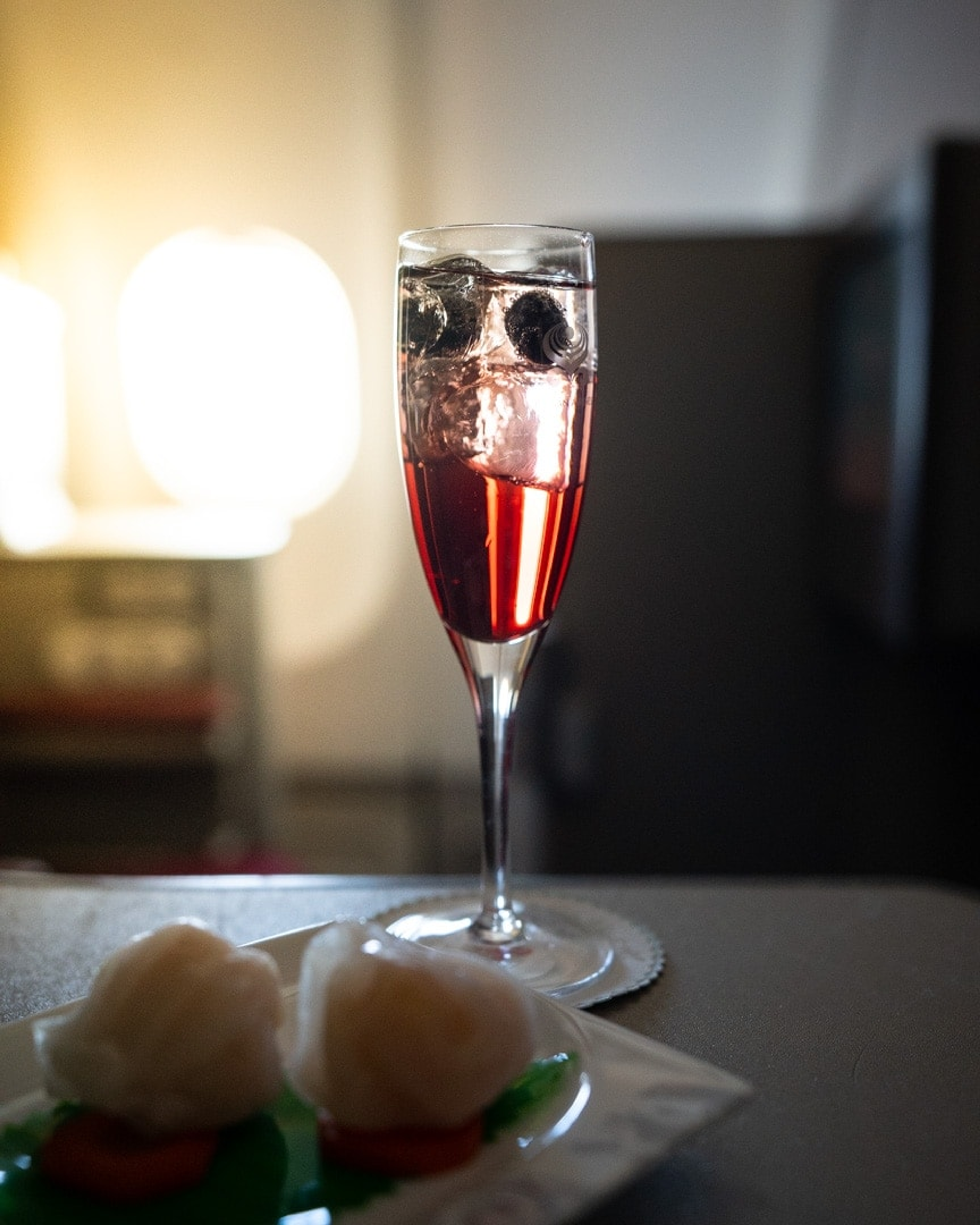 The chef came and introduced herself on the ground and explained the extensive a-la-carte, dine on demand menu. The menu features both western and Chinese inspired options which is great. I opted for a “signature” pre-departure champagne cocktail which was rather tasty.