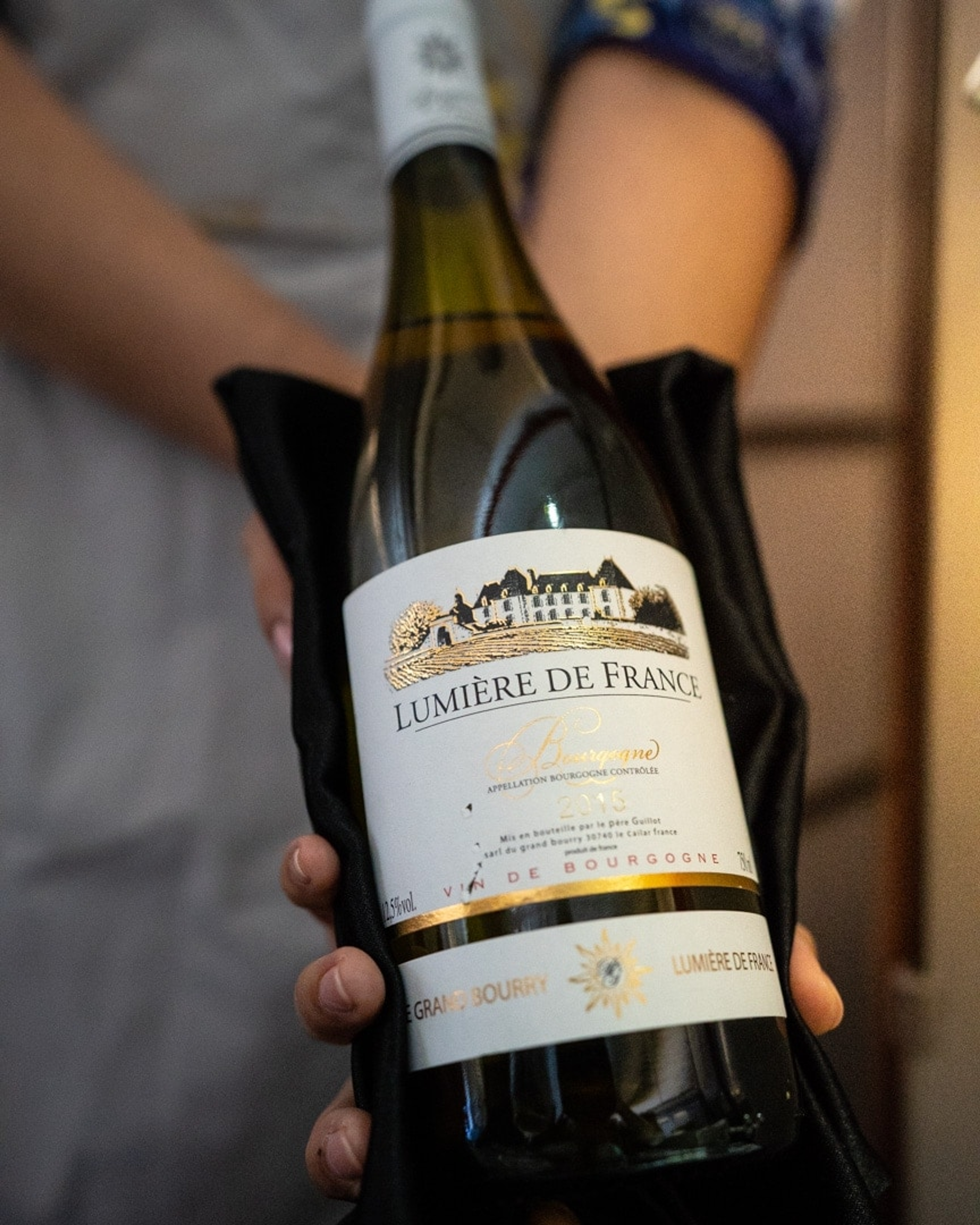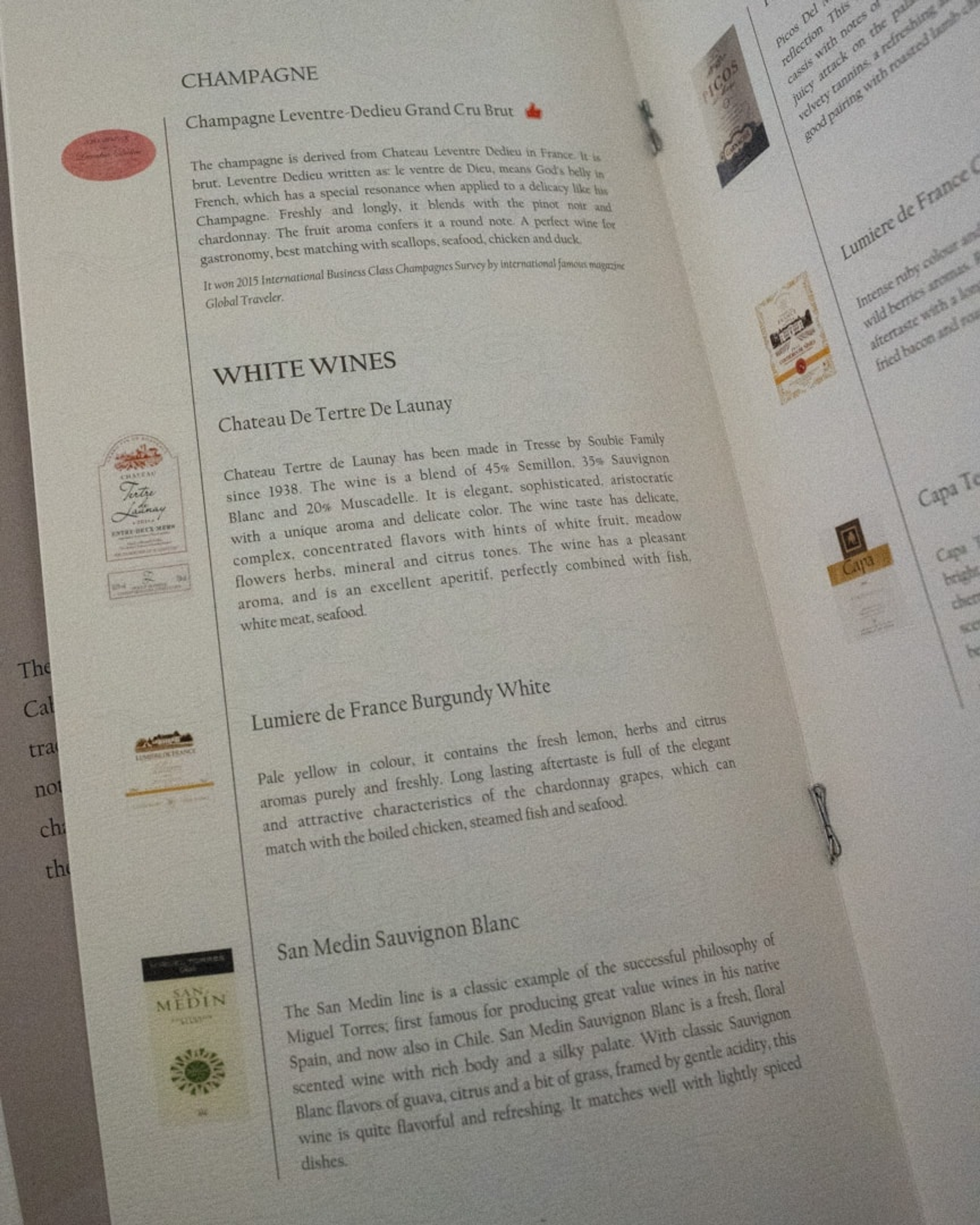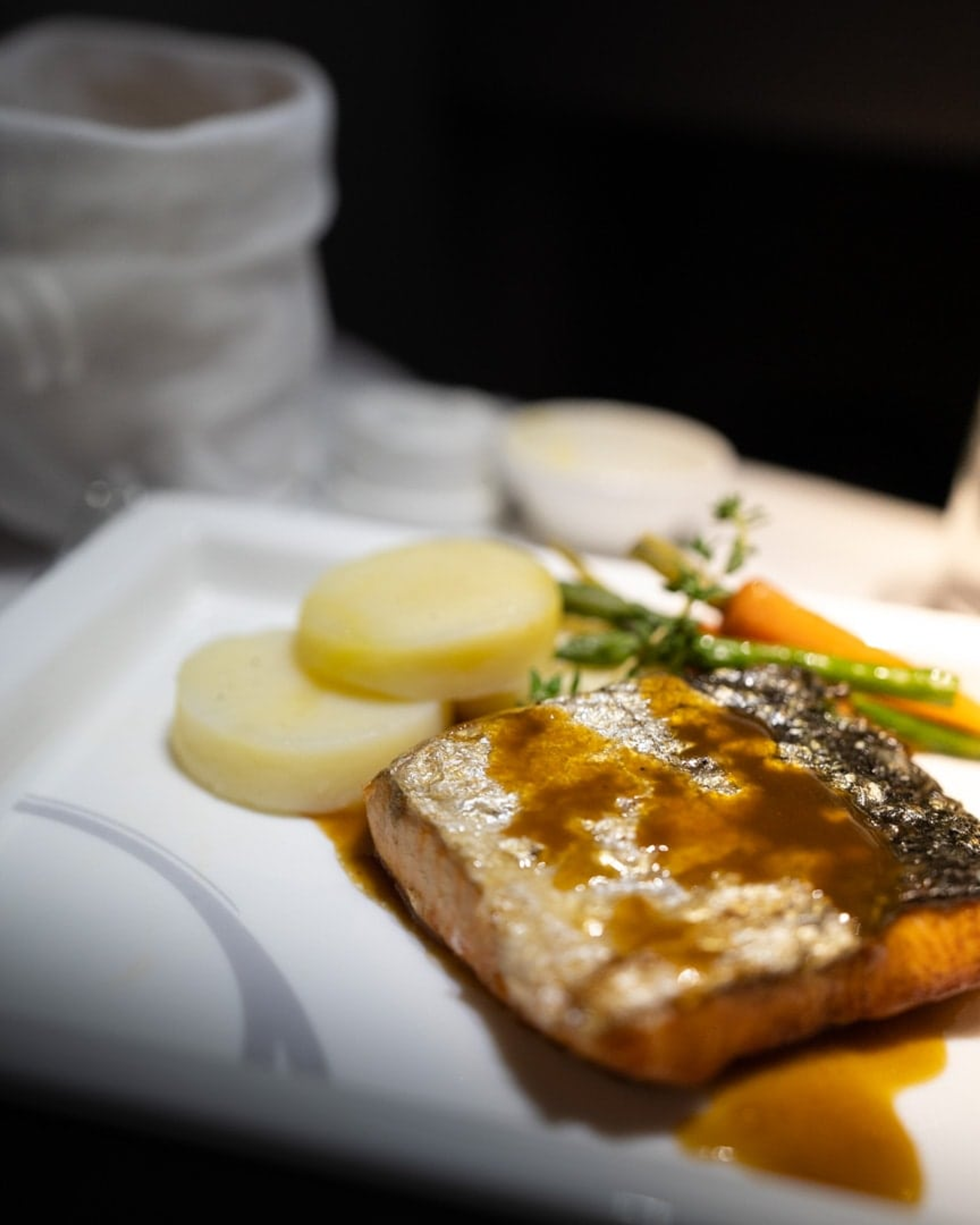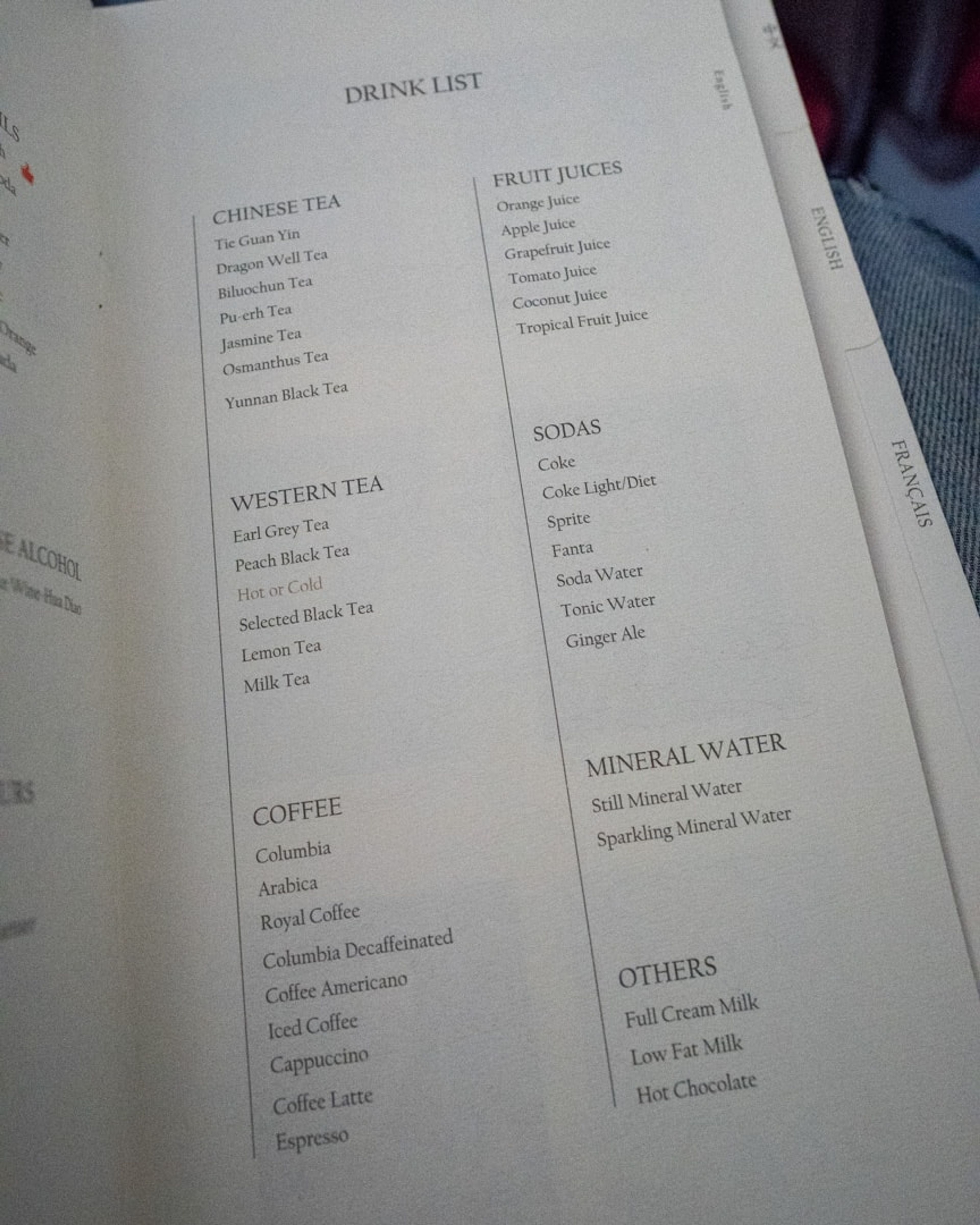 The chef came and introduced herself on the ground and explained the extensive a-la-carte, dine on demand menu. The menu features both western and Chinese inspired options which is great. I opted for a “signature” pre-departure champagne cocktail which was rather tasty.