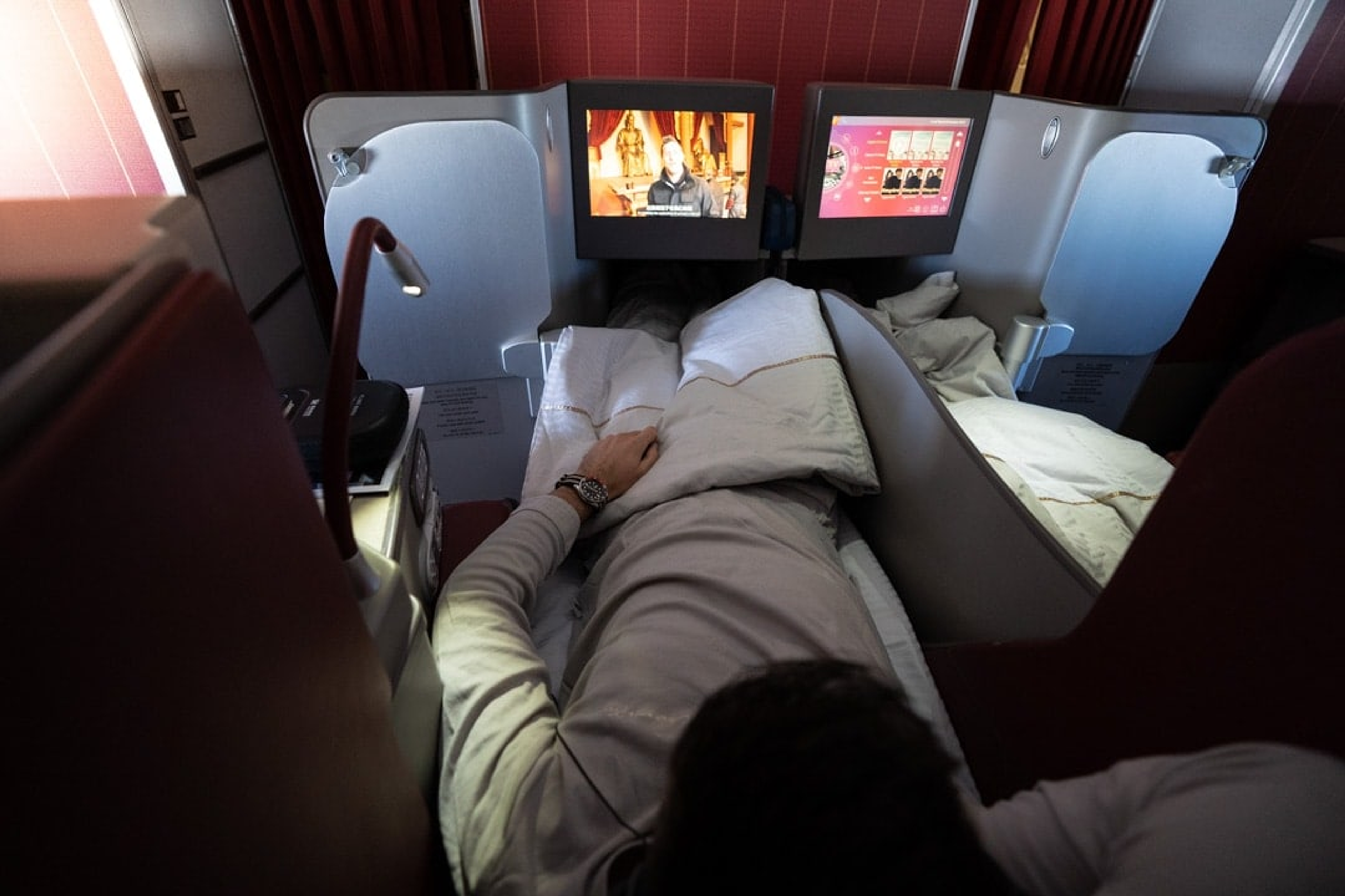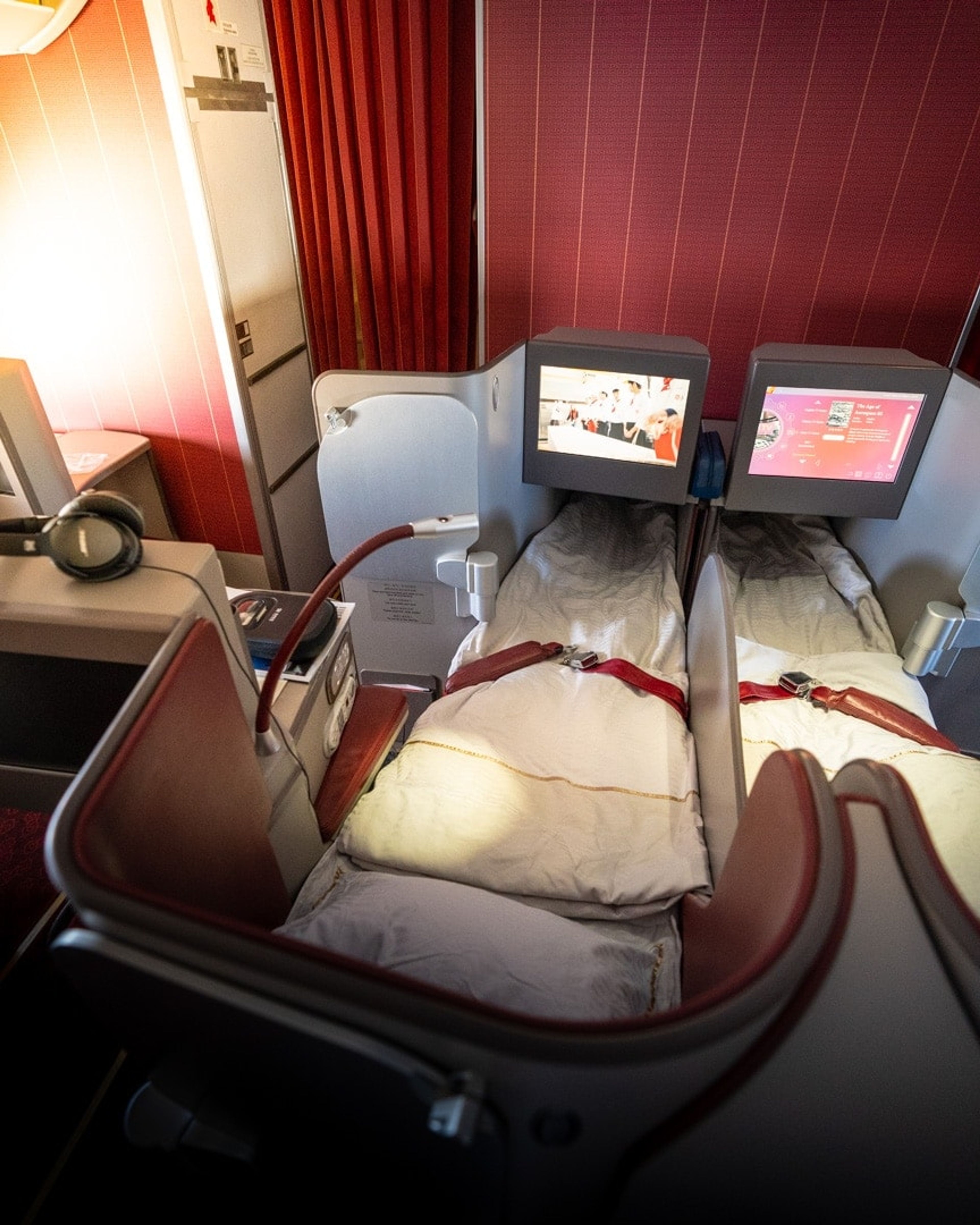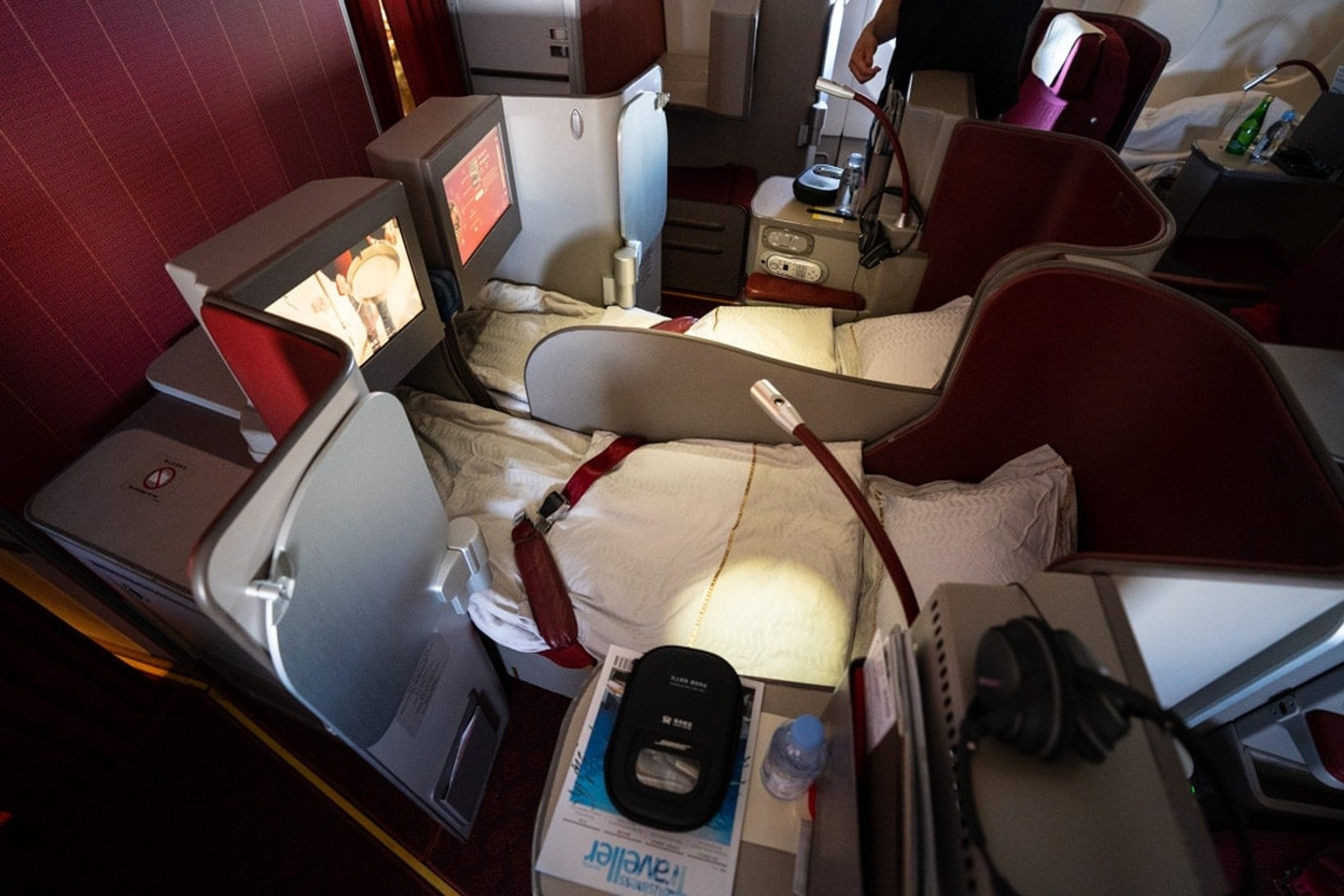 There’s a single business class cabin with 8 rows for a total of 32 flatbed seats. I personally found the seat very comfortable for lounging although if you’re a larger person, you might not share the same opinion.