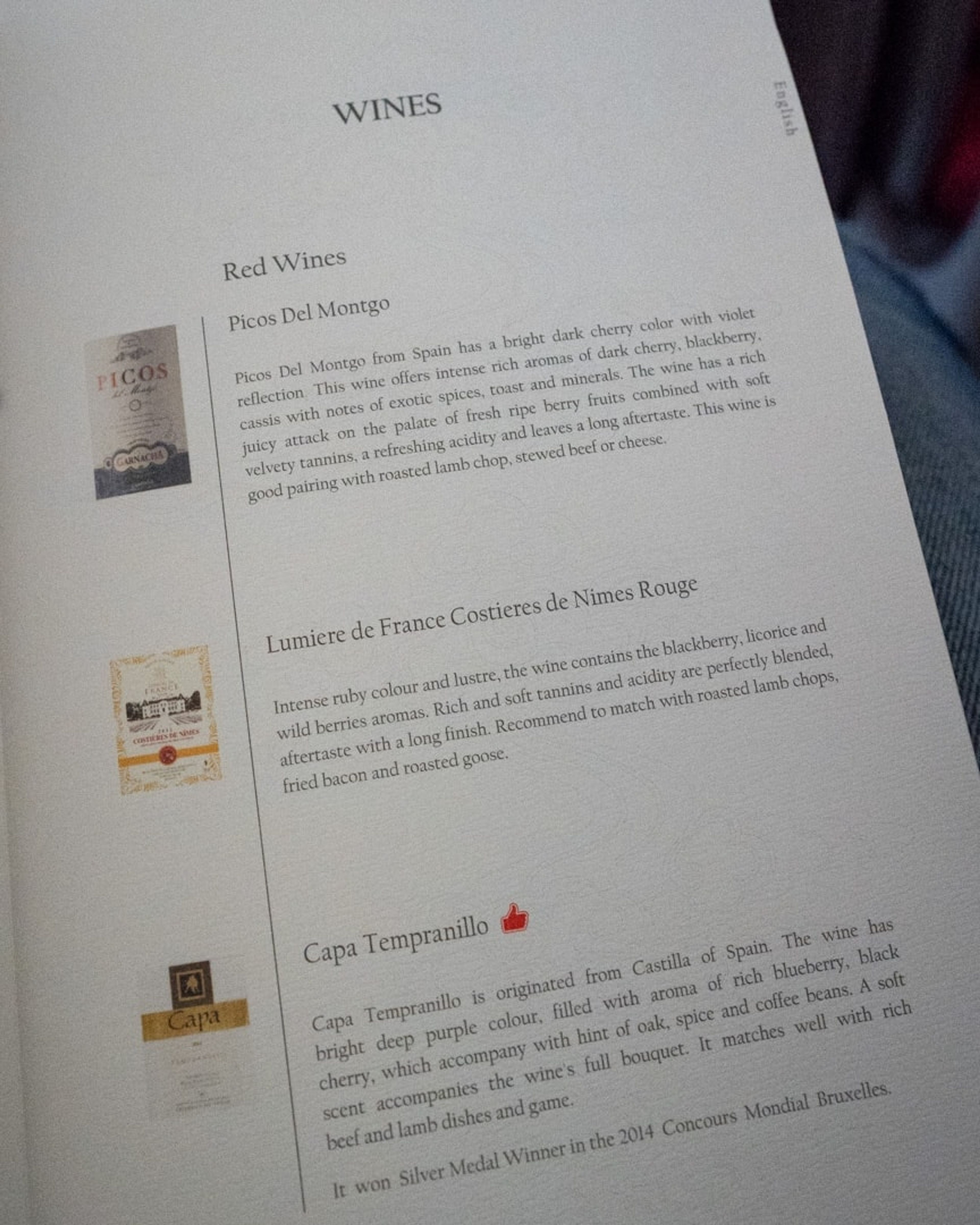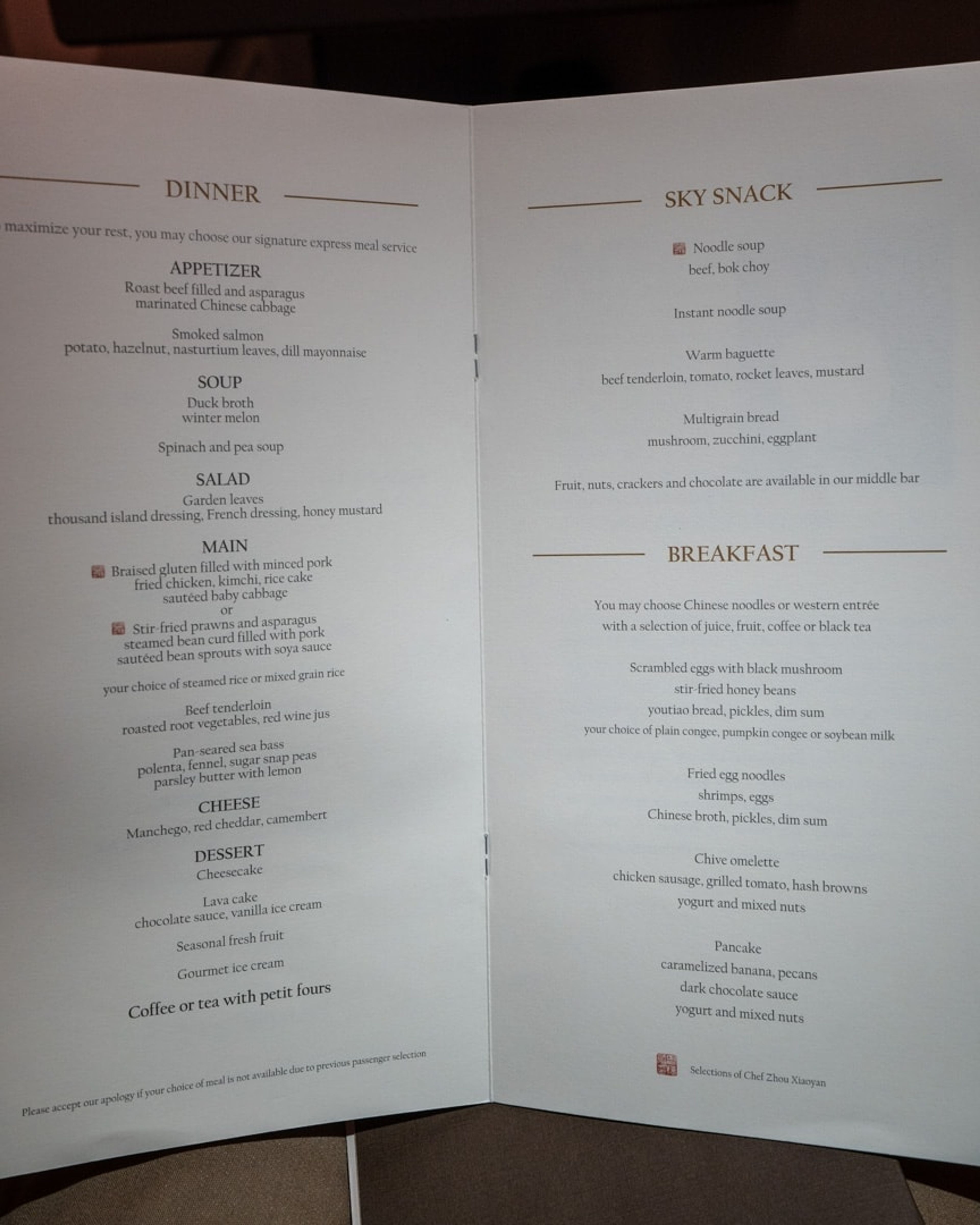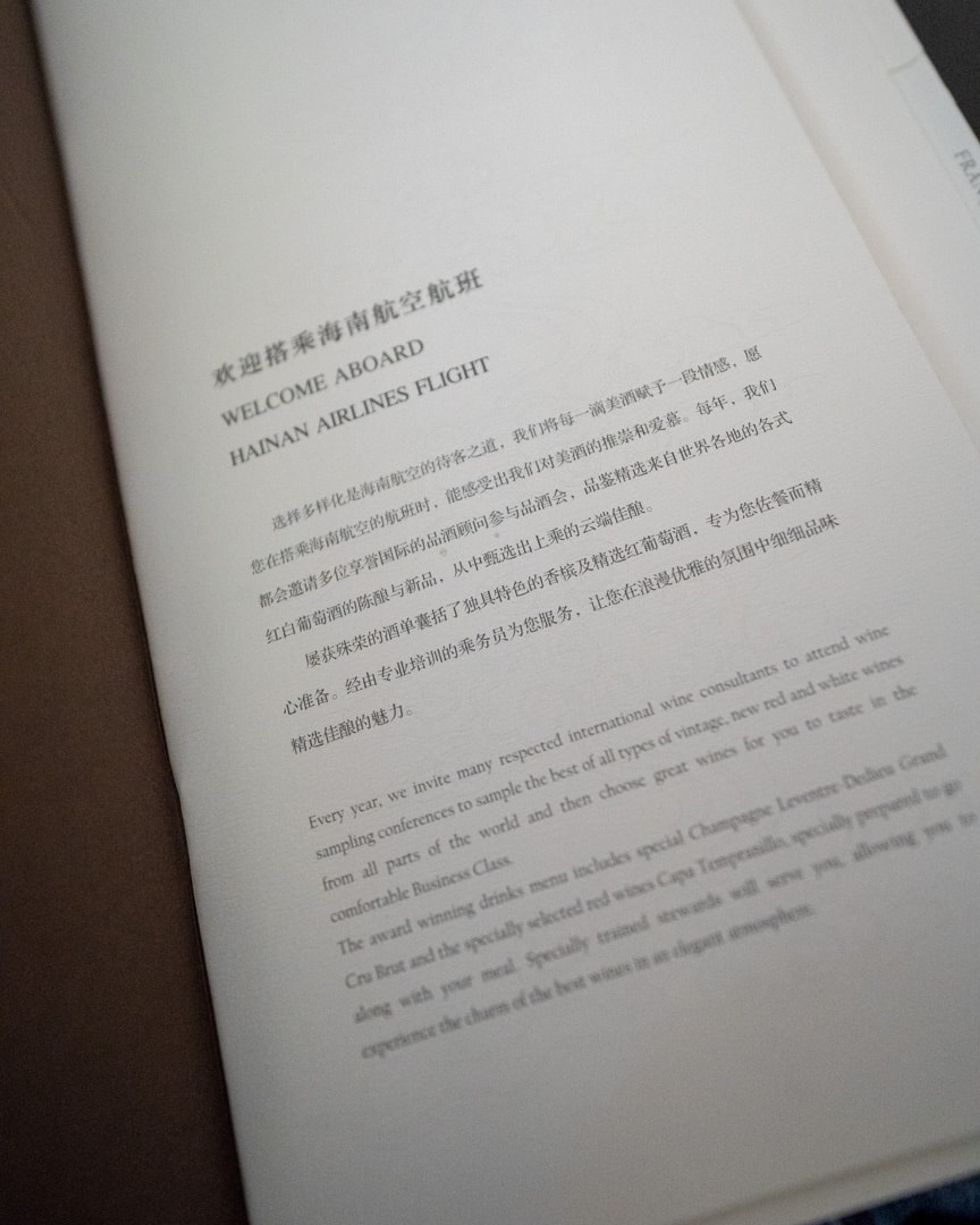 Having done some research on Hainan Airlines prior to our departure, I was looking forward to their F&B offering on board. Hainan Airlines has a dedicated sky-chef on all their international business class flights whose sole job it is to make sure you get the best possible food and drinks!