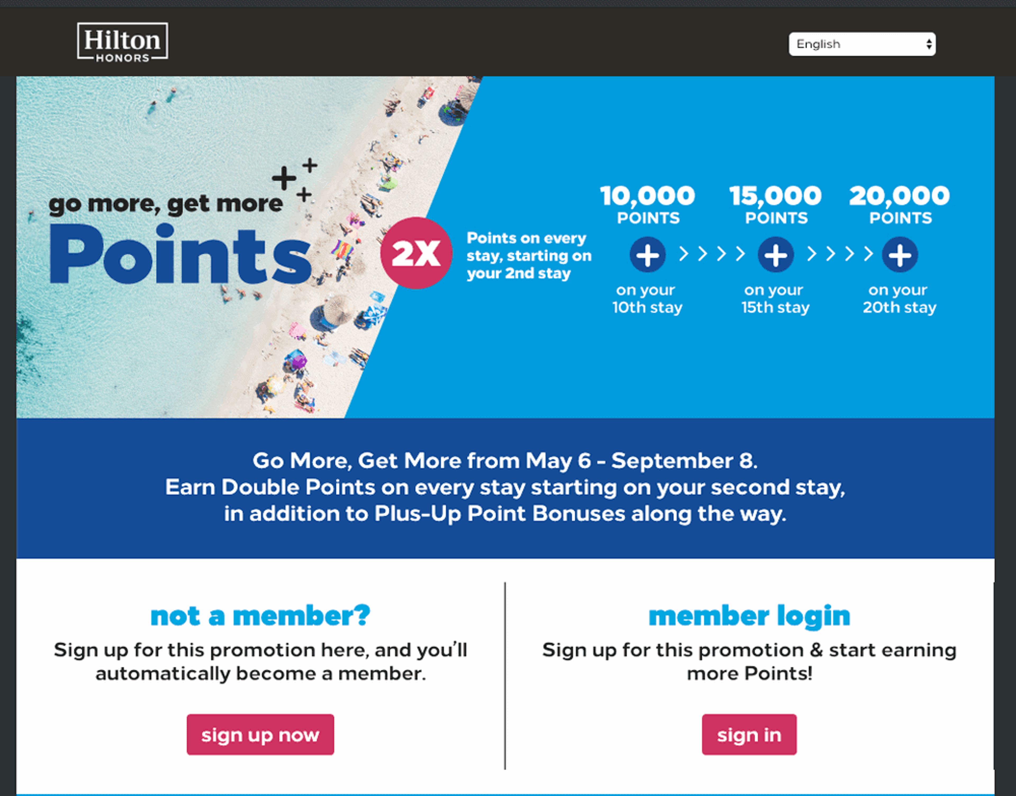 Hilton Honors have just launched their latest bonus points promotion called “Go more, get more”. In order to qualify for the promo, you will need to register here, and book stays between May 6 and September 8, 2019.