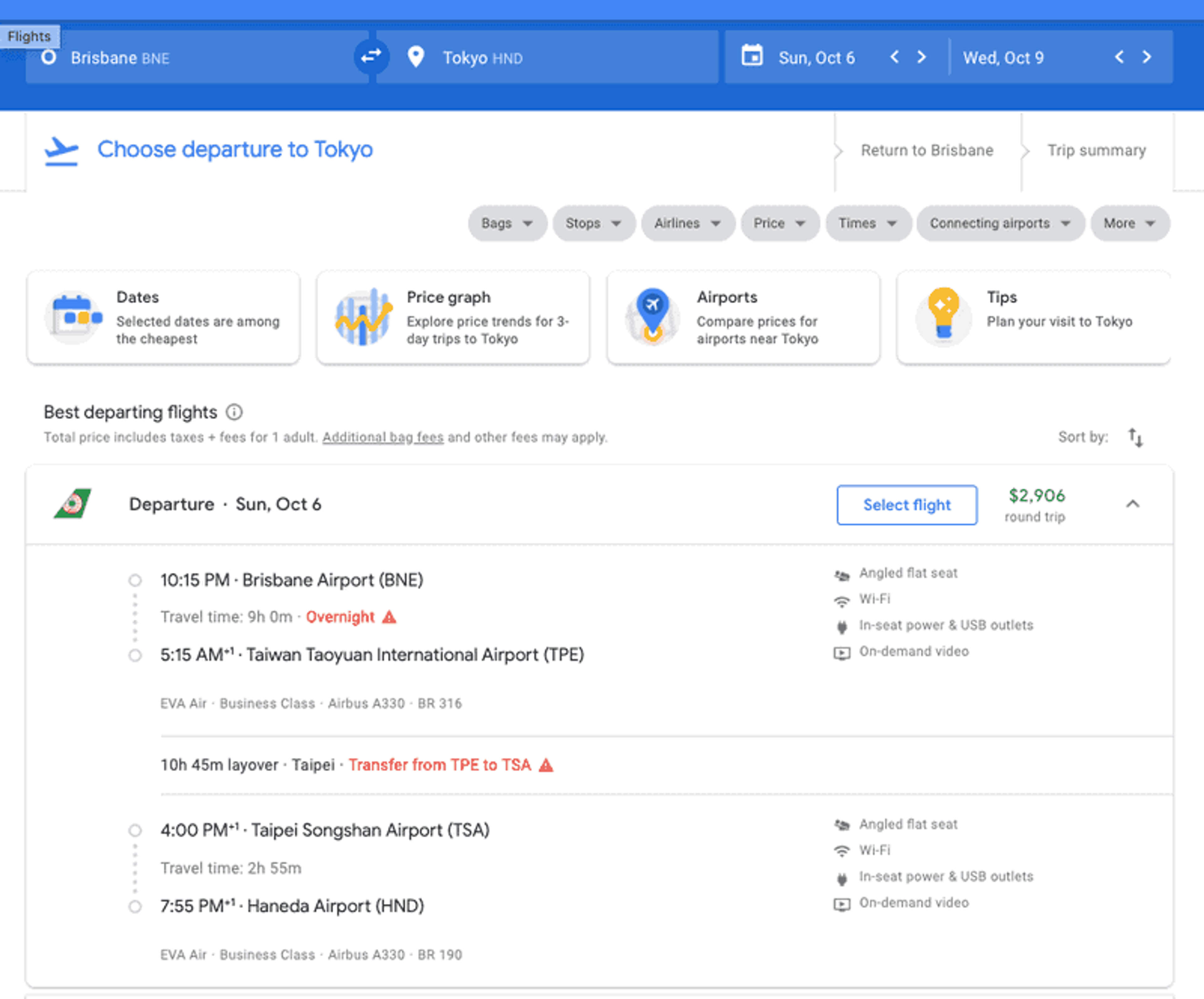 Brisbanites looking to head over for the Rugby World Cup also have a few options. Even cash fares in business class can be had for $2882 return in business class with EVA Air which gives you the opportunity to explore Taipei on a stopover. It’s not the most luxurious cabin with angled flat beds, but it sure beats flying in economy!
