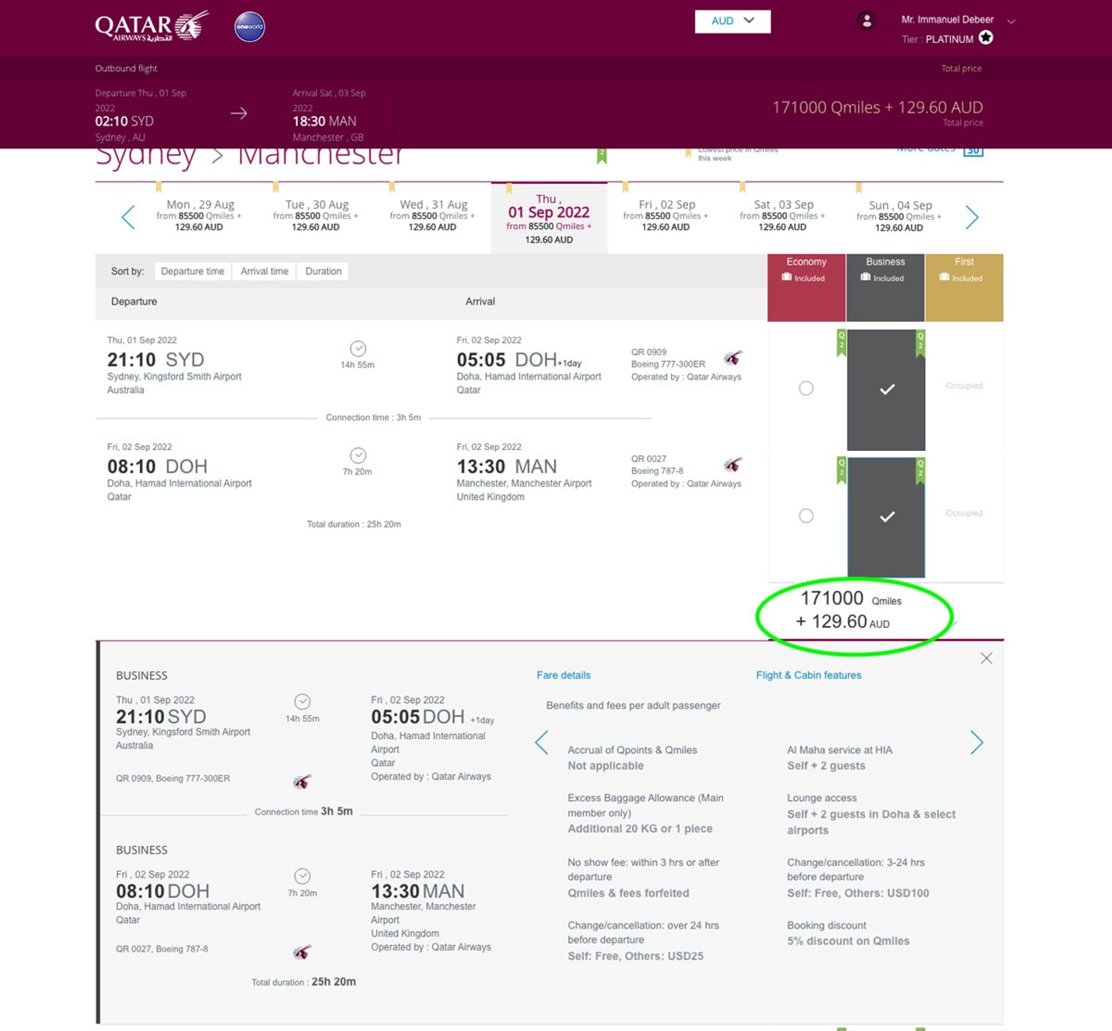It only takes 55 Qcredits to upgrade from Economy to Business on a Qatar Airways flight from Sydney to Europe (one way). Considering you get this benefit each year, you maintain status with Qatar Airways; it’s a very valuable perk!