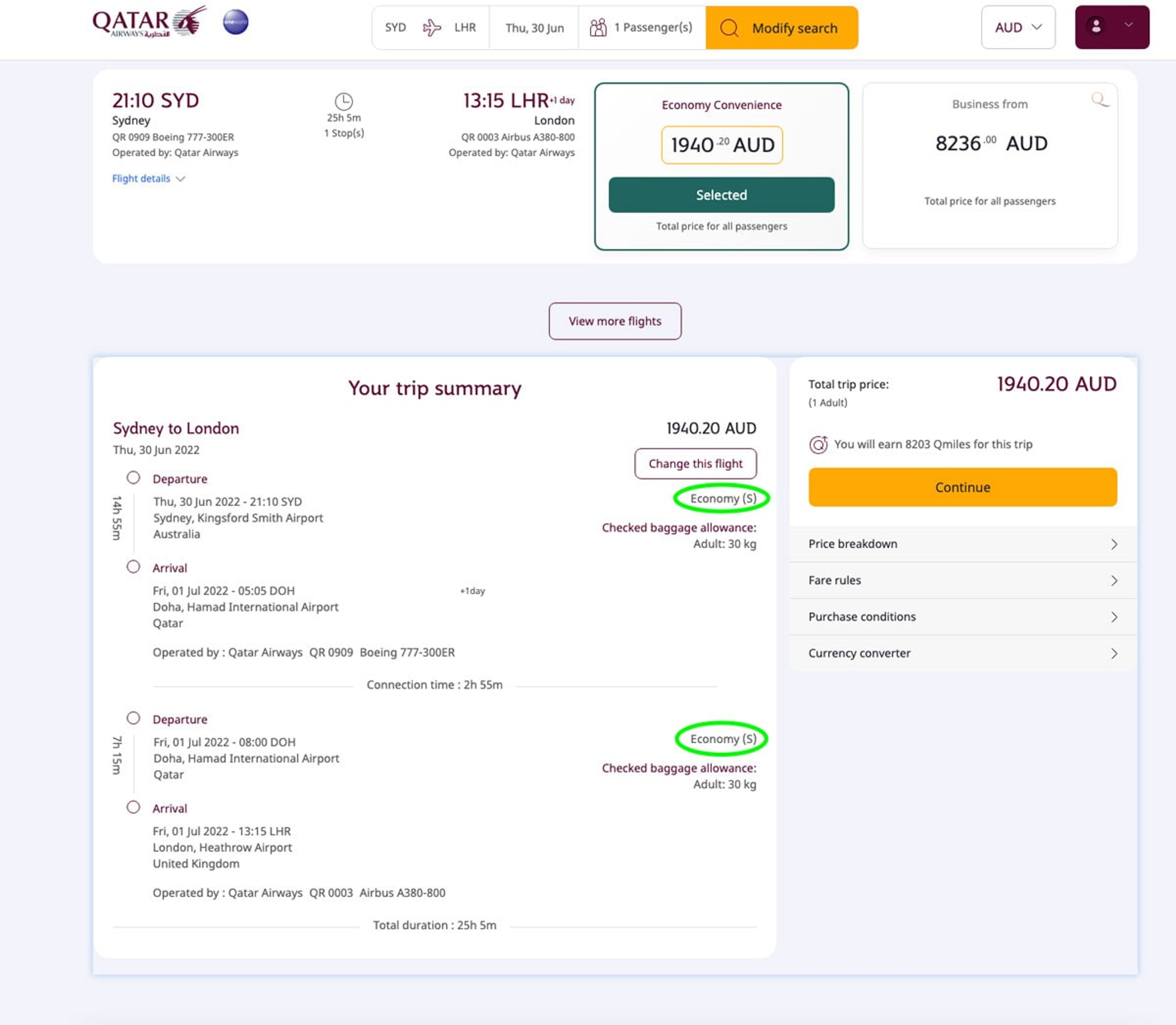 To find out which booking class of the flight you want to purchase, visit qatarairways.com and search for a flight. Once you have found one, click through on the fare type you want until you get to the following screen.