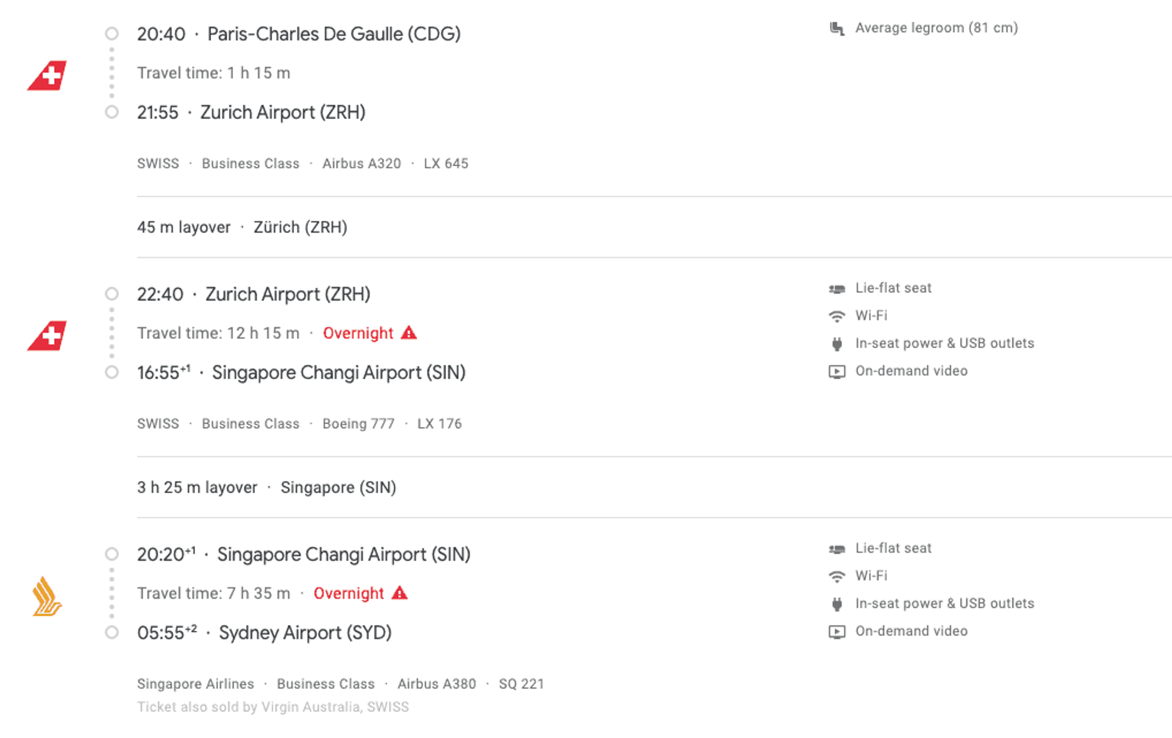 Flights to Brisbane are a mix of Swiss Airlines or Lufthansa and Singapore Airlines with prices starting around AU$1889 or $1731 if booked via Skyscanner.