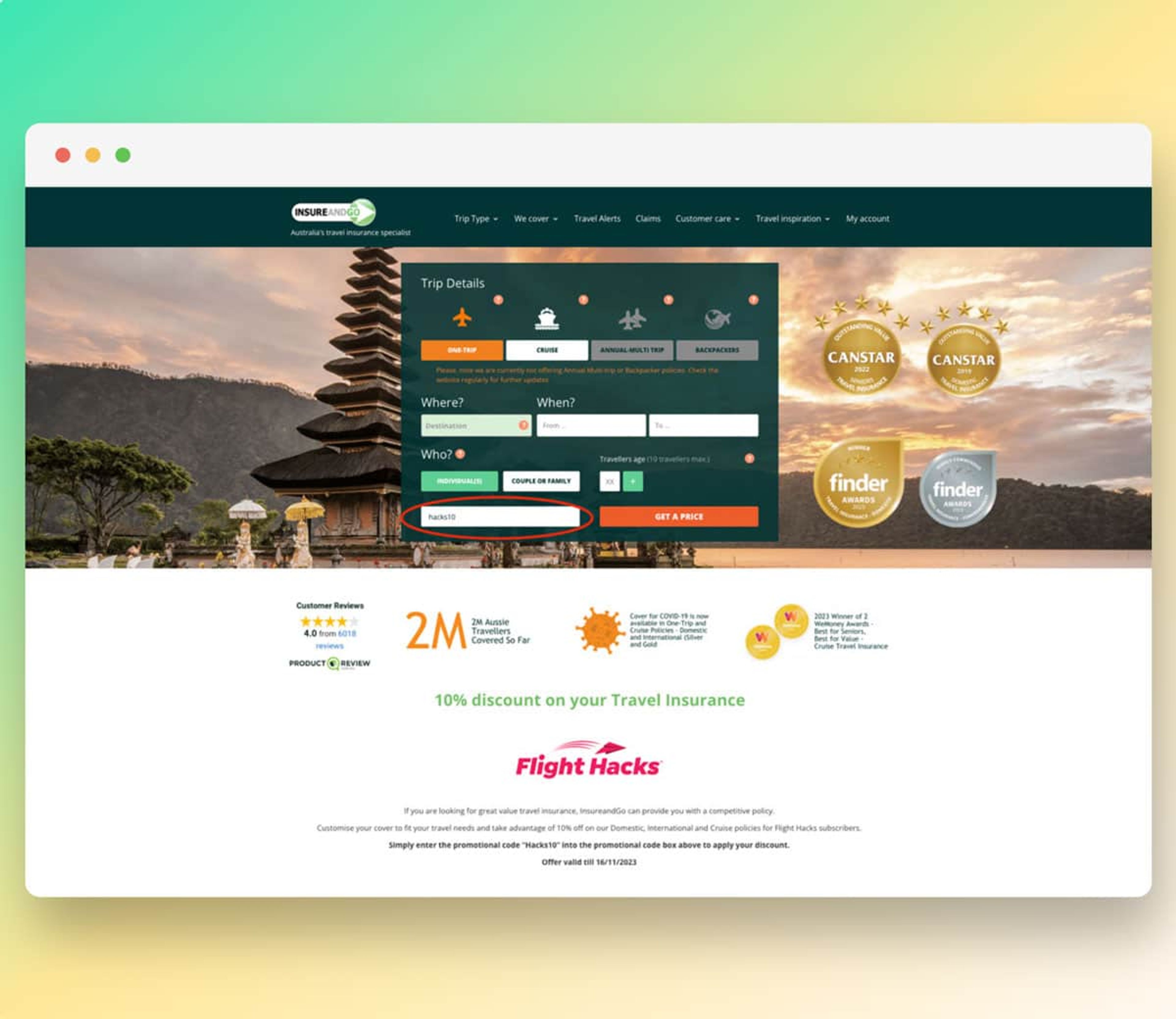 Some of the available promotional offers include percentage-based discounts on travel insurance policies. At Flight Hacks we've got an exclusive 10% InsureandGo promo code to help you save on your travel insurance.