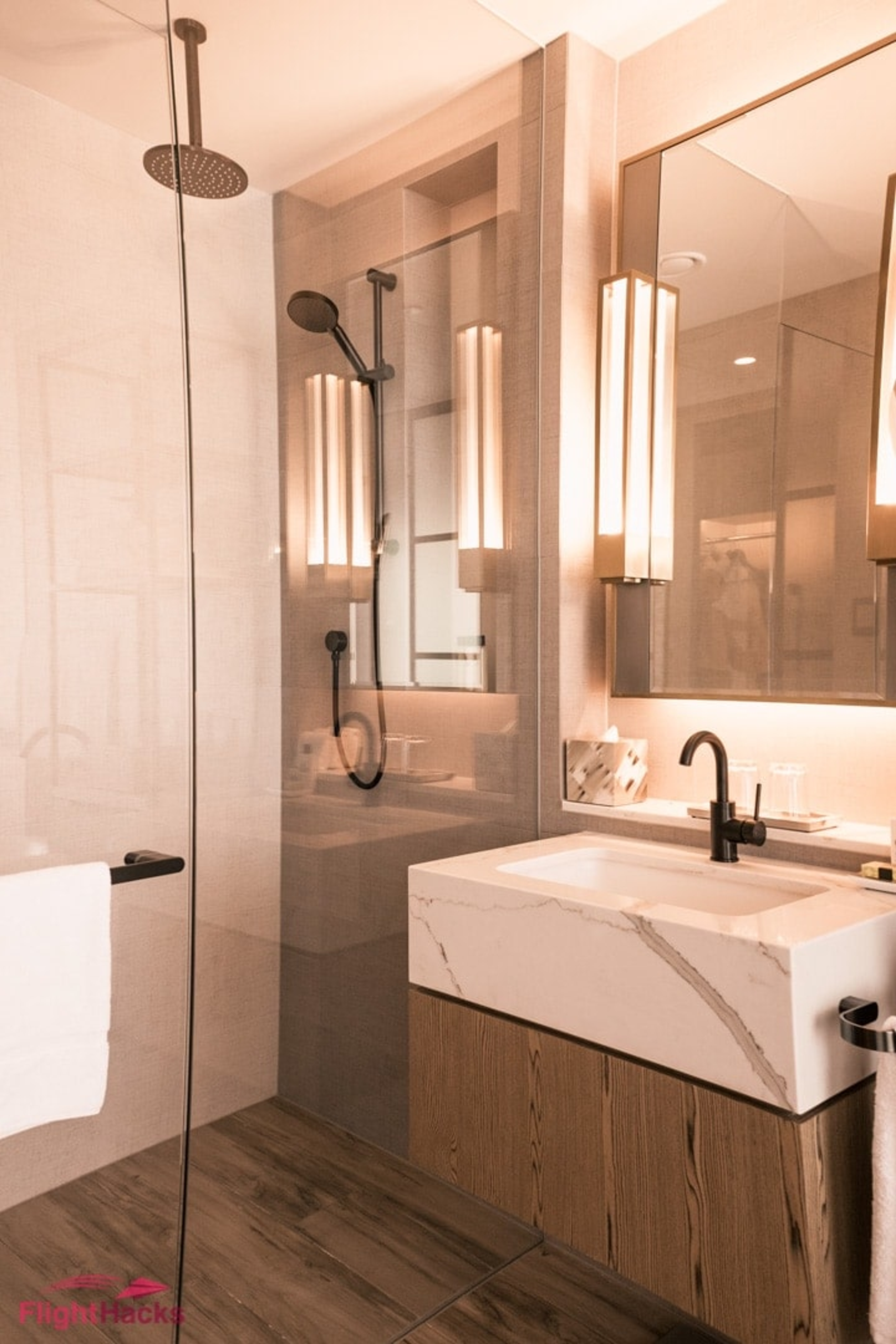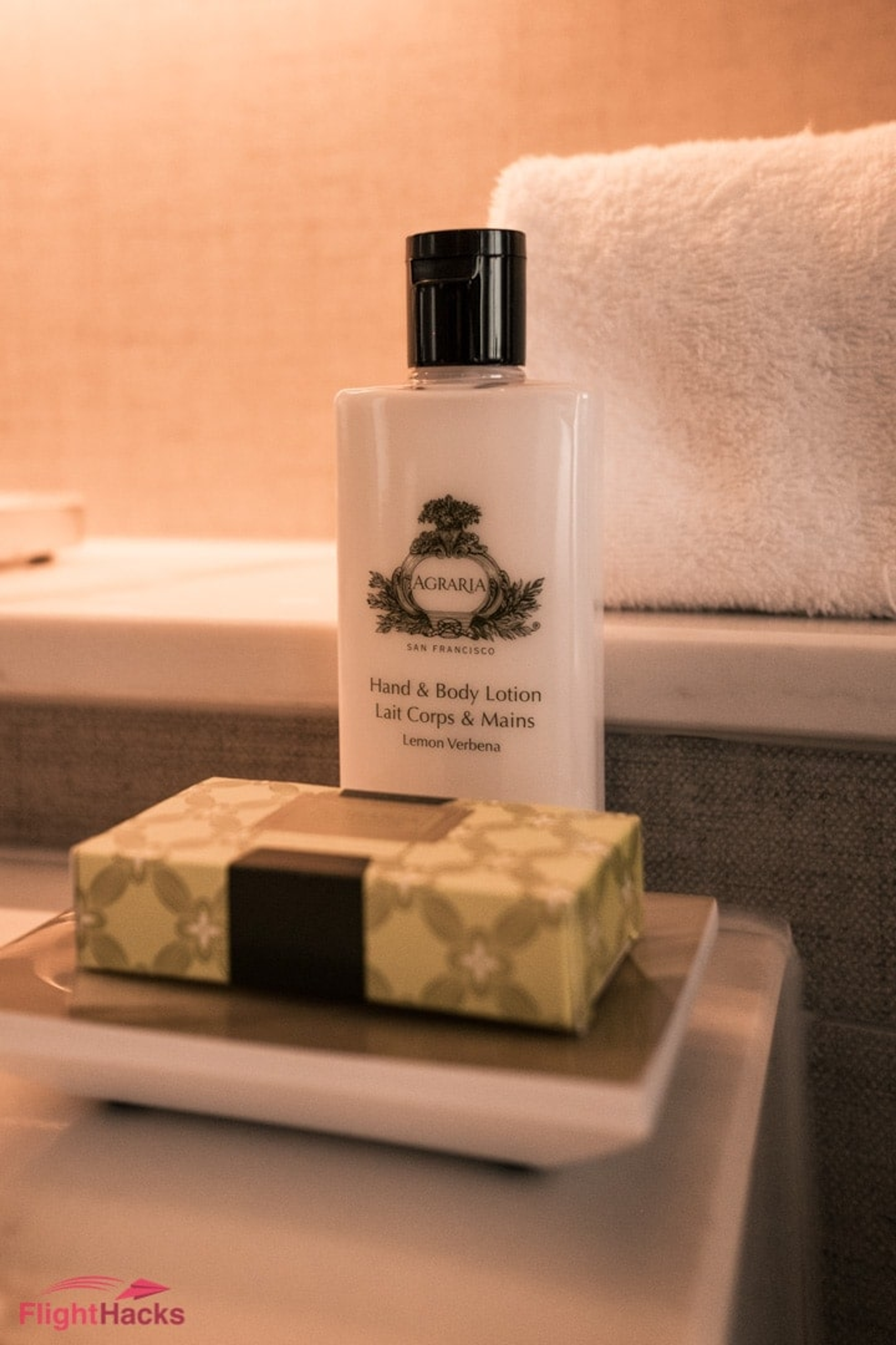 The shower was equipped with both a rain-shower and a regular shower head for those that prefer it. Bath products were from Agraria San Francisco and all came in massive bottles by any hotel standards.
