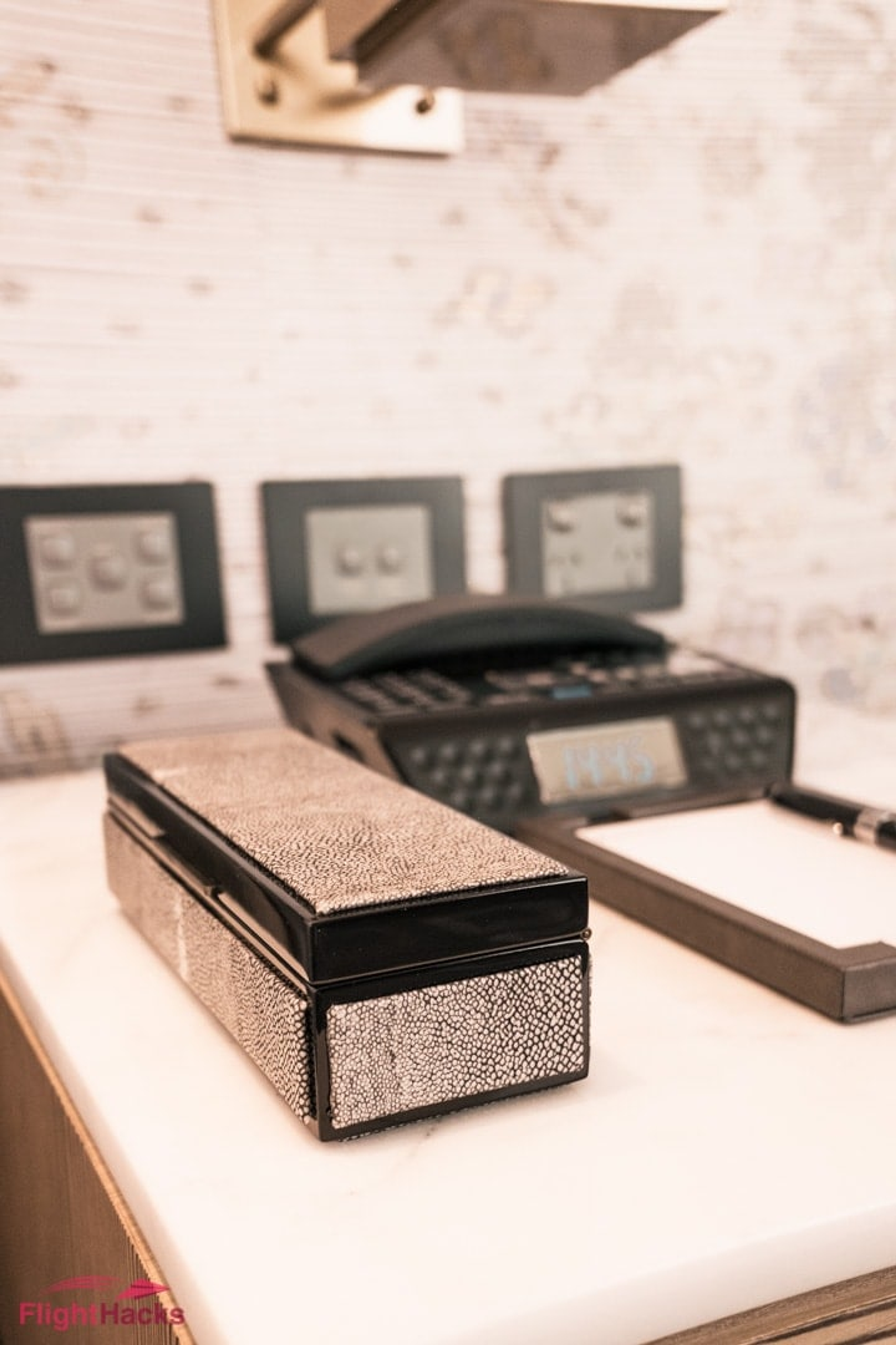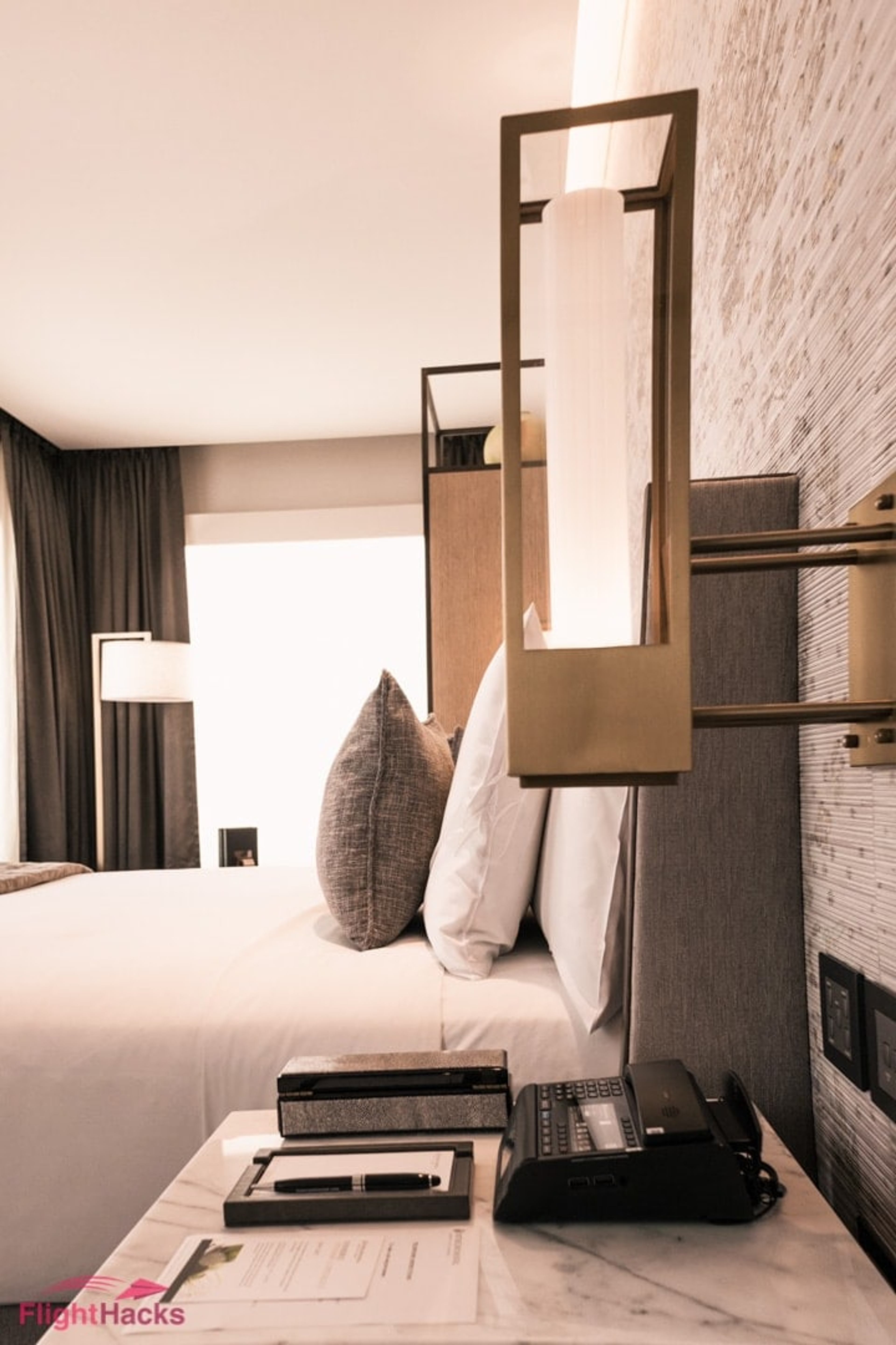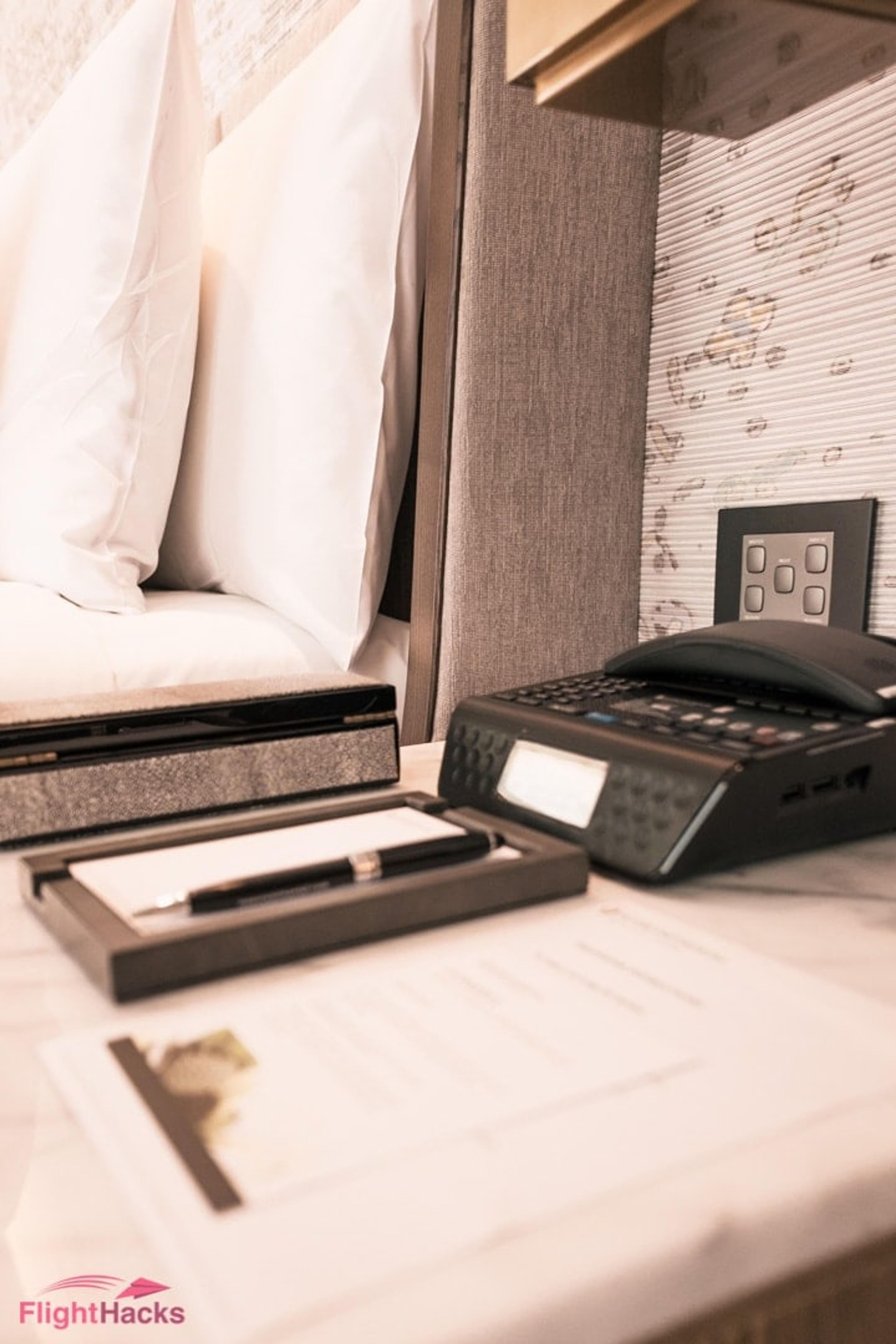 Unfortunately, the linen wasn’t of the highest quality, and I suspect it’s provided by some local laundry company. For a 5 star hotel, I do expect 5-star linen. The room was equipped with a massive flat screen TV by Samsung fully customised to incorporate the IC design. The bedside tables were made of stone with gold details and had a mini Marshall amp to play some music from your phone with easy Bluetooth pairing.
