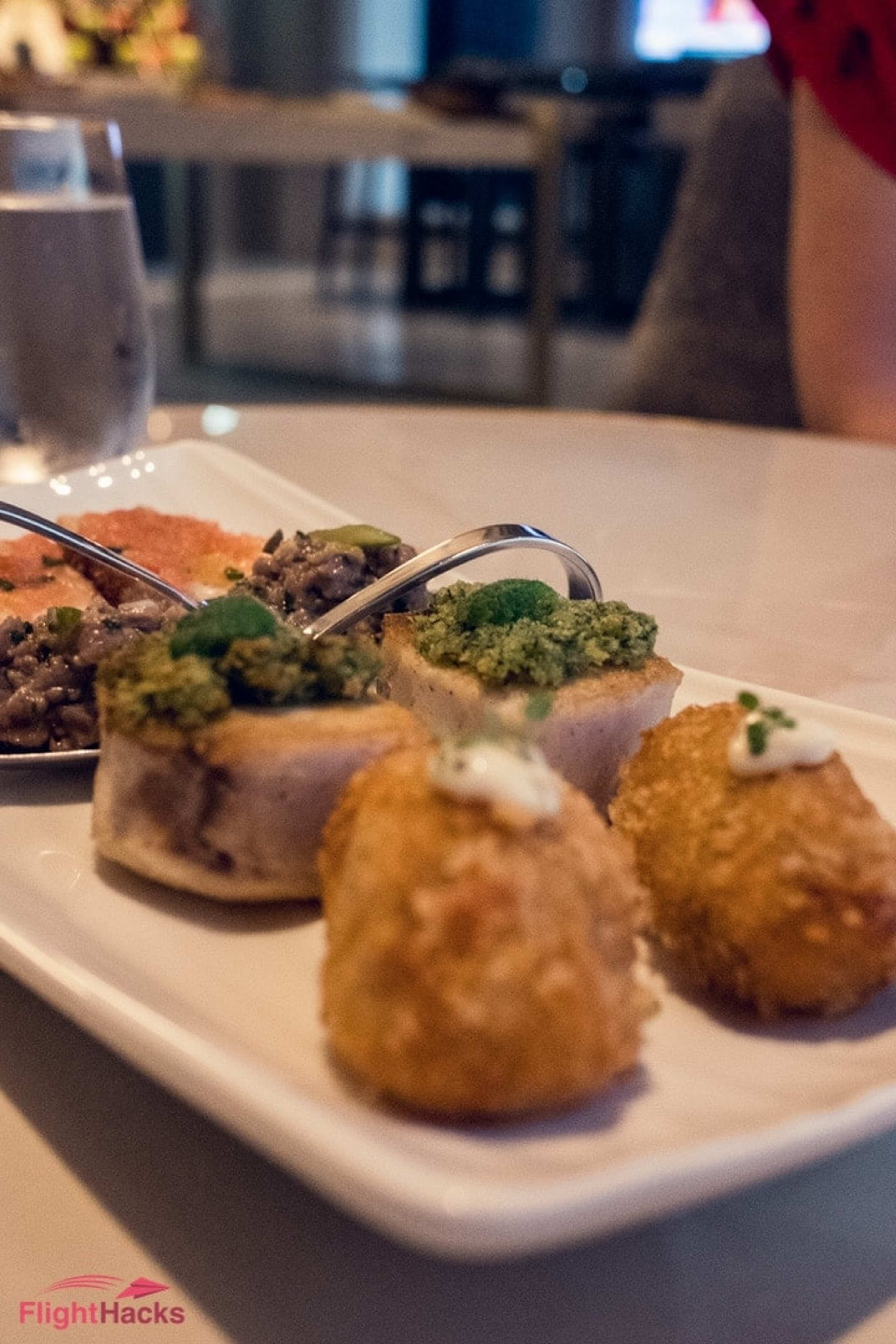 If you opt for a club room, you get complimentary access to afternoon tea, evening drinks with canapes and breakfast. There was a good selection of cold meats, and cheeses available and staff also brought out some hot tapas from the Spanish restaurant downstairs at which we had dinner later – highly recommended.