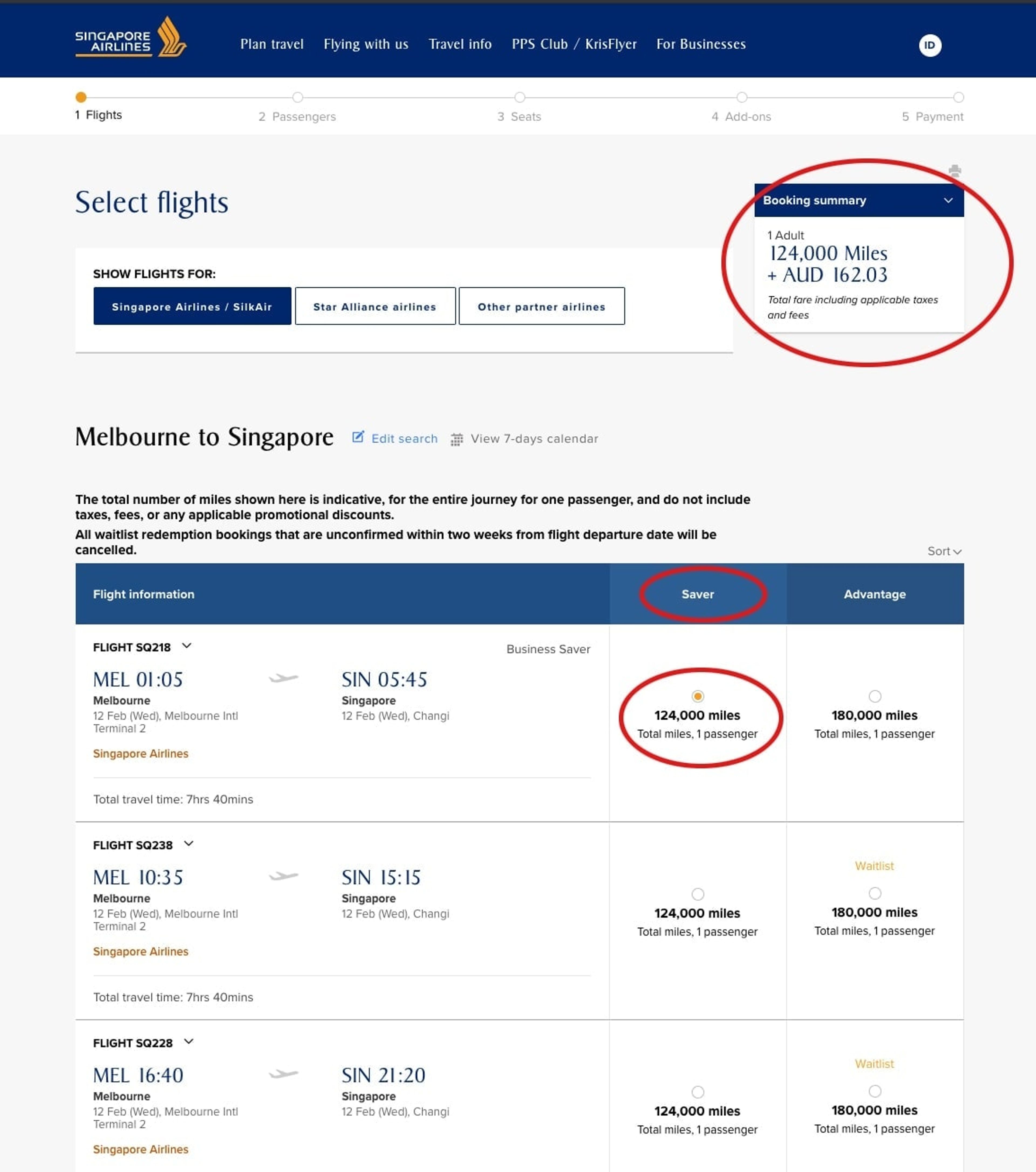 Note that KrisFlyer will always show the total miles if you selected a return itinerary. In the example above, 124k is the total for a return ticket and so are the taxes. A 1-way ticket would require half of the miles.