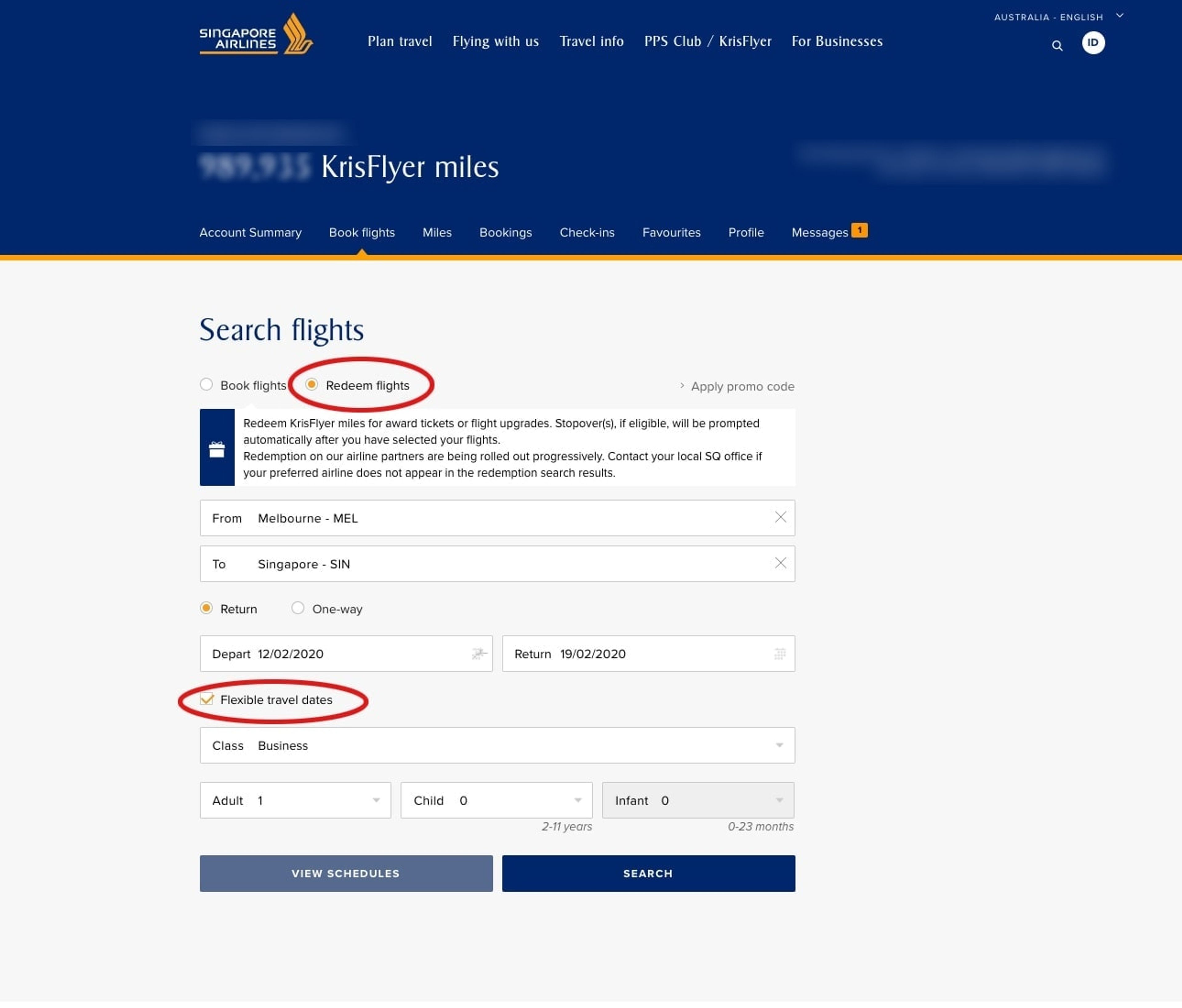 1. Make sure you select “Redeem flights” instead of “Book flights”. Then enter all the required fields and click “Search”.