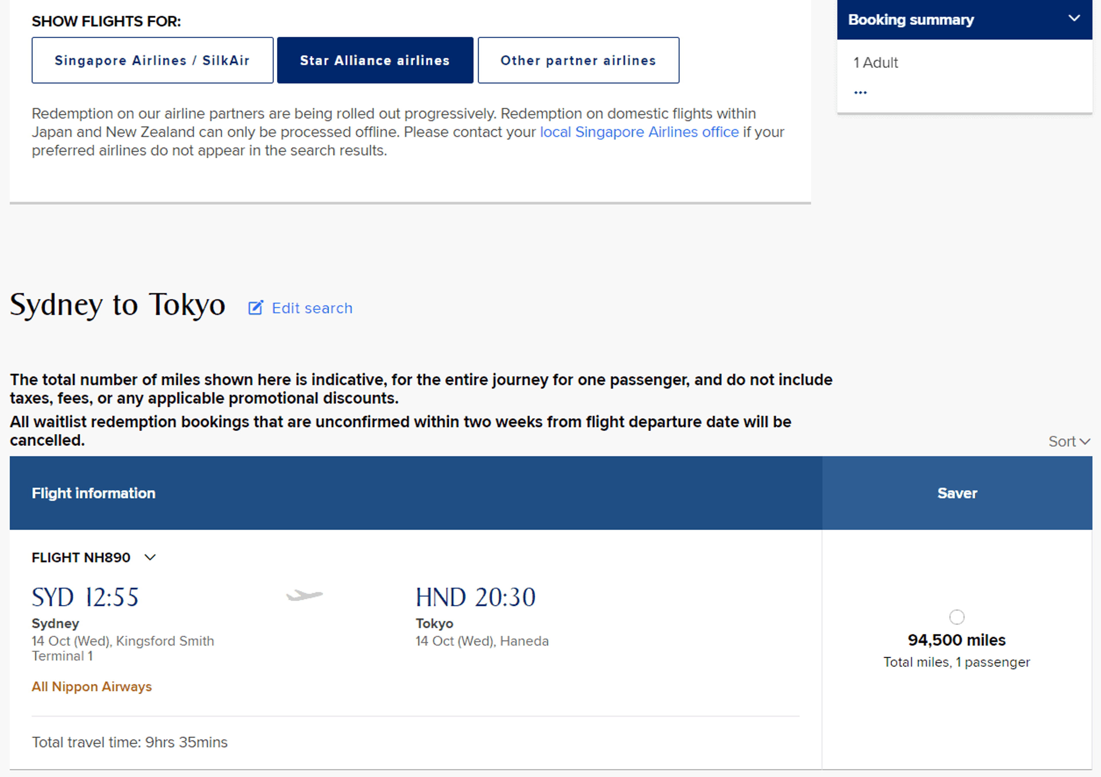 The next page will display individual flight details. In this example, I wanted to fly direct from Sydney to Tokyo with ANA, so I needed to select the ‘Star Alliance airlines’ option at the top. Remember, you must find flights with Saver availability.