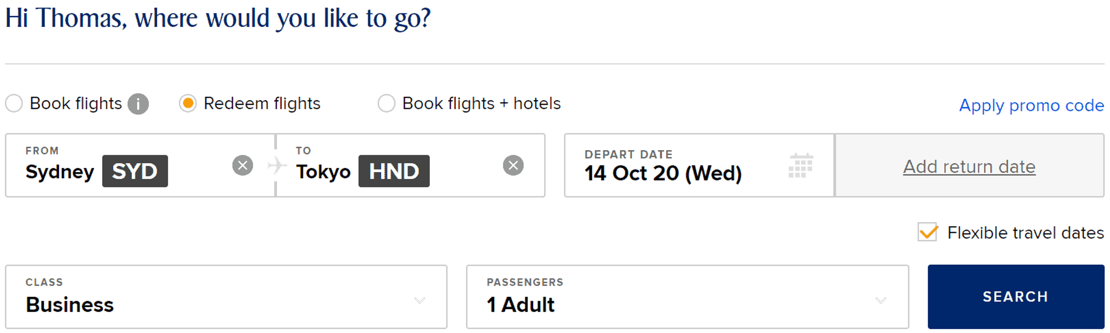From the homepage, simply enter your proposed flight details and travel class, and ensure ‘Redeem flights’ is selected at the top. Also, check the ‘Flexible travel dates’ box to make finding availability easier. Then click ‘search’.
