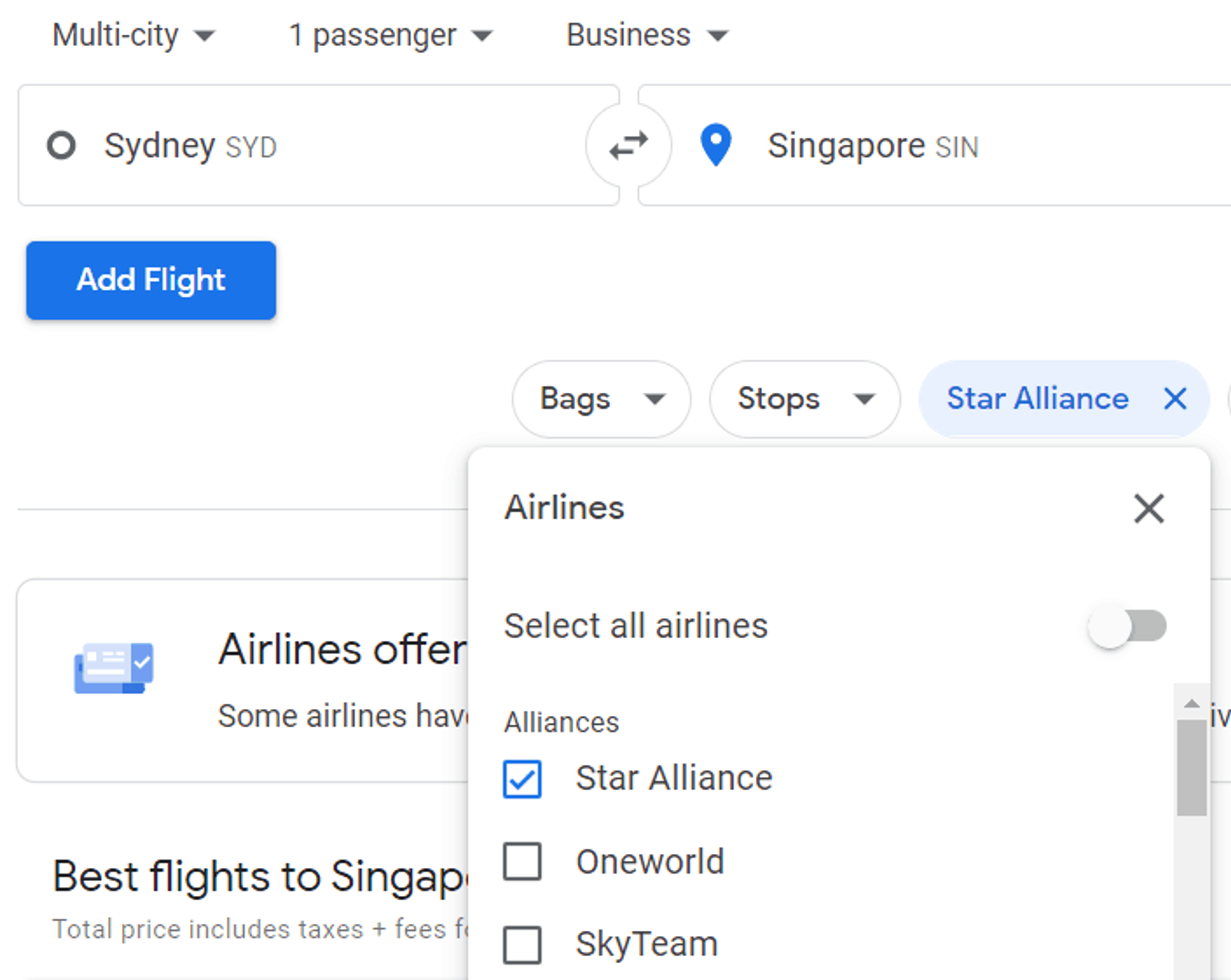 Firstly, you can use Google Flights to filter results by Star Alliance airlines to get an idea of your possible routing options. To do this, simply click on the “Airlines” tab and then select Star Alliance.