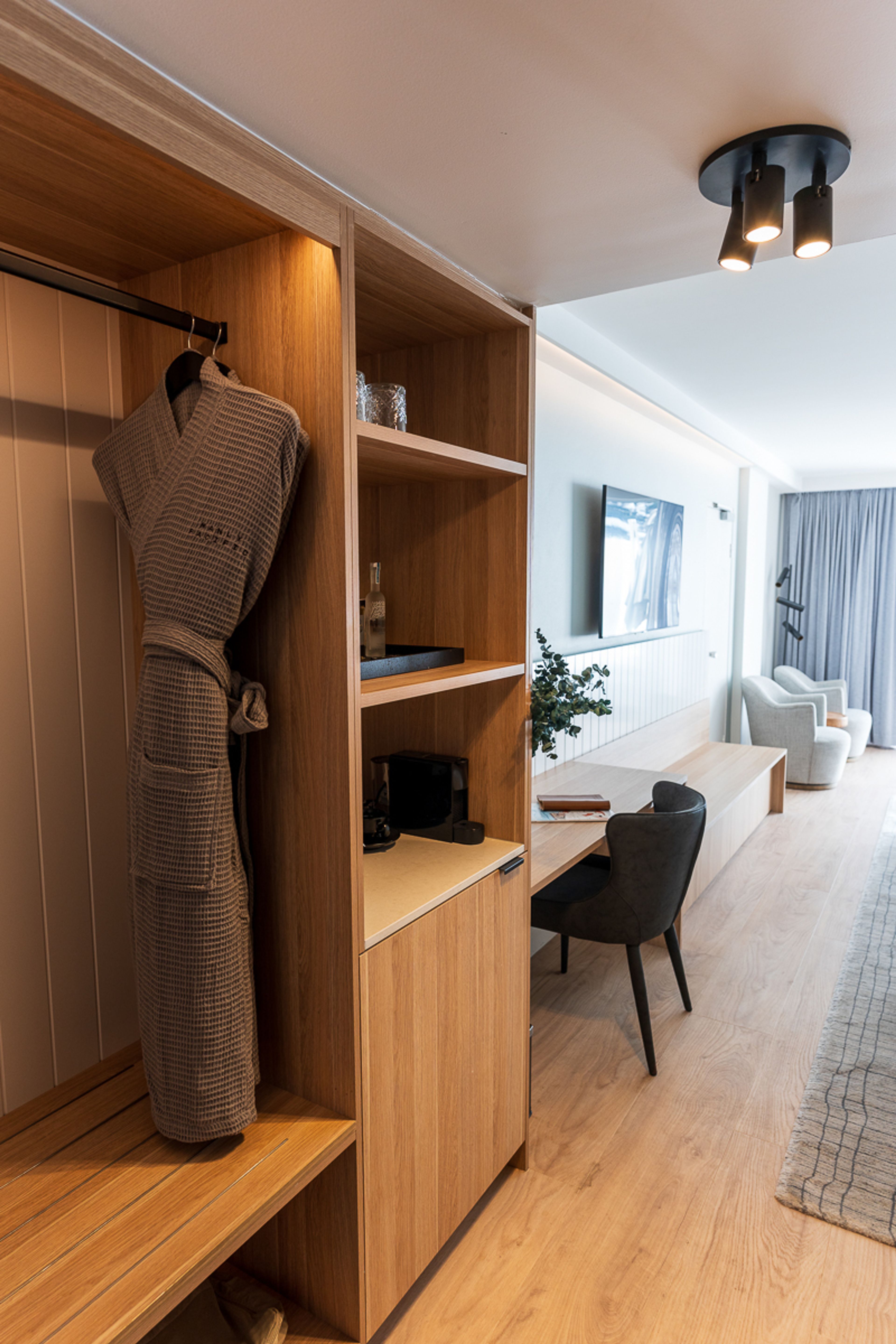 Hanging space was found in the hall, with a small area for work and space to flat-lay a suitcase below the TV. When it’s a little chilly out on the terrace, two swivelling armchairs sit beside the sliding door.