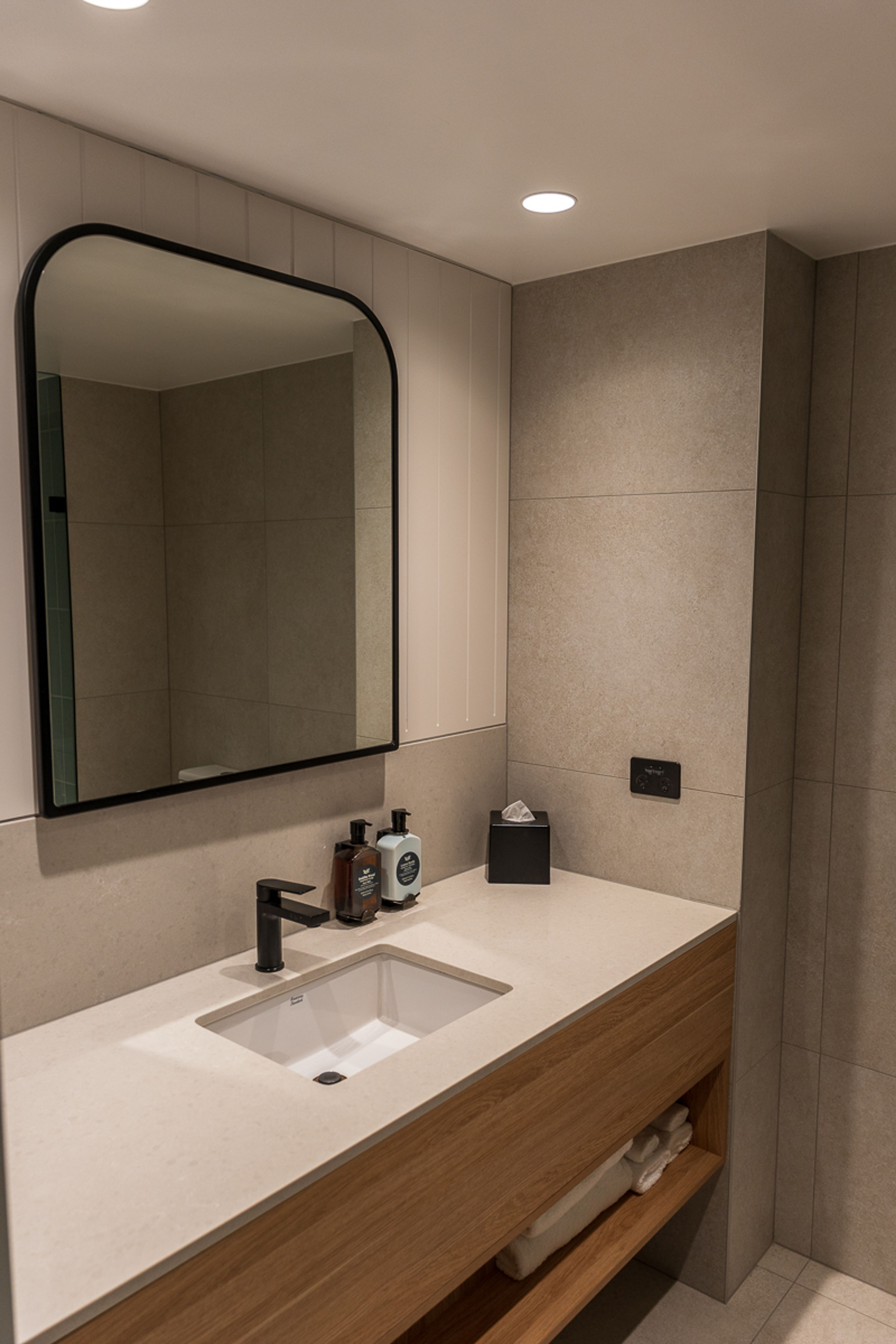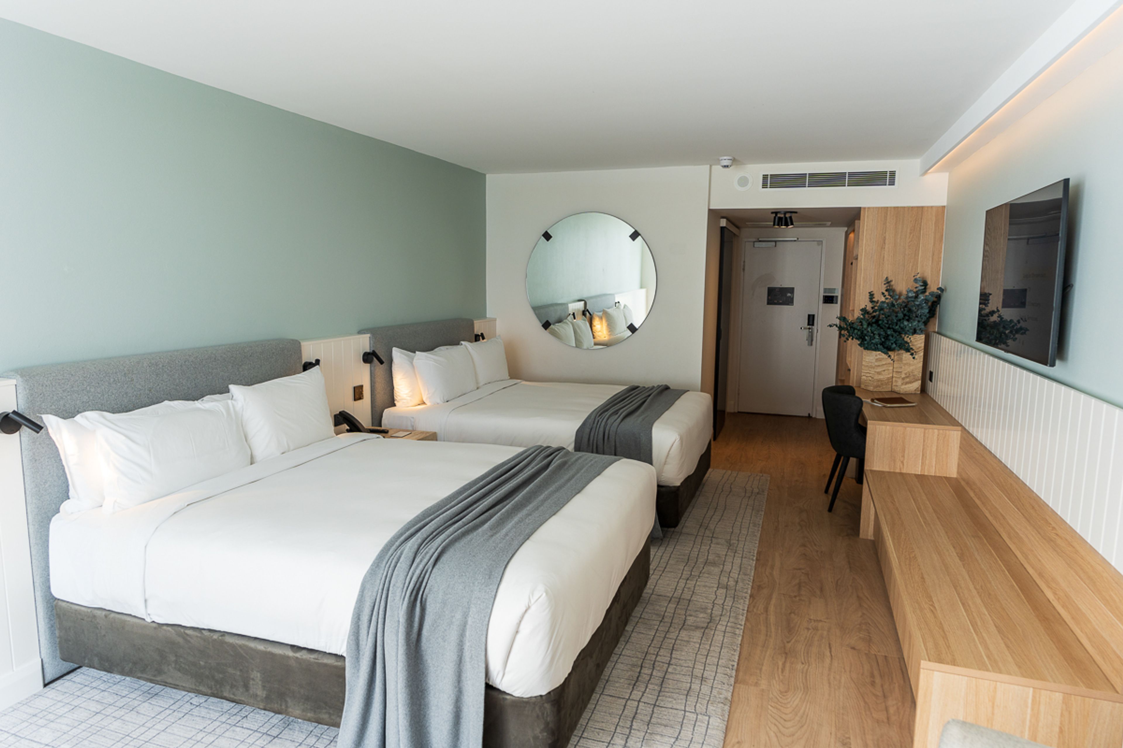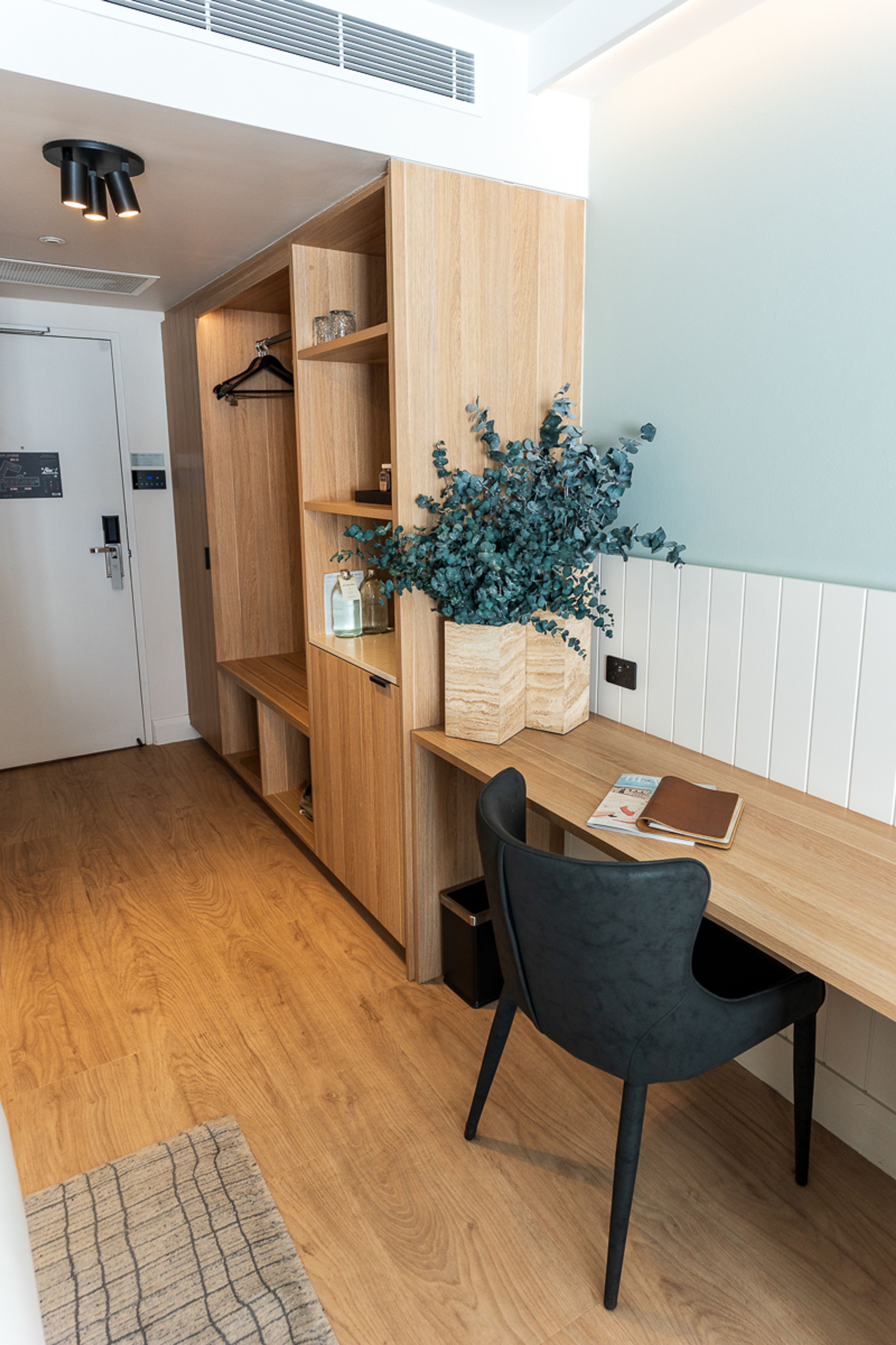 Every detail whispers ‘relaxation’ from the Double Ocean Terrace. It’s got the vibe of a stylish beach house, with bleached tones that mirror the sand and sea leaning the space towards Scandi coastal. Pale timber floors and warm wooden cabinetry create a soothing backdrop and are echoed from common spaces, as is the scent from live Baby Blue Eucalyptus leaves.