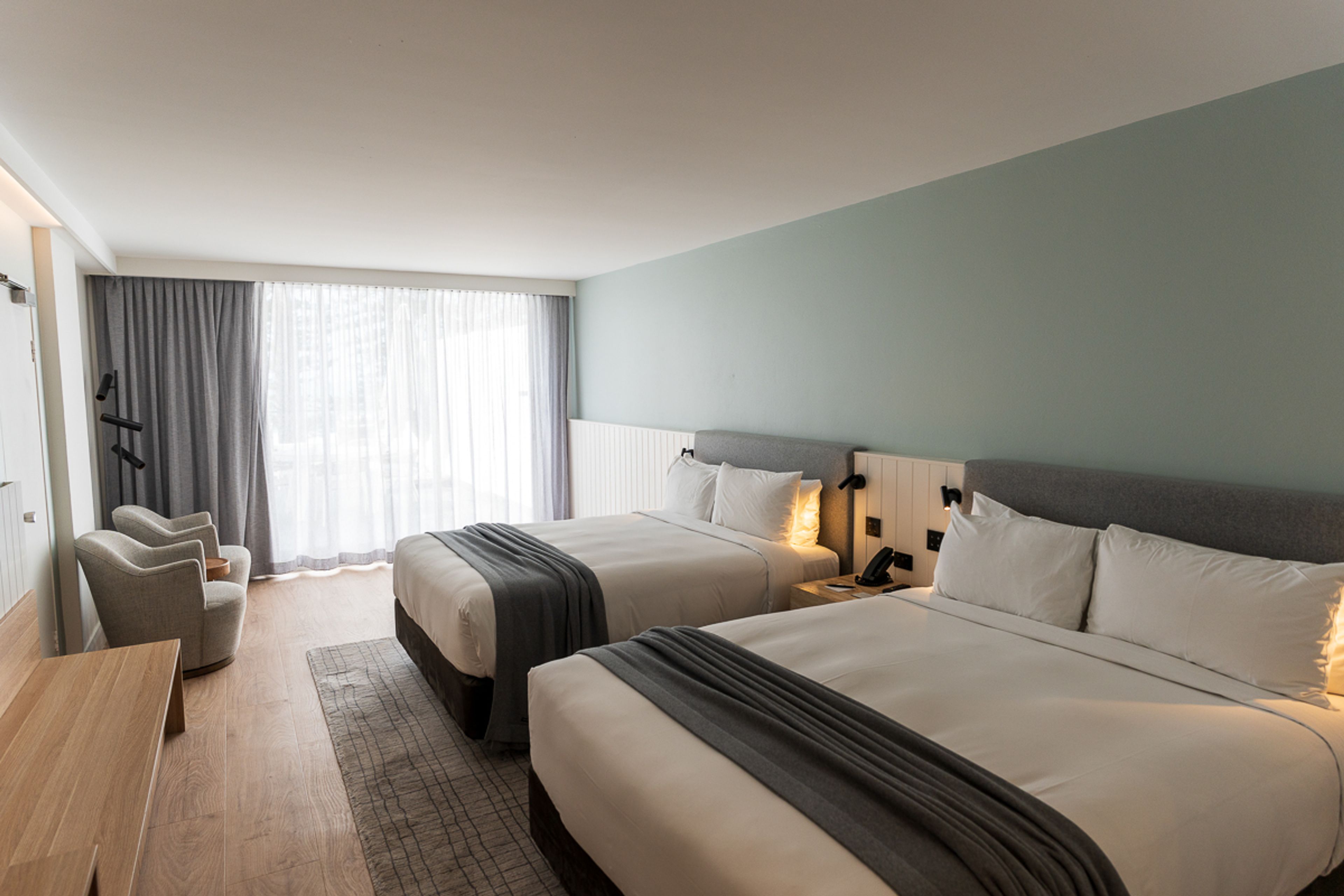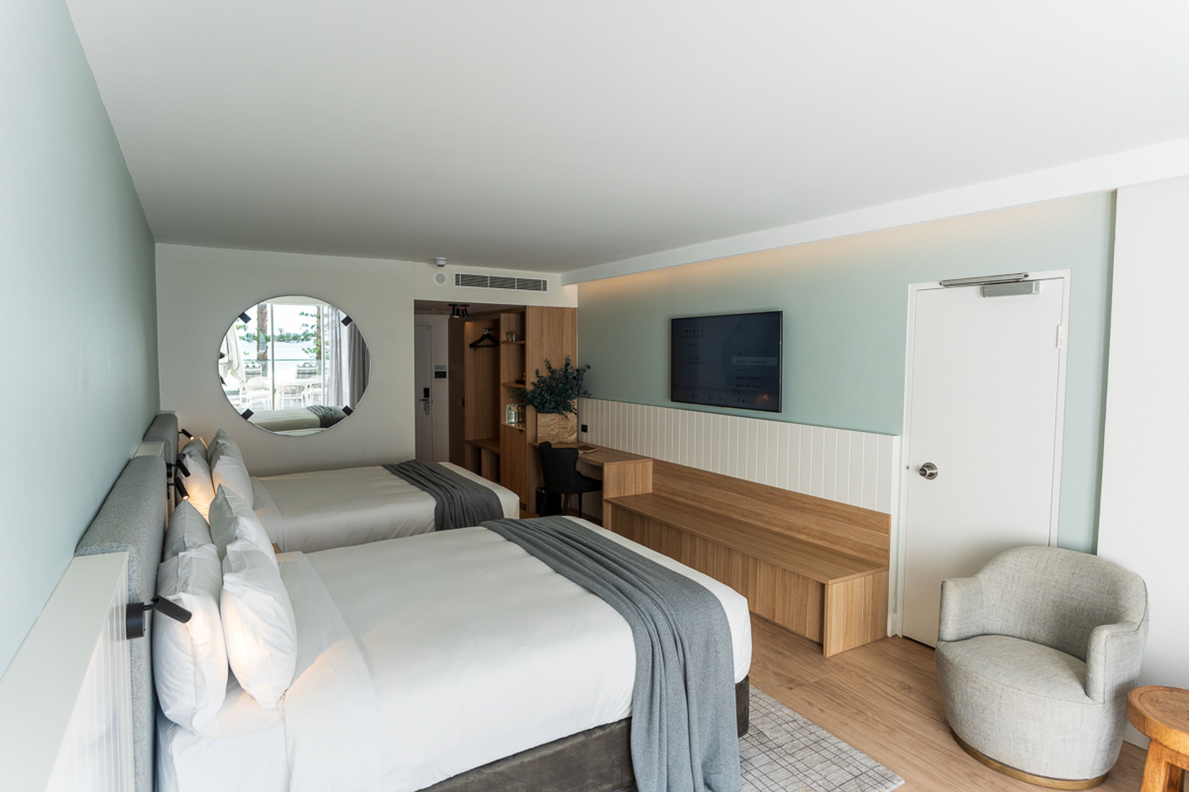 Snow-white panelling and concrete grey fabrics bring texture and comfort, as the beds take centre stage. The linen and pillows at Manly Pacific are high quality, as you might expect.