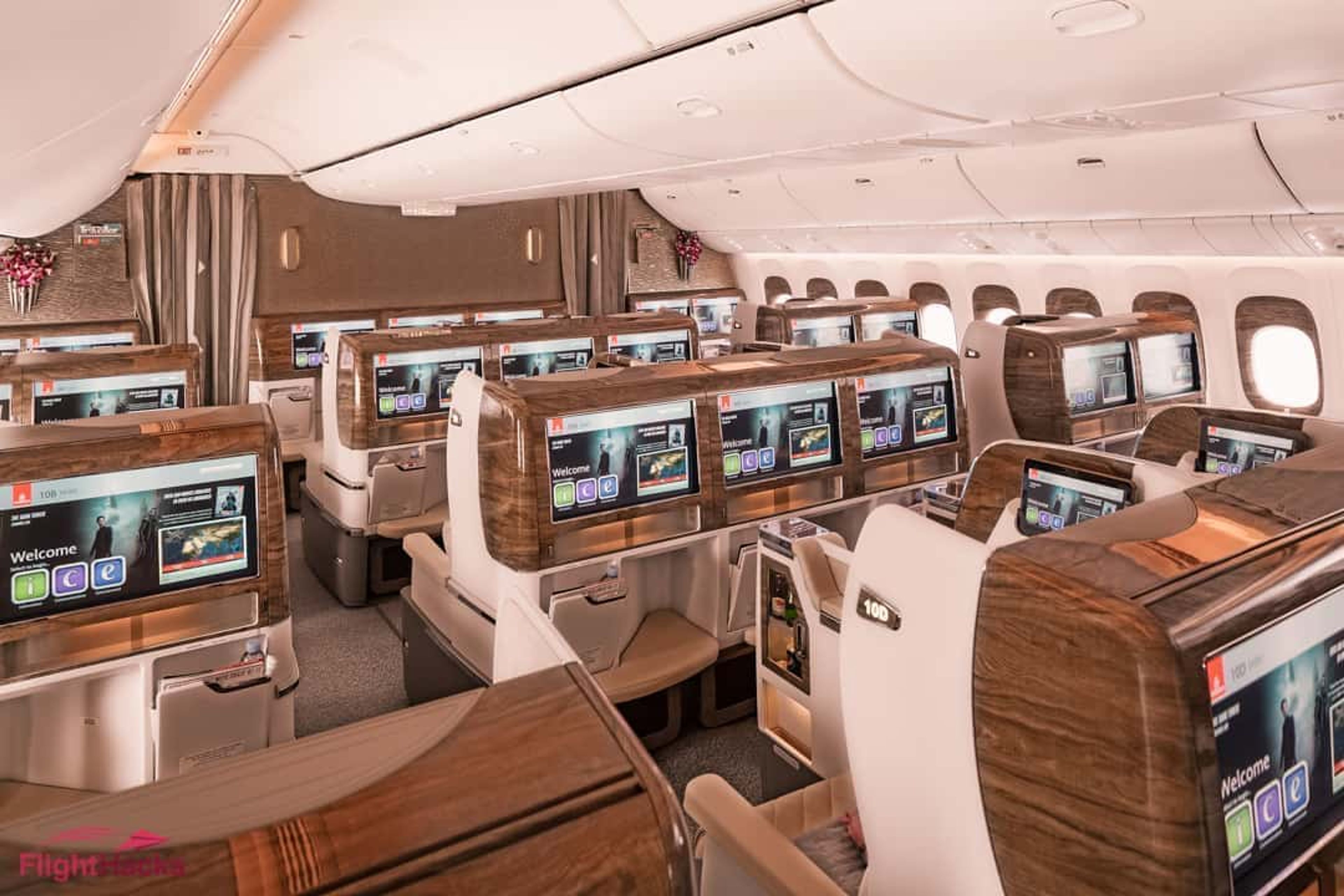 The new business class is still a disappointing 2-3-2 layout which is not very common anymore. On the upside, the seats do look very nice featuring a diamond stitch pattern on the full leather cover, and at least the recline is fully flat in comparison to the sloping seats in the previous generation of 777 Emirates jets.