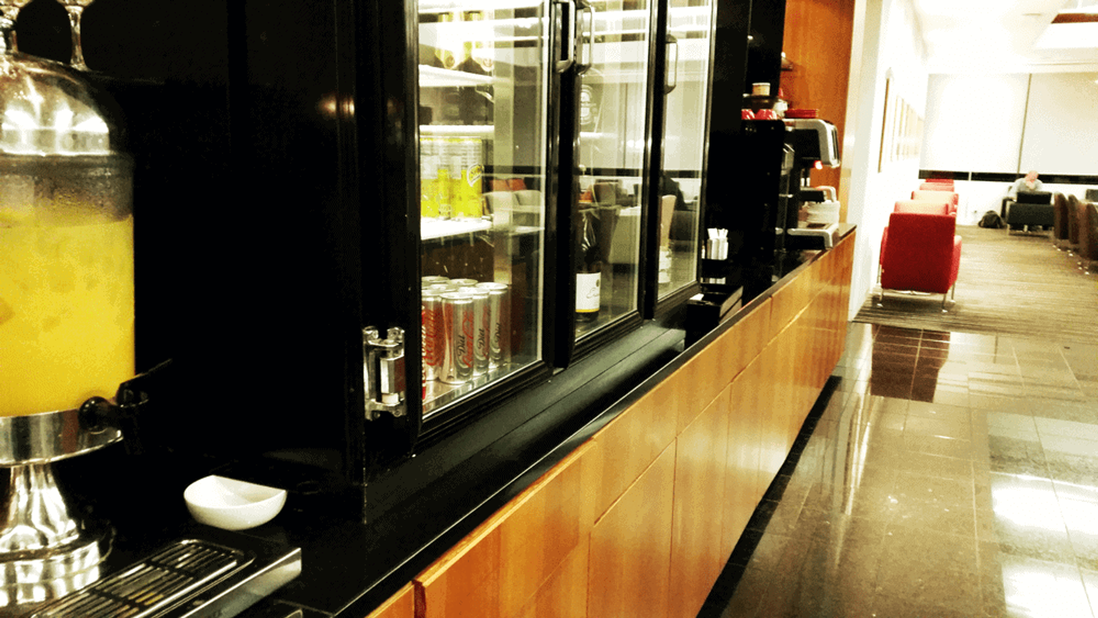 Once you enter trough the check-in area there is a magazine rack on one side and two seating areas with a frosted glass divider. Both seatings nooks are like a mini lounge and have a tv, one playing movies the other is tuned to a news channel. Since it was so early the food available was minimal at the most, all I could find was pancakes, scrambled eggs and averages looking sausages. The bar selection is pretty standard with beers wines and spirits all available.