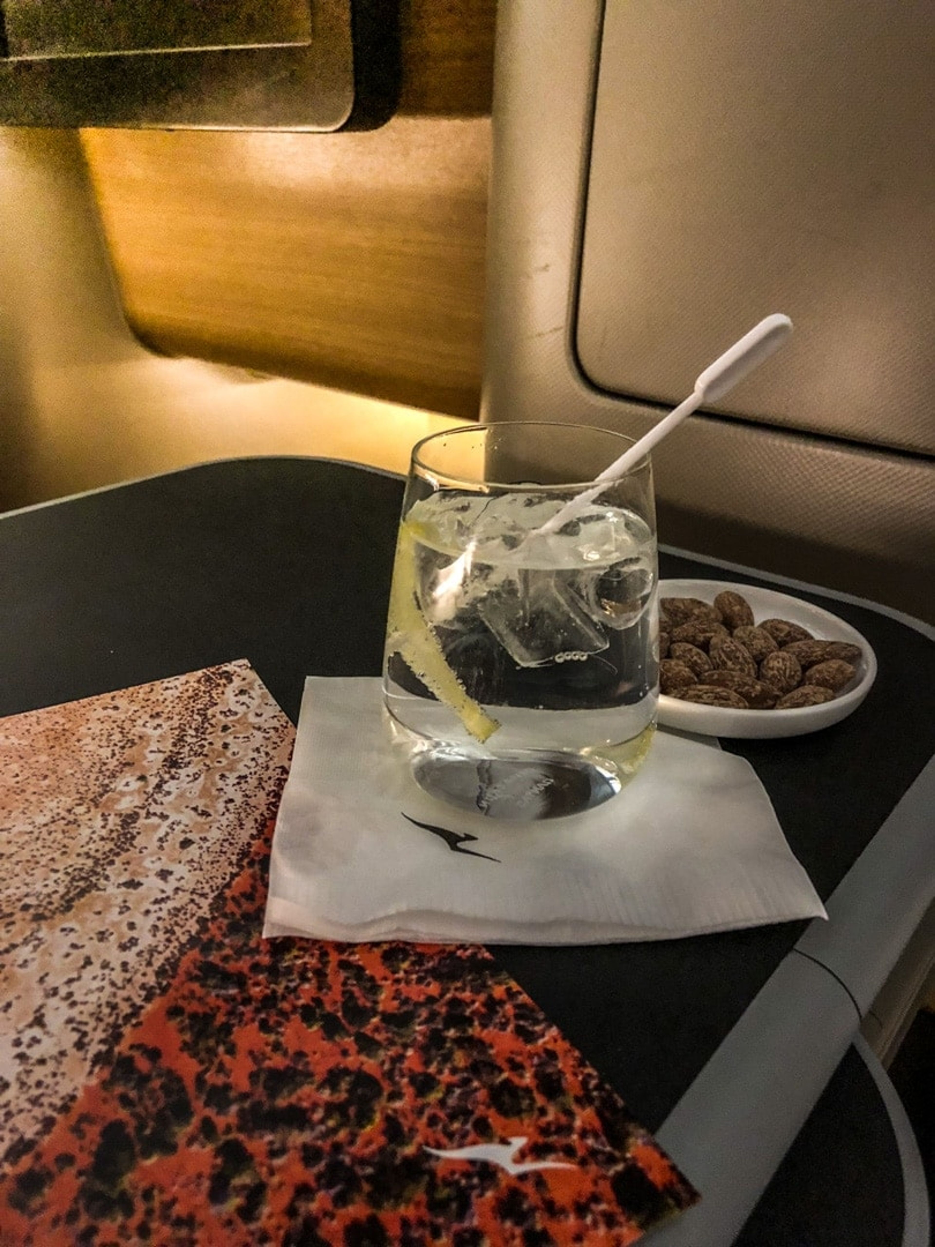 After the seatbelt signs turned off it took Qantas 23:30.43 to offer a drink of choice with some nuts. I opted for a G&T and made some small talk with the lady looking after our aisle, who was lovely.