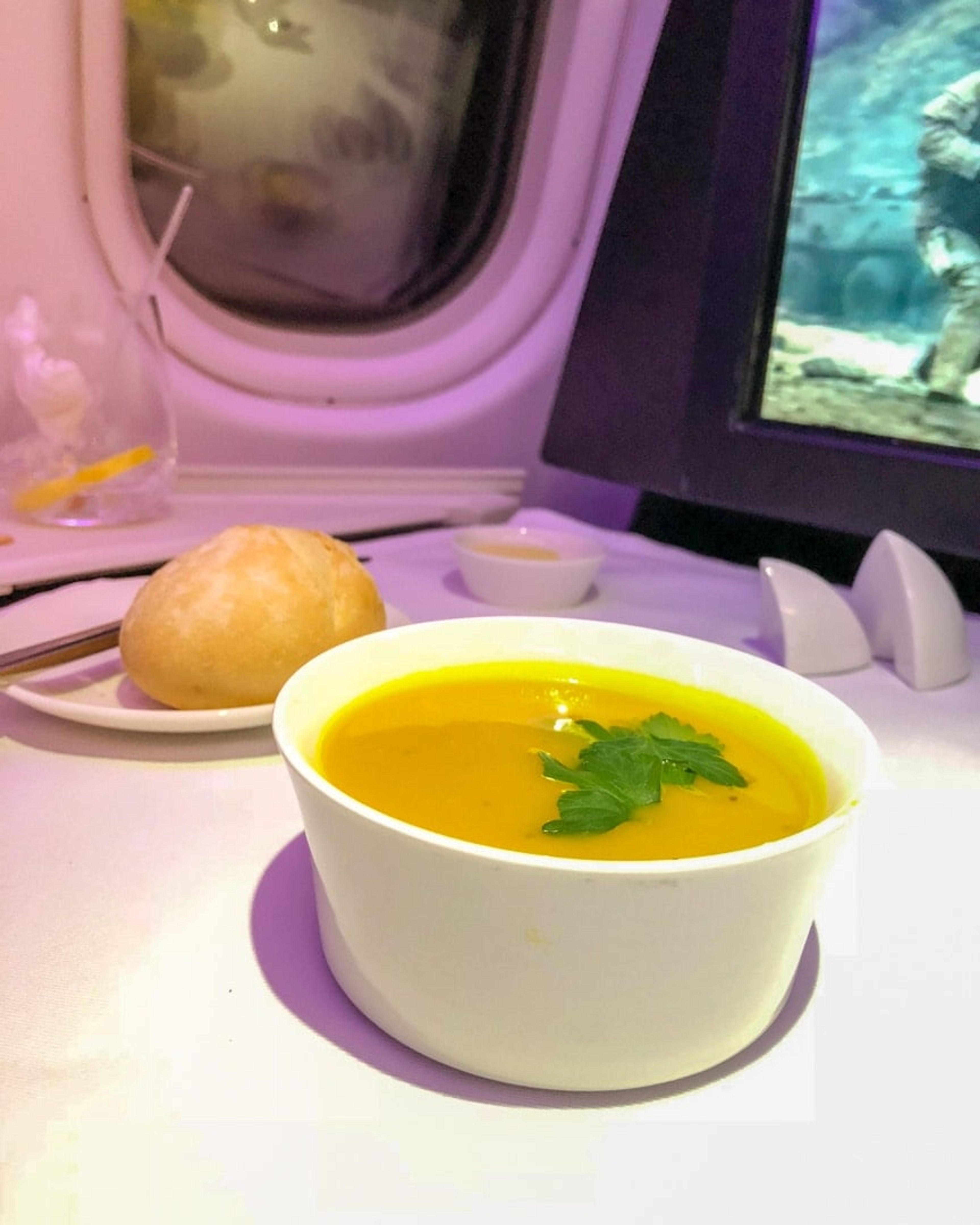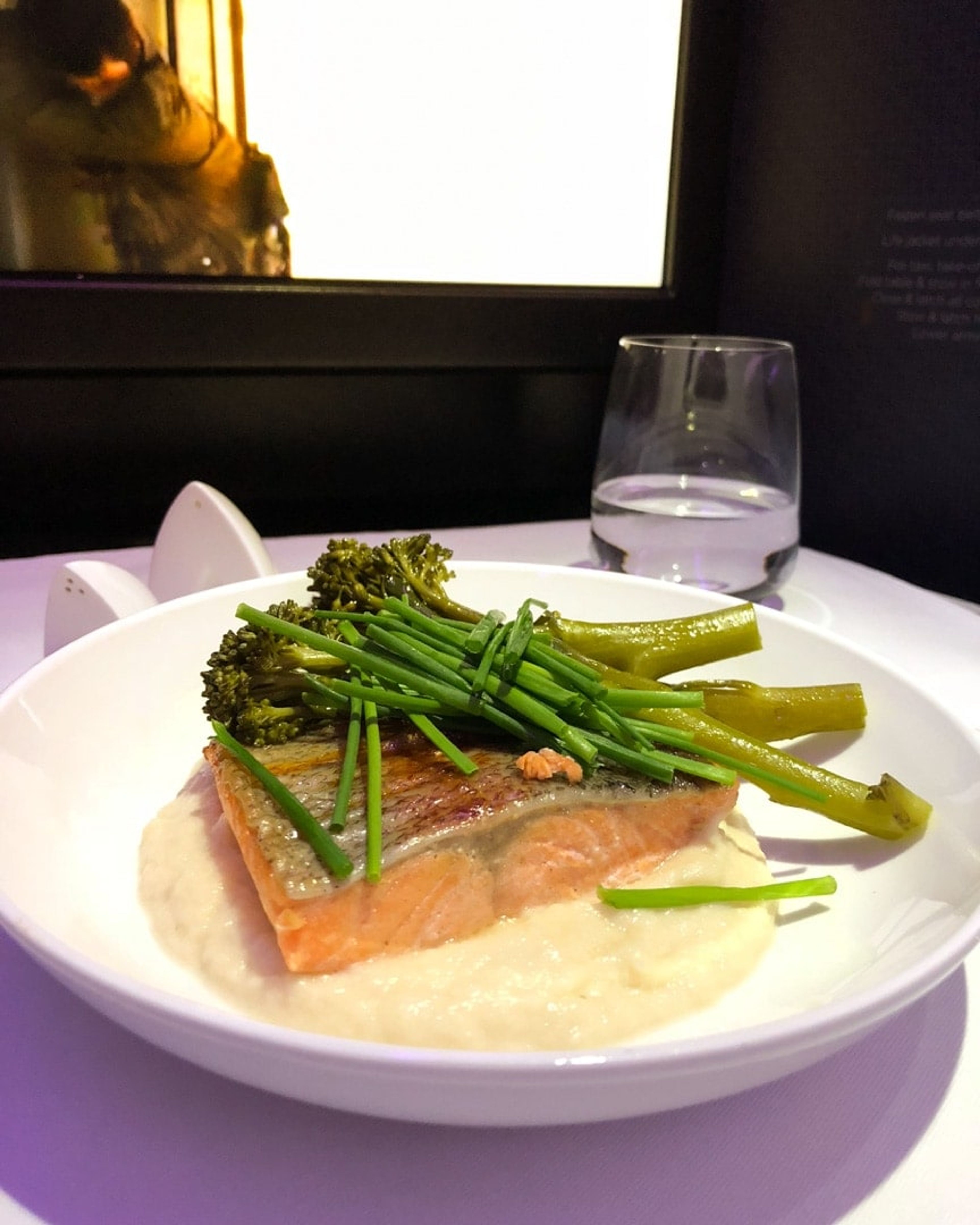 Virgin’s menu had a chicken salad or soup on the menu, considering I was coming down with a cold, I went for the pumpkin, turmeric and saffron soup followed by the Petuna ocean trout with cauliflower puree and broccolini. For dessert I chose the flourless chocolate cake.