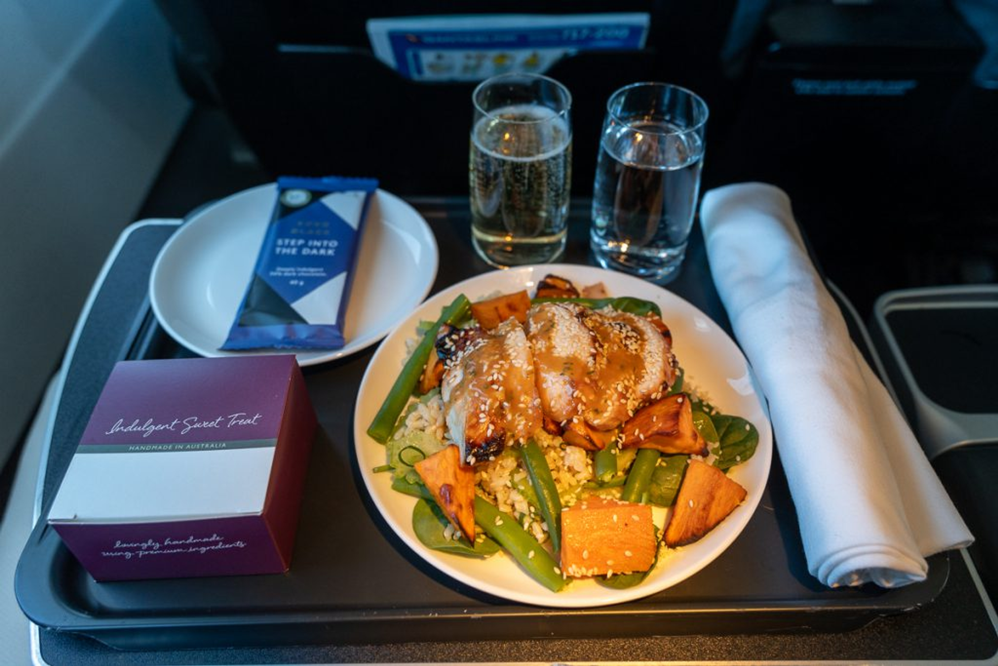 Like on many short flights, there was only one cold meal option, a Chicken Salad with Sesame Dressing. I’m so glad Qantas recently overhauled its domestic catering, which had long been a downfall of the airline’s soft product. There’s only a 30-minute window for service on this flight if the crew are lucky, so I’m surprised to also find a cheesecake and chocolate bar served.