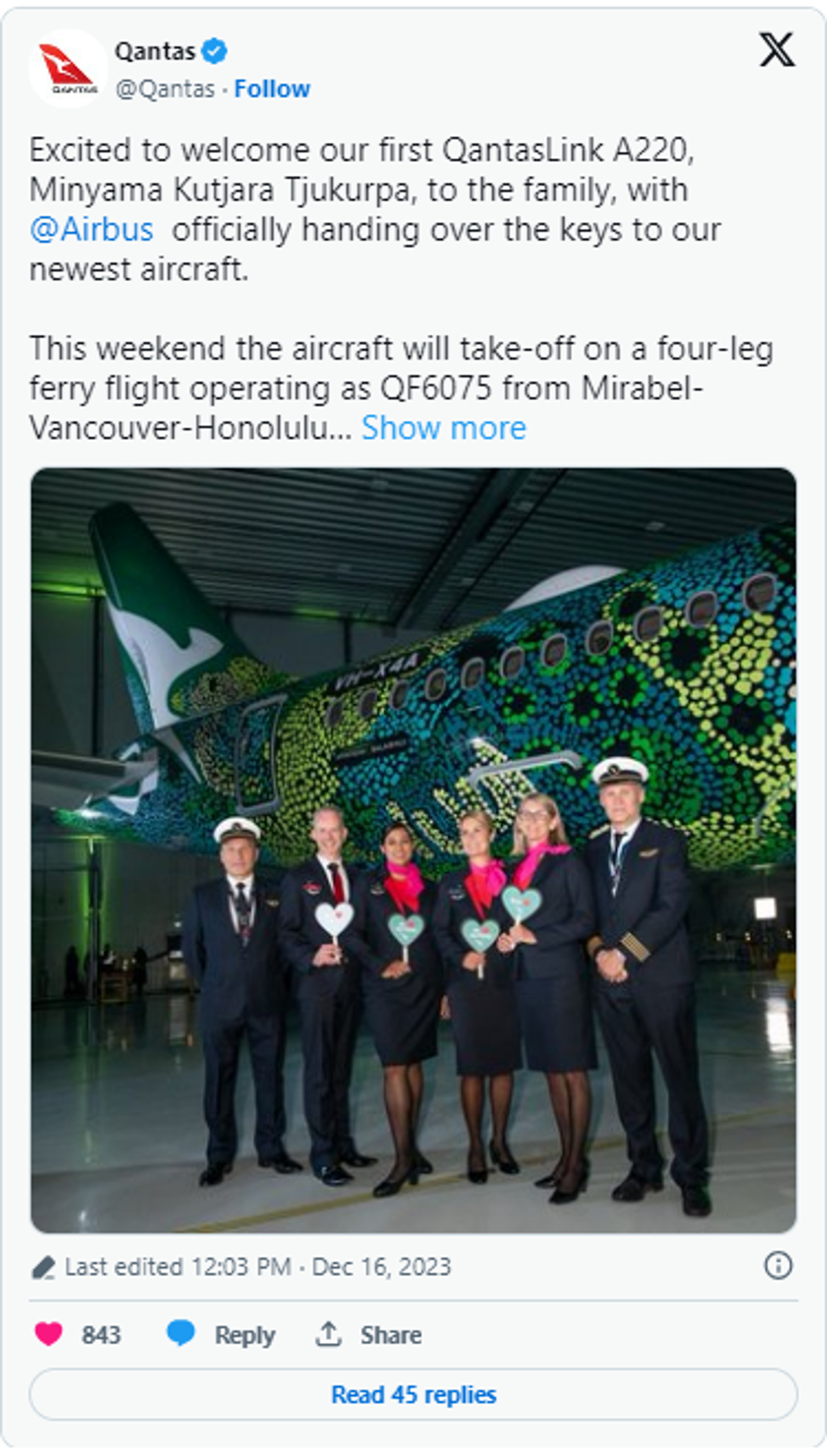 Having already departed Airbus’ Canadian factory, X4A is operating as QF6075 with stops in Vancouver, Honolulu and Fiji. At noon on Wednesday, 20th December, Qantas’ first Airbus A220 is expected to arrive in Sydney as QF6076.