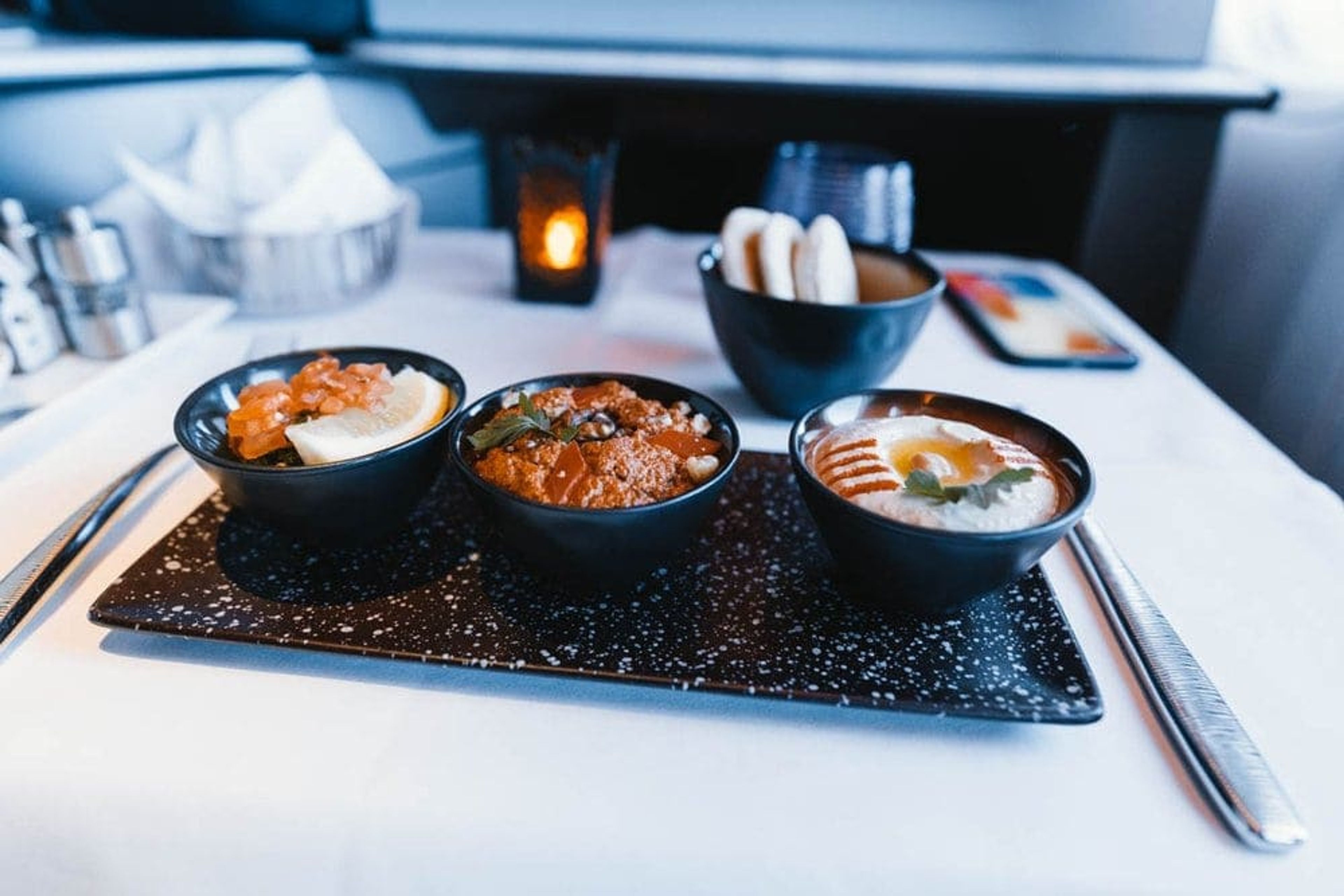 After an excellent lunch (I opted for the Signature Arabic mezze, beef filet and selection of cheese) which was the complete polar opposite of my previous experience, the crew made up the double bed for me, complete with champagne glasses on display and nicely presented pyjamas from The White Company.
