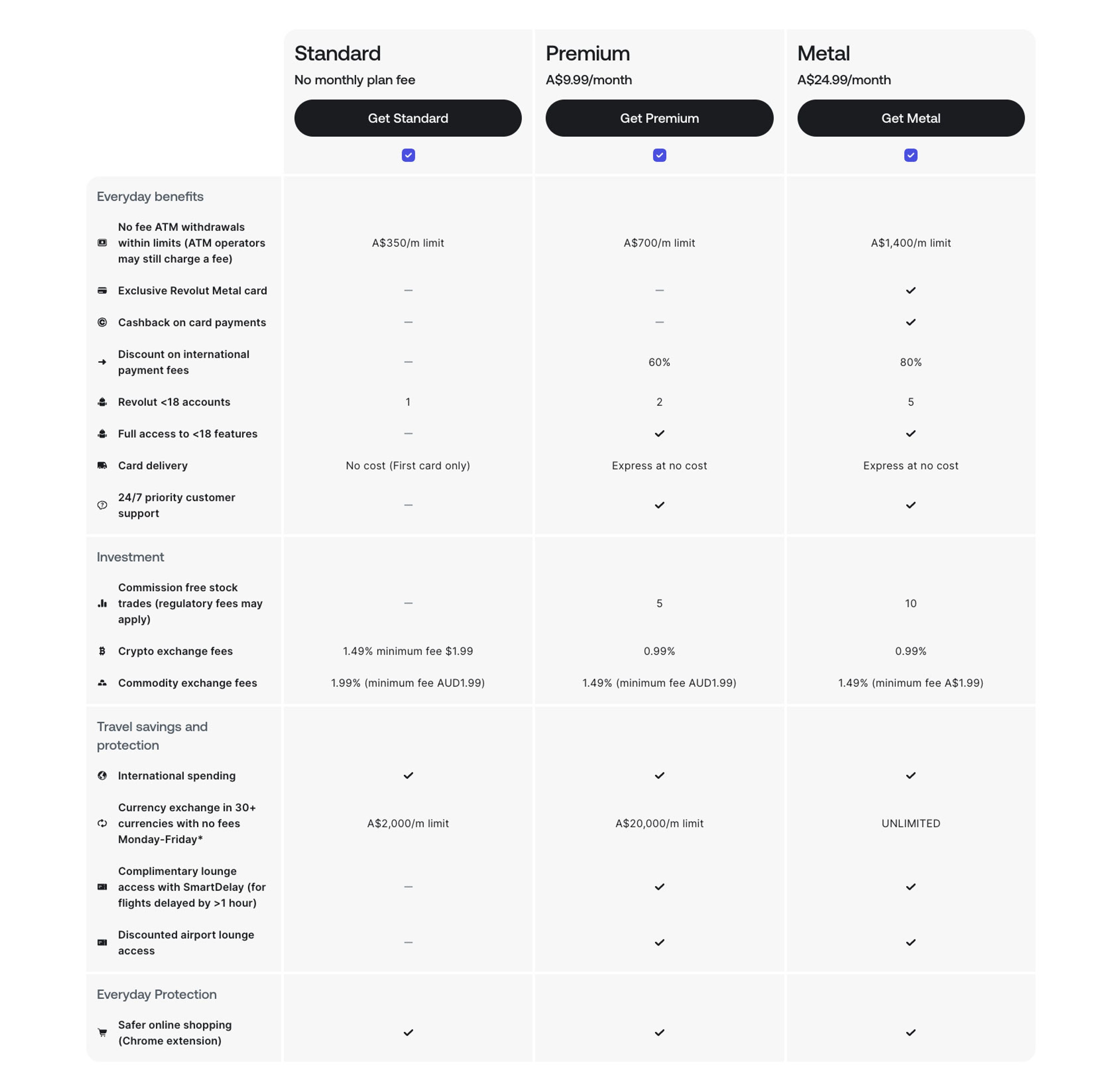 In Australia, there are three Revolut plans available: the free Standard plan, the Premium plan at $10.99 per month, and the Metal plan at $24.99 per month.